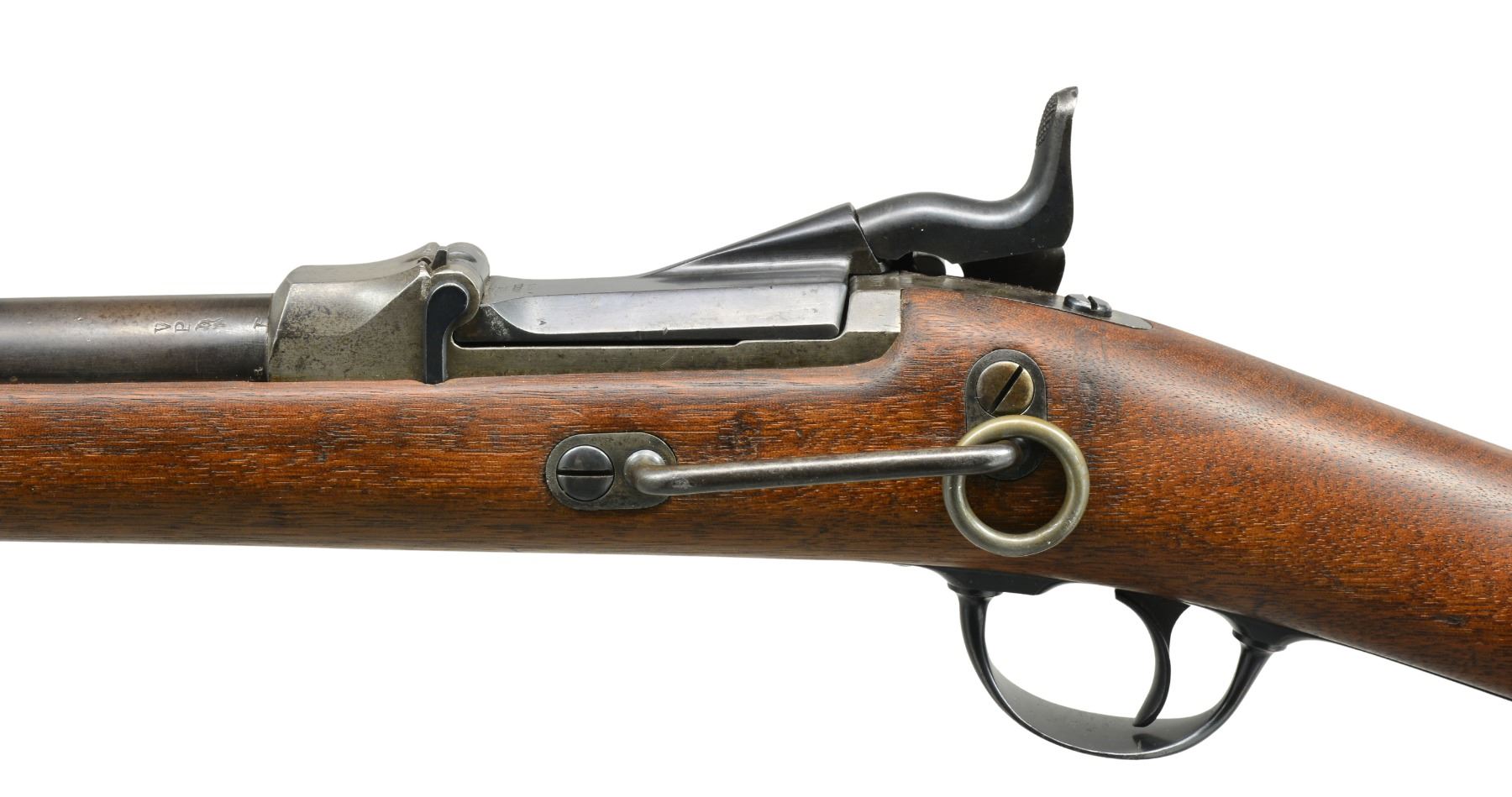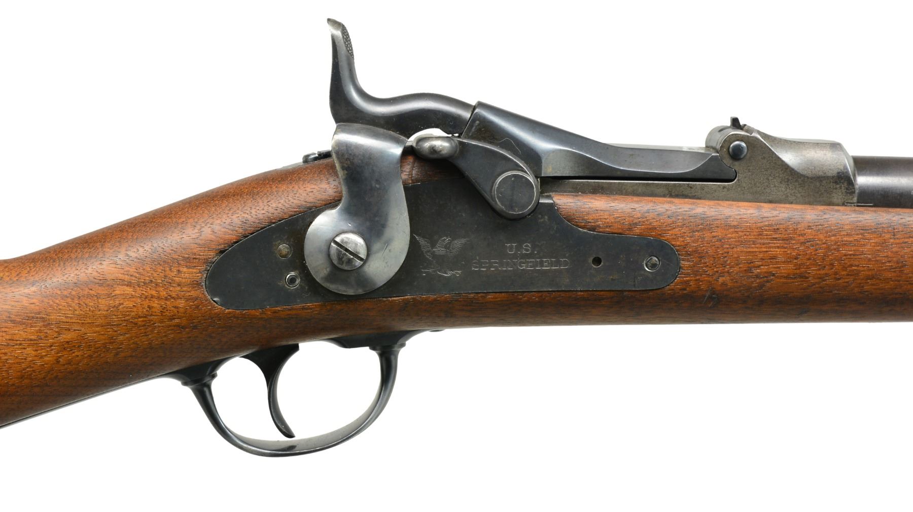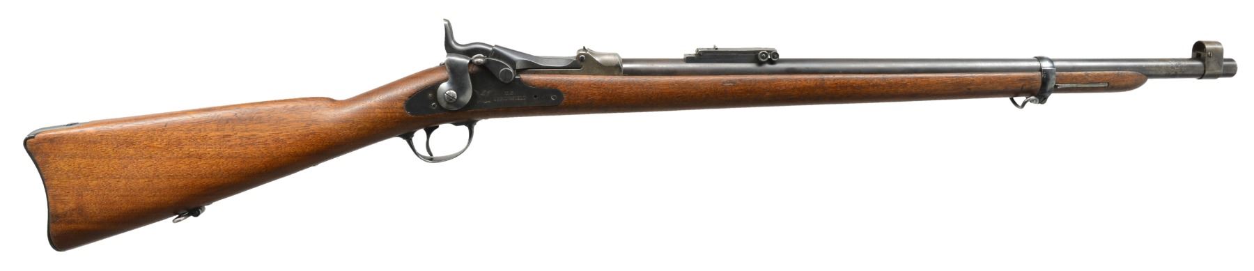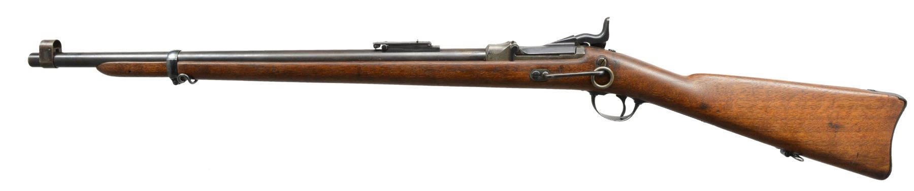 Cal. 45-70. S# 340121. Bbl. 24" rnd. Hooded blade front sight w/ Buffington rear sight. Distinguished by it's nearly full length band fastened stock w/ uncapped tip & unique rounded sling swivel. 1873 Dated low arch breech block. Left side of stock has bar mounted saddle ring. Officially termed the " 24" Barrel Carbine ", only 1,000 were mfg. in 1886. Nearly all were issued to cavalry regiments in the American West. CONDITION: bbl. retains 80% fading blue. Receiver is fading to gray. Breech block, lock, hammer & trigger guard retain over 70% blue. Refinished stock shows a few handling marks. Bore is generally bright w/ moderately worn rifling showing some pitting. (01-17674/DS). ANTIQUE. $4,000-5,000.