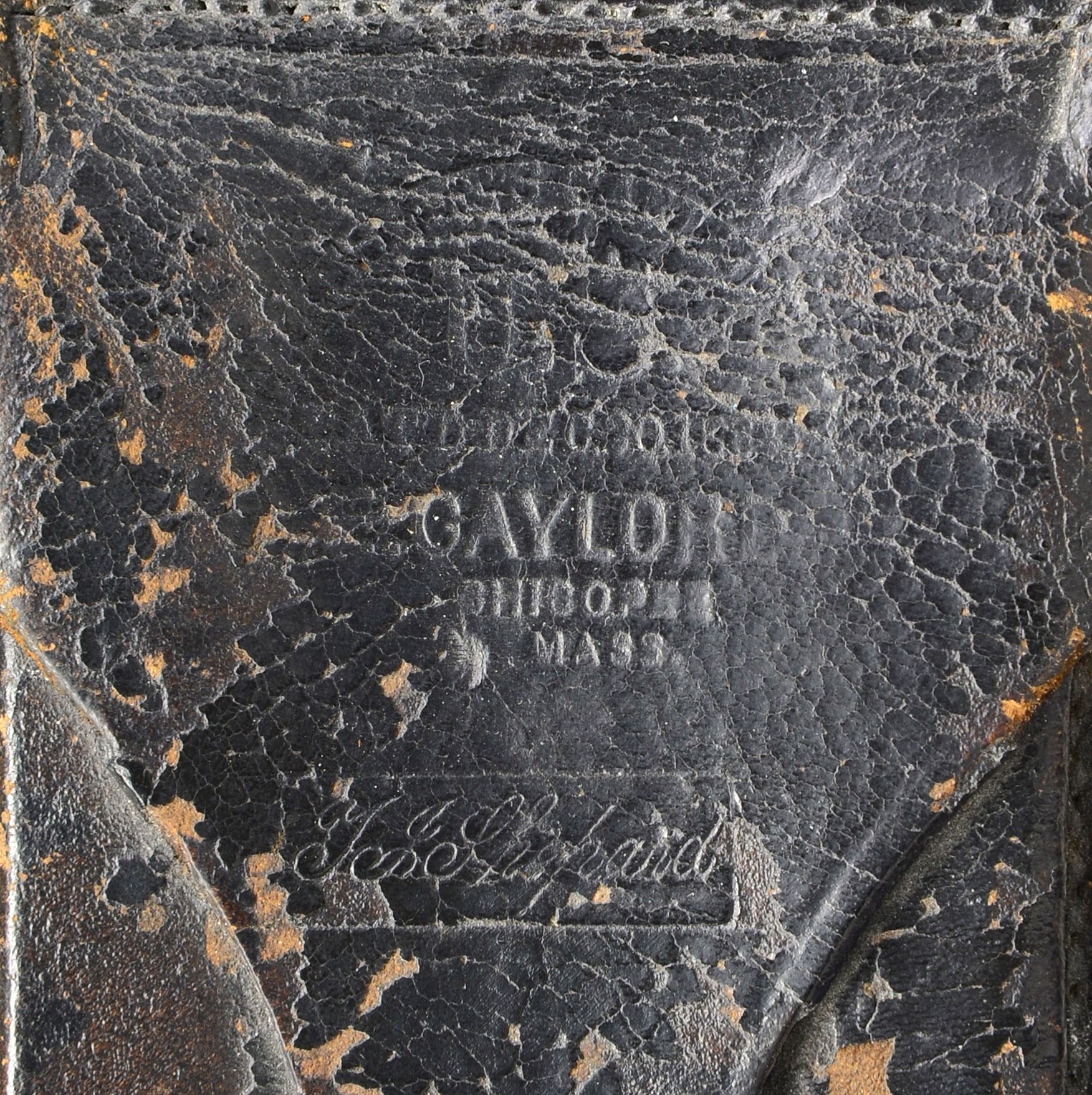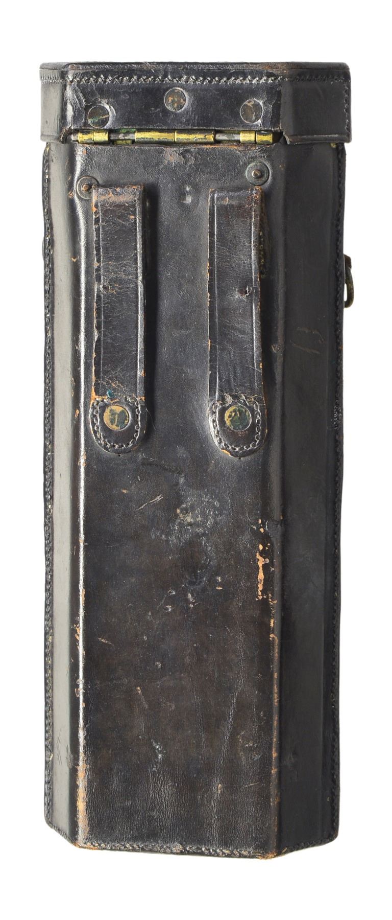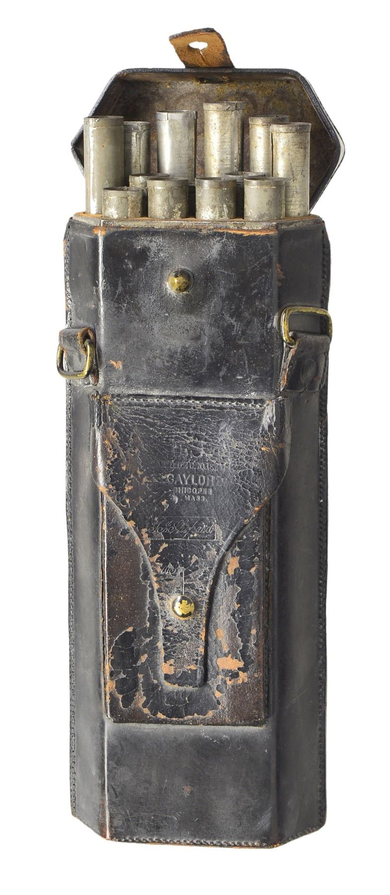 CARTRIDGE BOX. This 91 rd. Blakeslee cartridge box is arguably the rarest American Civil War cartridge box w/ only a few surviving specimens known. It was invented by Col. Erastus Blakeslee who commanded the 1st Connecticut Cavalry during the Civil War. His unit was armed w/ 52 cal. Spencer carbines early in 1864. Blakeslee saw a need to increase the effectiveness of the Spencer carbine by increasing its rate of fire. This box allowed the soldier to load 7 rds. from a tin tube in roughly the time it took to load 1 rd. prior to his invention. The box can be found in 6, 10 & 13 tube variations allowing the soldier 42, 70 or 91 quick loading rds. enhancing the effectiveness & rate of fire. This box was produced by Emerson Gaylord in 1864-1865. The box is embossed on the front "BLAKESLEE'S CARTRIDGE BOX / U.S. / PAT'D DEC. 20.1864 / E. GAYLORD / CHICOPEE / MASS.". It is leather covered wood w/ 13 interior tin tubes. Seams are stitched. There is a front implement pocket w/ leather closing flap & brass finial. The top closing tab is stitched & riveted. Suspension strap rings are also stitched & riveted as are the belt loops on the reverse. CONDITION: box shows light wear overall w/ some crazing & loss of finish on the implement pouch & the top closing tab. (02-12850/BF). $7,000-10,000.