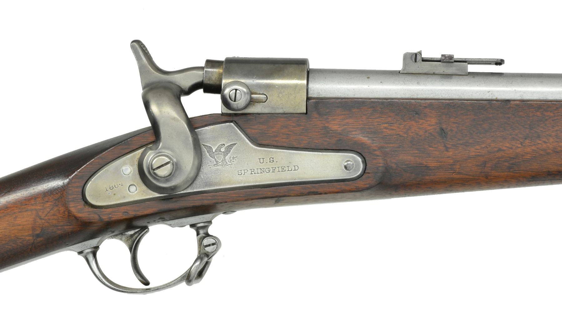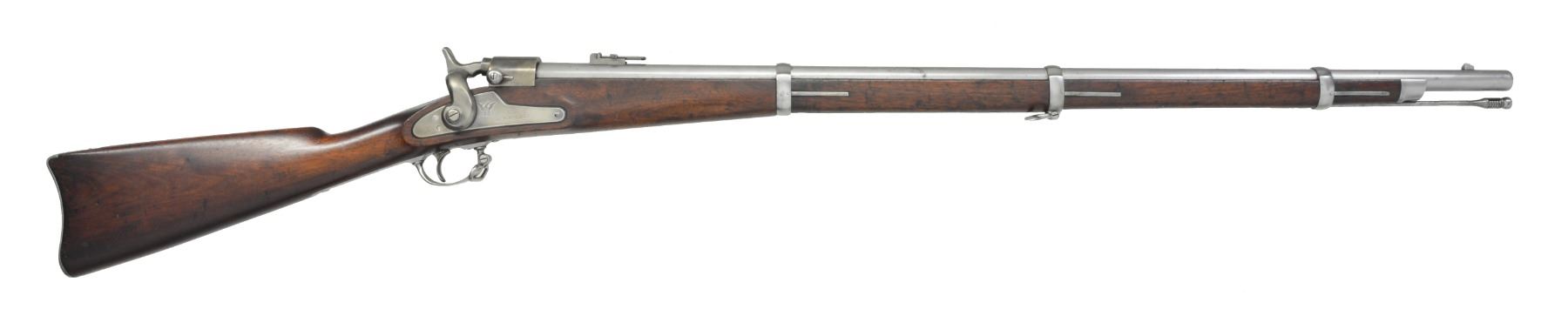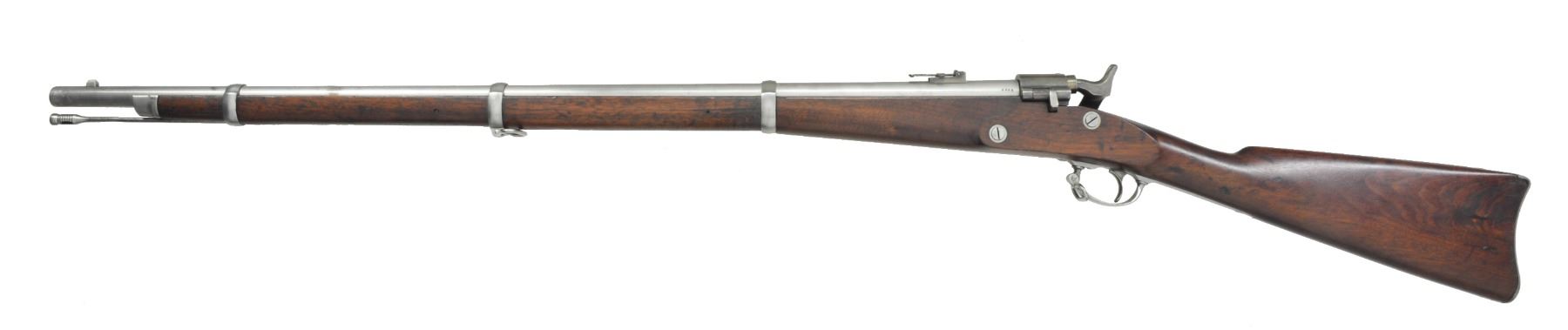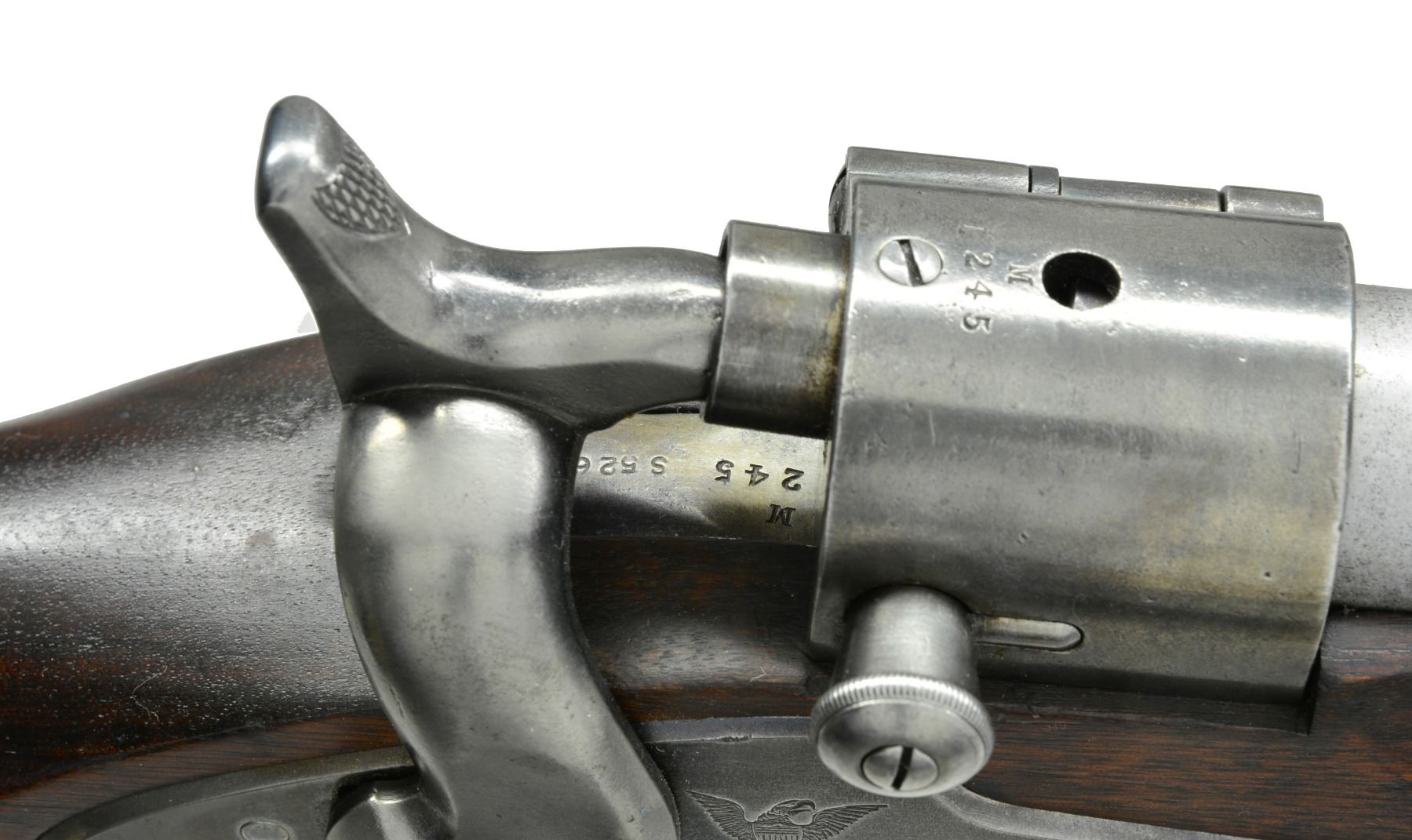 Cal. 56-50. S# 1245. The Springfield Armory converted an unknown quantity of rifle muskets to breechloaders between January & June 1865 that accepted the Spencer 56-50 metallic cartridge. 52" Overall, 35 1/2" rnd. bbl. w/ fixed front sight & adj. rear sight. Utilizes the same breech mechanism as seen on their cartridge carbines. The breech has Joslyn numbers "M / 1245" on breech & tang. The tang & left side of bbl. are also numbered "S526". Lockplate is marked w/ an eagle & "U.S. / SPRINGFIELD" forward of hammer & "1864" rear of hammer. The breech mechanism is marked in 2 lines w/ "JOSLYN'S PATENT" w/ last date being "JUNE 24, 1862". Stock has initials "JB" rear of trigger guard & a cartouche opposite lock. CONDITION: very good overall. Metal has been cleaned & has a gray/bright patina. Mechanics are fine w/ well defined rifled bore. (01-17094/JS). ANTIQUE. $2,000-3,000.