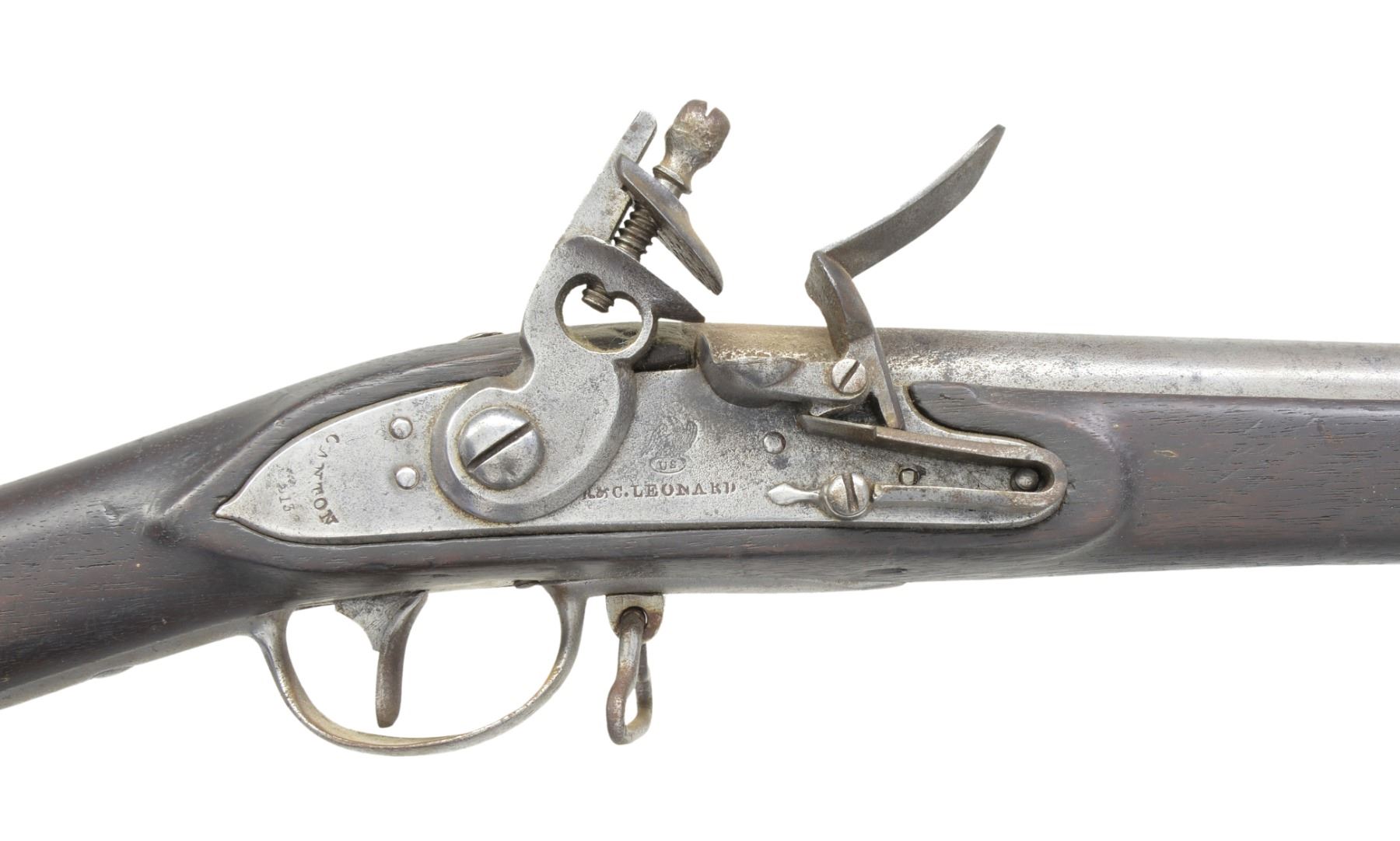 MUSKET. Cal. about 69. NSN. Bbl. 45" rnd. w/ US marking at breech. Lock is marked "R.&C. LEONARD" below eagle & US marking ahead of hammer "CANTON 1813" marked behind hammer. 3 Band walnut stock w/ iron fittings. Trumpet tipped iron ramrod. UNATTACHED ACCESSORIES: signed letter from Lt. Col. Brophy's daughter regarding this lot. CONDITION: metal has cleaned gray appearance w/ general pitting becoming heaviest in breech area. Stock has dark worn appearance w/ numerous dents & handling marks having sm. chips & cracks around lock, tang & sideplate areas. Left ear has partially visible cartouche. Dark pitted bore. Lock has extremely tight spring tension & will not fire normally. PROVENANCE: From the collection of Lt. Col. William S. Brophy. (01-16916/DS). ANTIQUE. $1,000-1,500