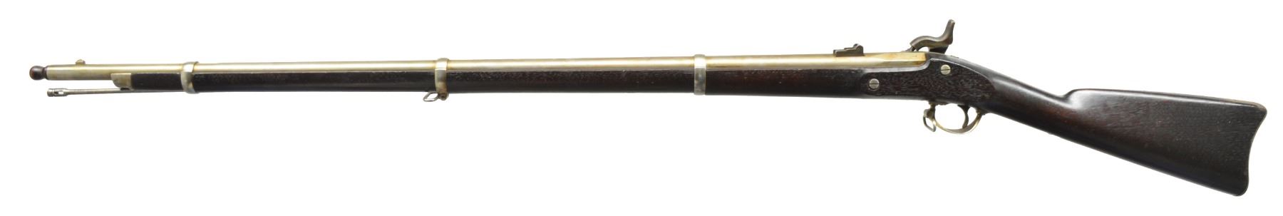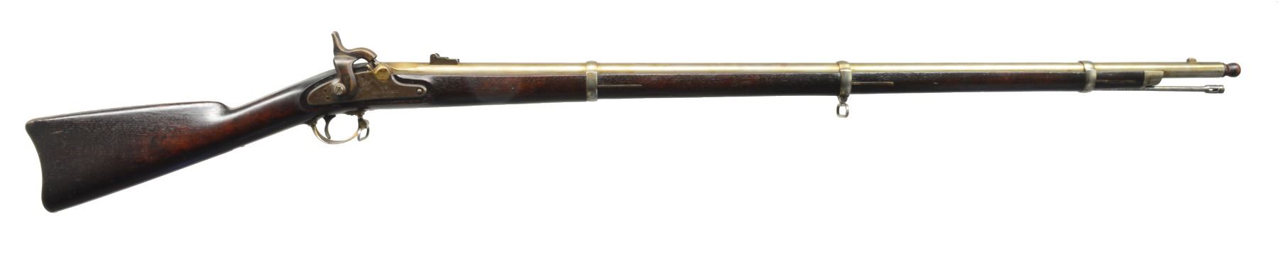 MUSKET. Cal. 58. NSN. This is an exemplary example of the last year of production of Civil War musket technically known as a model 1863 Type II. Lock marked w/ eagle, "U.S. / SPRINGFIELD" forward of hammer & “1864” on tail. 40" Bbl. rifled w/ three lands & grooves, dated 1864 on top flat, "V P" & eagle head on the left breech flat, bolster has eagle stamped. Stock has two crisp inspector's cartouches & U.S. surcharge on buttplate. UNATTACHED ACCESSORIES: original wood tampion. CONDITION: overall fine to very fine, barrel & mts. are bright gray w/ staining, original & complete w/ correct single leaf rear sight, knurled & slotted ramrod. Lock is smooth & overall gray, hammer retains most of its original case colors. Stock retains some raised grain, crisp cartouches, good edges w/ many sm. storage dings, scratches & dents. Mechanically crisp w/ brilliant shiny mirror like rifled bore. (01-17451/JS). ANTIQUE. $2,000-3,000.