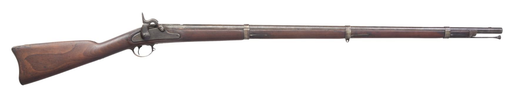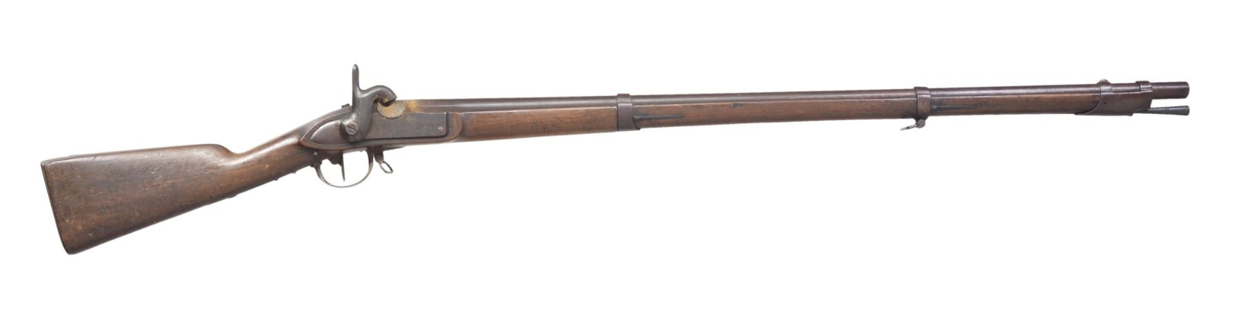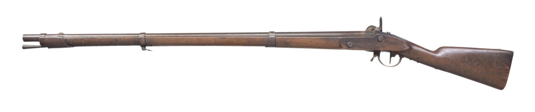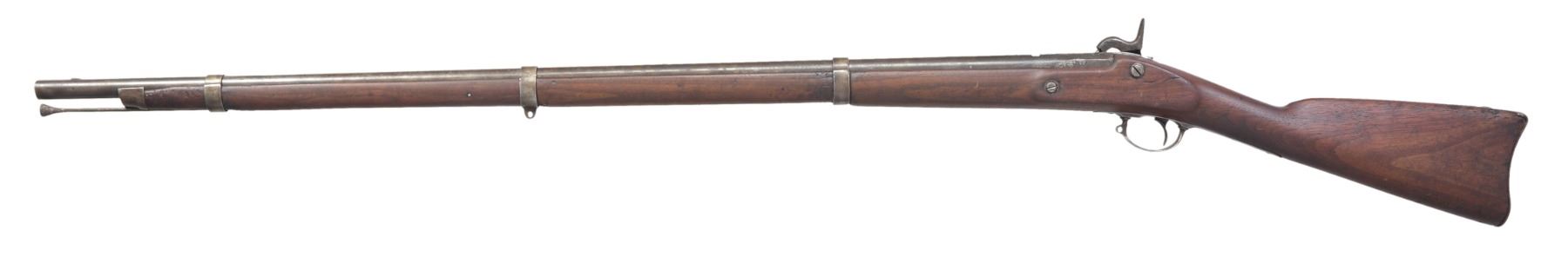 1) 1863 DATED BRIDESBURG MODEL 1861 RIFLE MUSKET. Cal. 58. NSN. Standard configuration w/ 40" bbl., 3 flat bands. CONDITION: good overall. Good lock markings. Bbl. missing rear sight & front sight is partially gone. Ramrod is replacement, missing both sling swivels. Stock is refinished w/ no discernible cartouche. Metal is overall mottled brown w/ pitting especially at breech, mechanics are fine with good rifled bore. (01-17170/JS). 2) GERMANIC 75 CALIBER MUSKET SURCHARGED OHIO IN STOCK. Cal. 75. NSN. 37 3/4" Smoothbore bbl. CONDITION: good to very good overall. Appears all original & complete with exception of bbl. that has been cut. Mechanics fine w/ clear smooth bore. Originally bbl. was about 3" longer, but has been cut a long time ago. PROVENANCE: From the Estate of Ronald A. Katchuk. (01-17171/JS). BOTH ANTIQUE. $800-1,200.