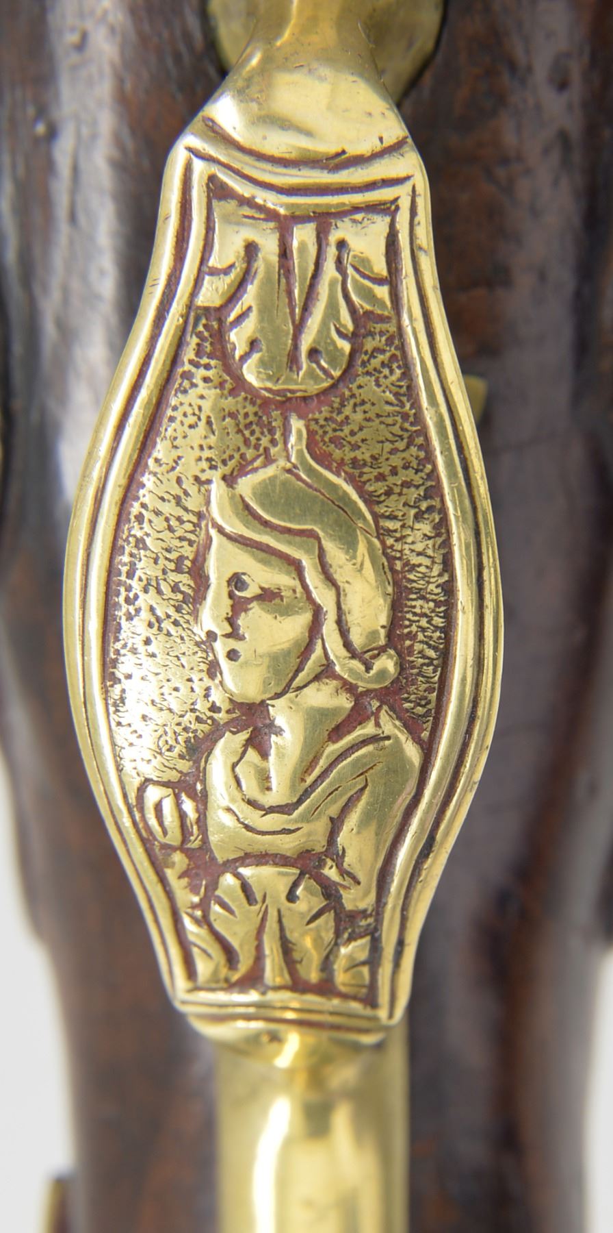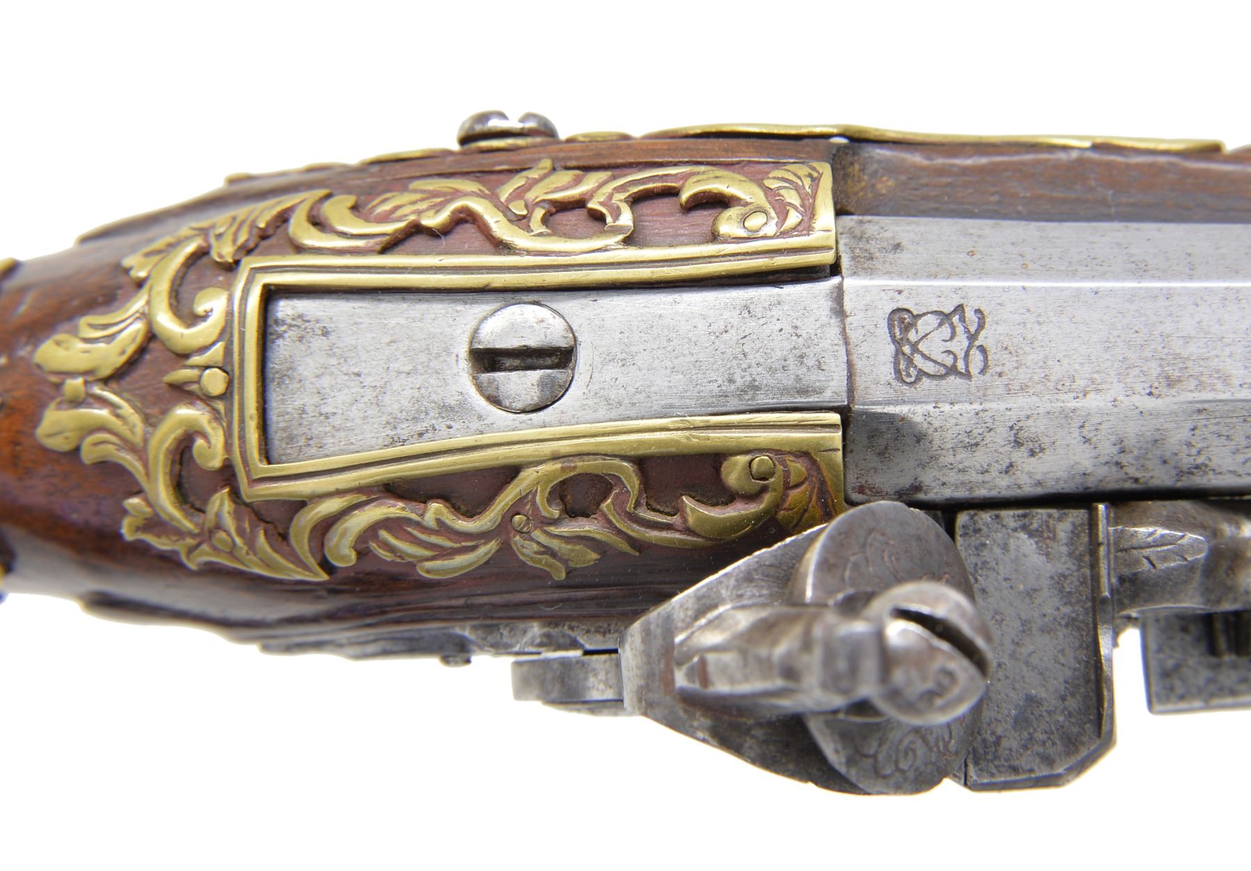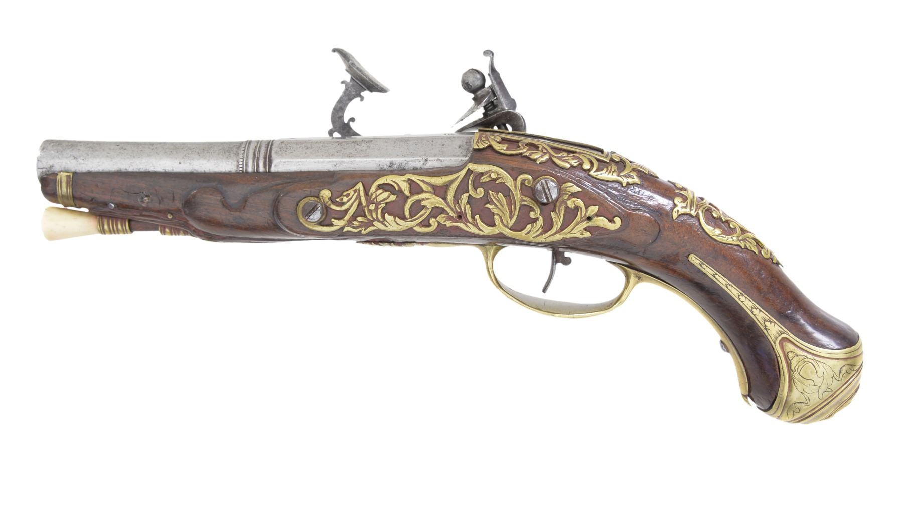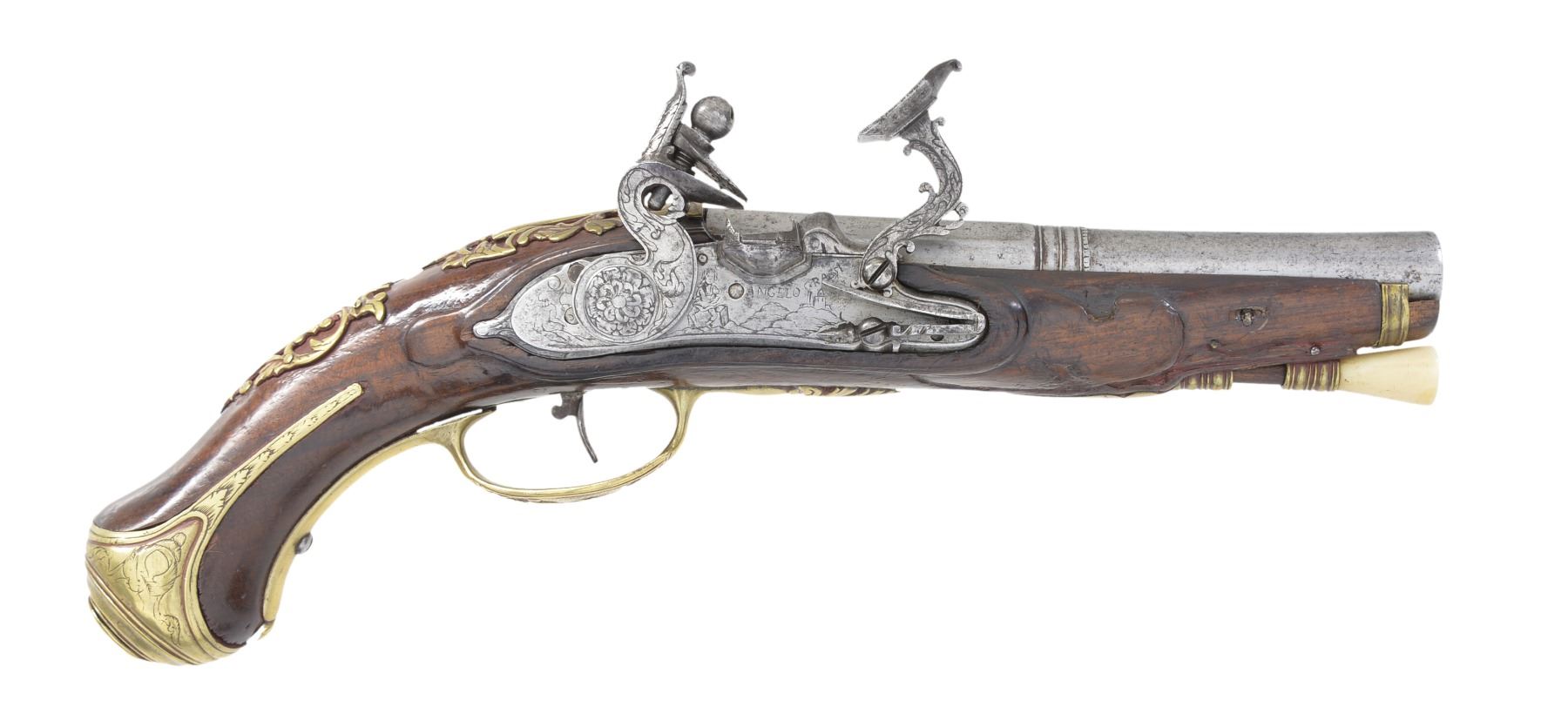 PISTOL. Cal. 52. NSN. Bbl. 5 3/4" w/ oct. shank & faceted transition for rnd. forward portion w/ slightly flared muzzle. Smooth bore. Engraved iron hammer, frizzen & lockplate. Lock is marked "ANGELO GRASSI" (Tascana, Italy). Pinned fastened walnut stock w/ ornate brass trigger guard & buttcap. Wrist, top tang & sideplate areas are ornamented w/ pierced brass overlays. Bone tipped ramrod held w/ faceted brass thimble & single pipe. CONDITION: cleaned gray metal showing light pitting. Stock shows wear w/ heavy gouges & handling marks. Hammer will not hold in cocked position. Dark pitted bore. (01-17049/DS). ANTIQUE. $600-900.