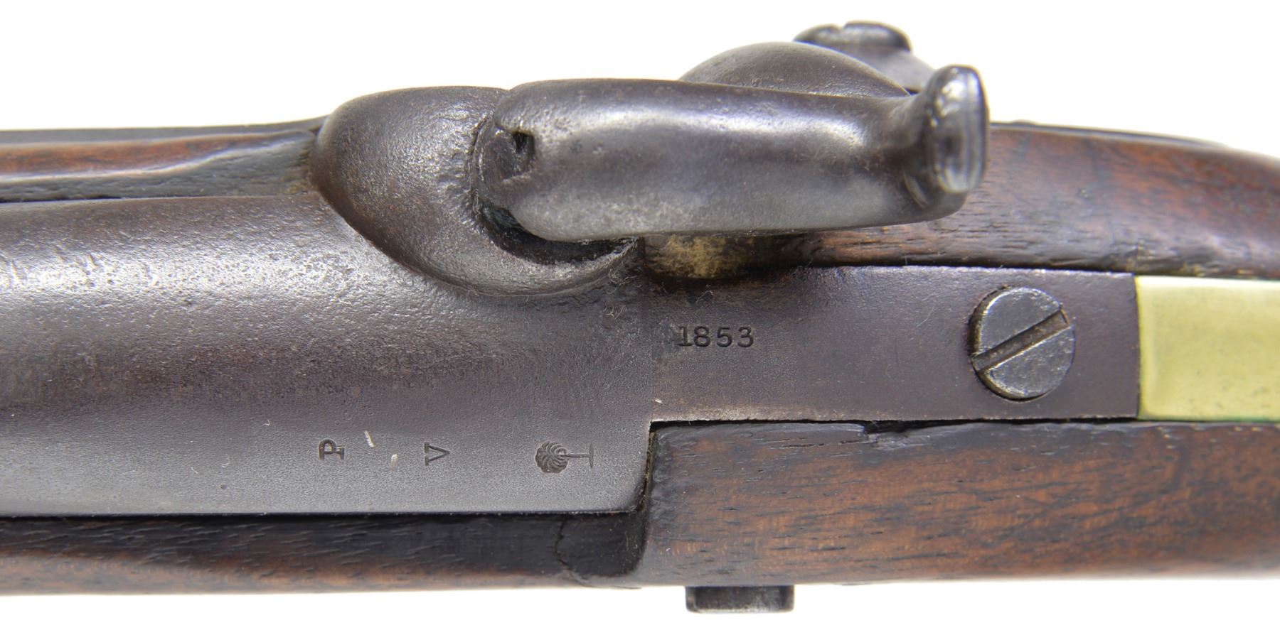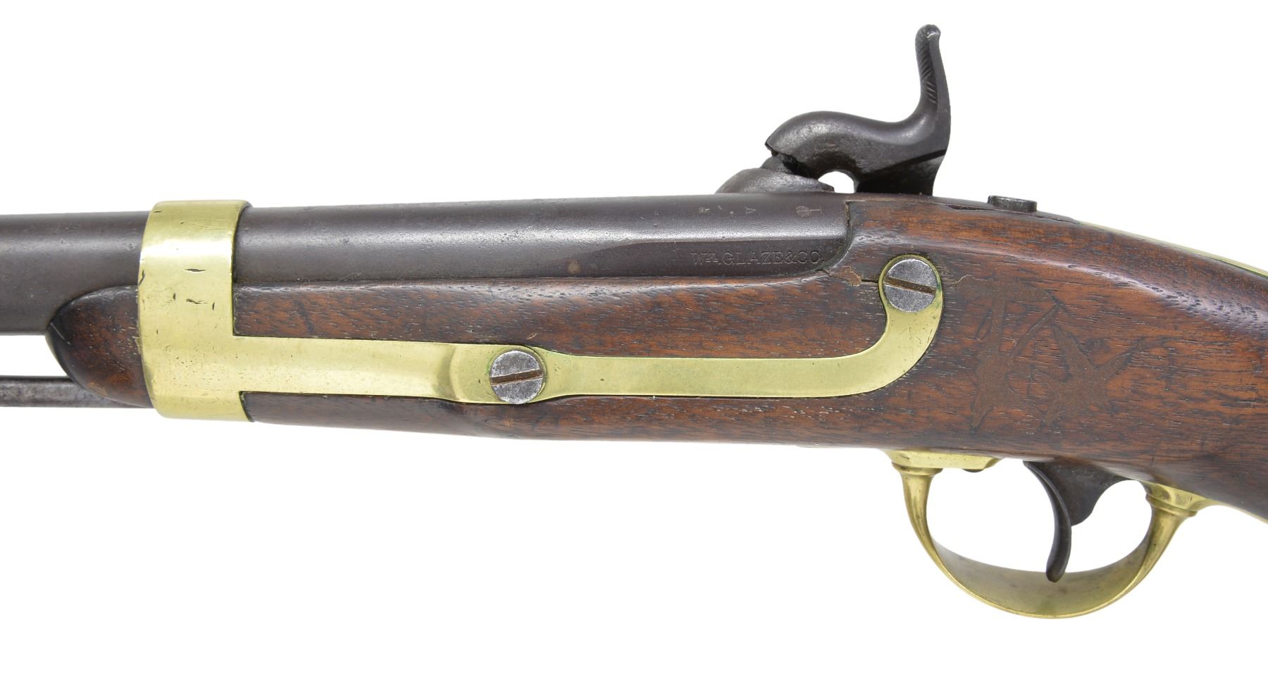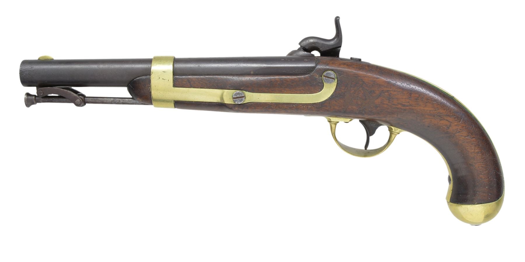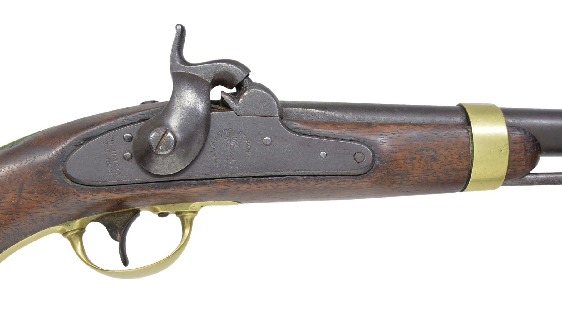 Cal. 54. NSN. Model 1842 Palmetto pistols are considered secondary Confederate arms. This gun is correct in configuration. Bbl. & lock markings appear to be of correct style “WM GLAZE & CO” & proofs “P / V / Palmetto tree” on bbl. & "PALMETTO ARMORY SC" circling Palmetto tree & "COLUMBIA / SC 1852" on lock. This gun however, is an early fake. Bill Albaugh commented in some late 1940s correspondence that he has seen "clever fakes" being sold of this pistol. Excellent articles written about these pistols appear on pg 19 of the January, 1962 American Rifleman by Harry Knode & in the journal of The American Society of Arms Collectors, issue 74, pgs 74-80, by Peter A. Schmidt. CONDITION: good to very good overall. Iron has dark brown patina w/ light pitting, as does lock, markings are crisp & well defined. Brass has light mustard patina. Mechanically fine w/ good smooth bore. (01-17234/JS). ANTIQUE. $800-1,200.
