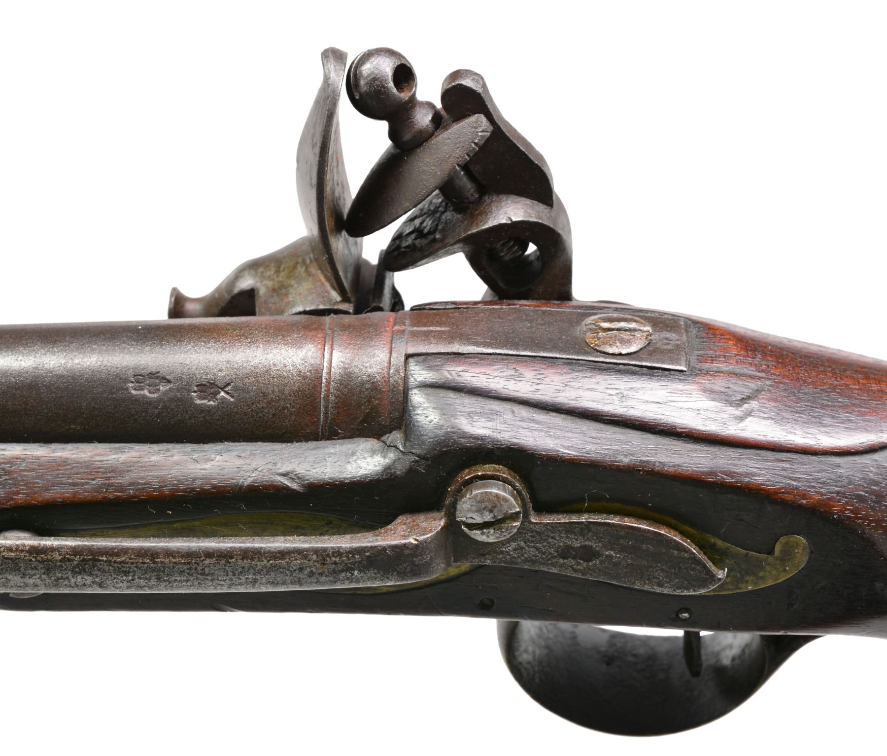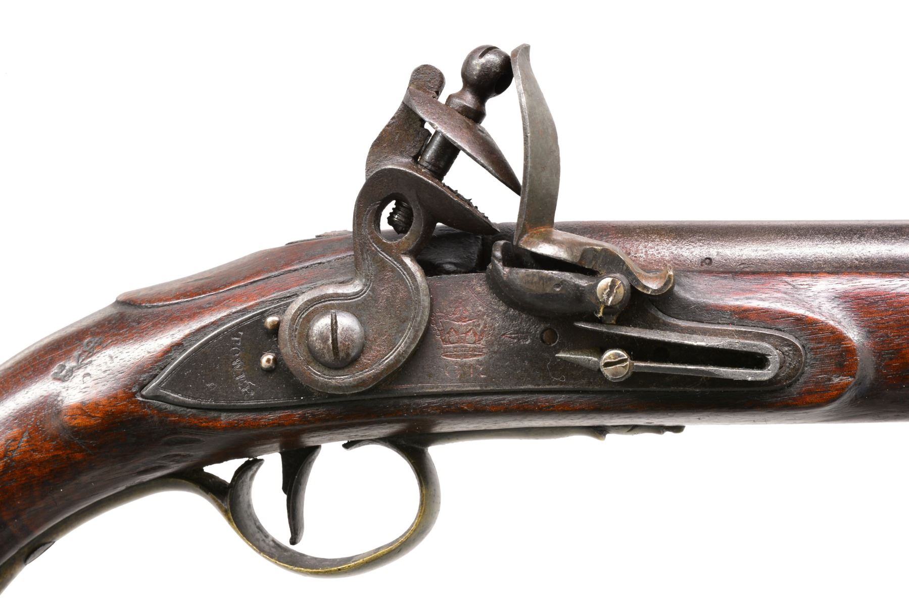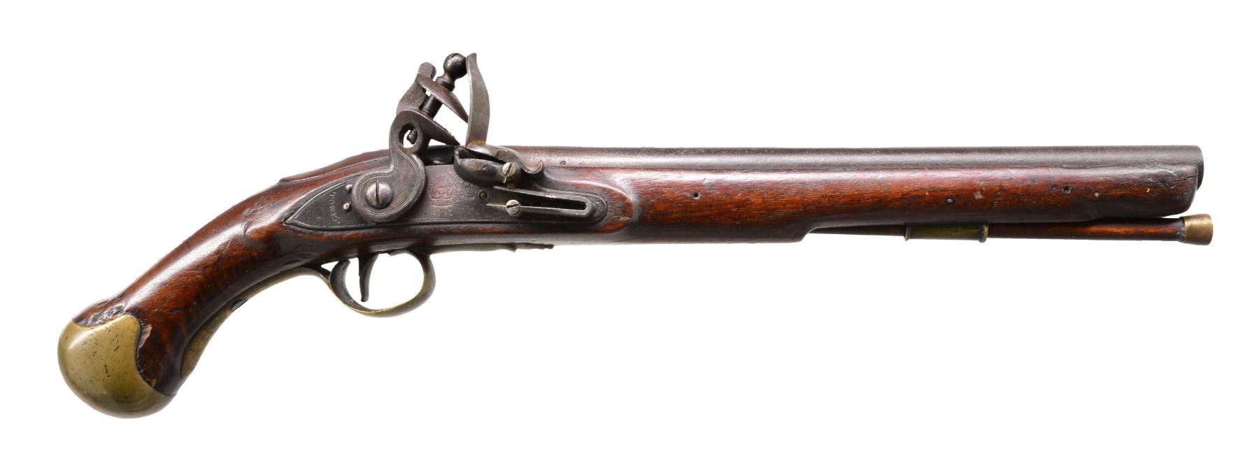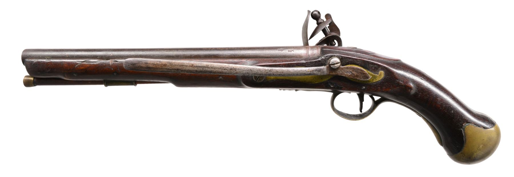 SERVICE FLINTLOCK PISTOL. Cal. 28 Bore (approx. 55 cal.). NSN. This is among the more elegant patterns of Revolutionary War era pistols. Long & sleek at 19" overall w/ 12" bbl. having British military proofs on left side of breech. Lock marked w/ crown & "GR" cipher w/ broad arrow proof forward of cock plus "TOWER" rear of cock. Sm. proofs also appear on stock & base of 8" belt hook. CONDITION: good to very good overall. Appears original w/ frizzen & frizzen spring screw restored. Stock is sound & solid, as are brass mounts w/ medium mustard/olive patina. Mechanically functional w/ clear smooth bore having pitting. (01-17237/JS). ANTIQUE. $3,000-4,000.