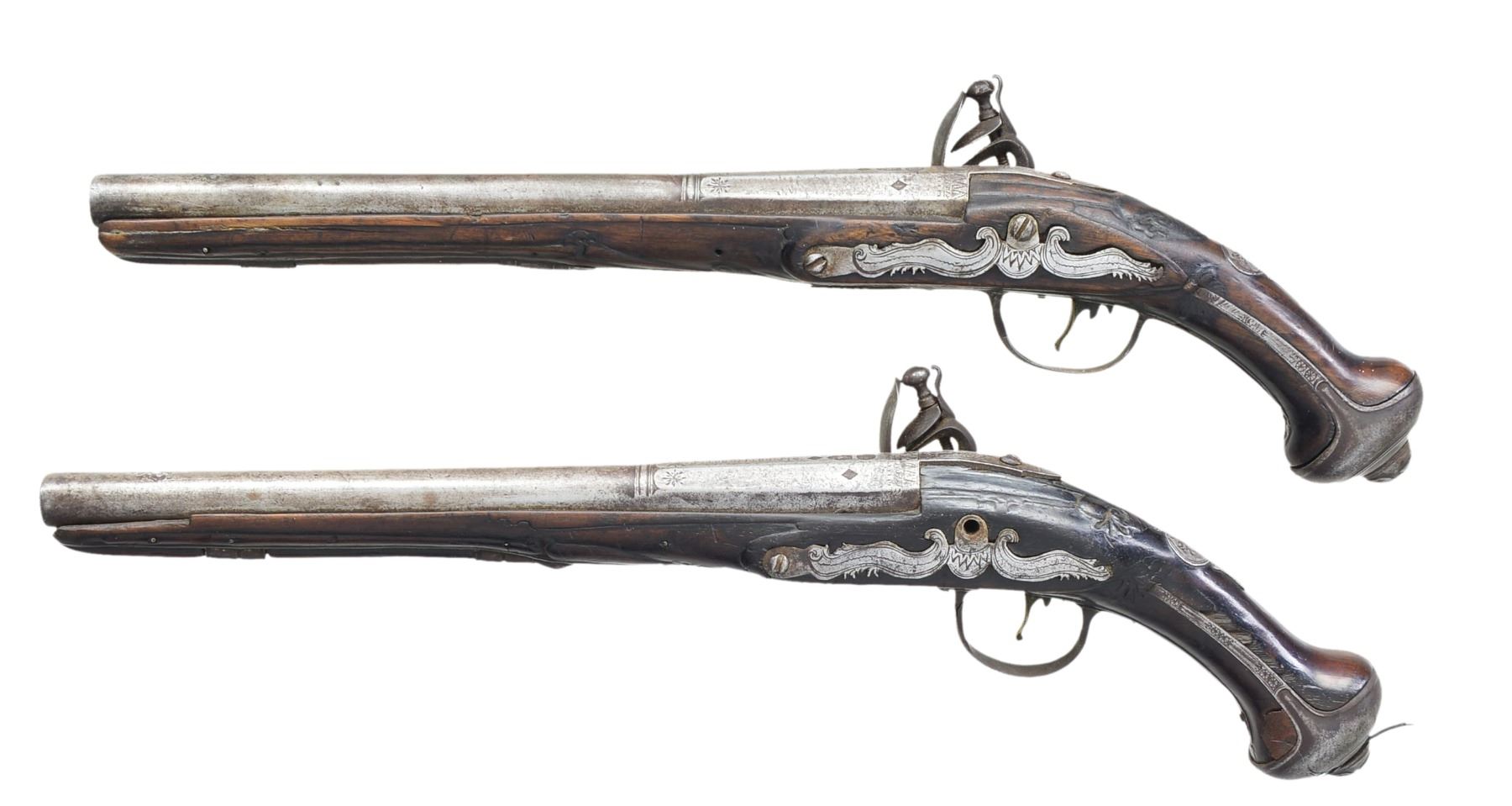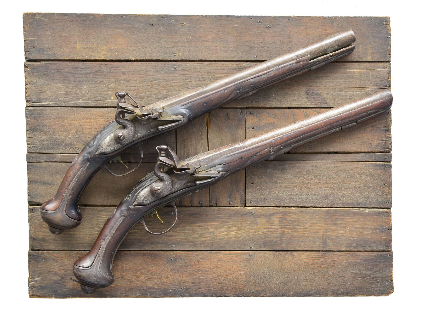 PISTOLS BY NORRT NORRTN WITH OLD WOODEN DISPLAY BOX, CIRCA 1795. Cal. 65 Bore. NSN. Bbls. 12 1/4" oct. to rnd. engraved "NORRT NORRTN" on top flat in front of 2 poincons w/ initials flanked by 3 fleur di lis stamps in diamonds. There appears to be some script initials on tangs. Round bodied flintlocks have rounded pans & friction bridled frizzens & springs w/ fancy filed finials. Round bodied serpentine cocks & lockplates engraved w/ sprigs of acanthus scroll. Trigger plates & triggers are brass. Pistols are iron mounted w/ shaped & engraved trigger guards, sideplates, heavy spurred grip caps & crest plates at tops of grips. Stocks extend to muzzles that are somewhat relief carved. False carved in ramrods are in file decorated pipes. UNATTACHED ACCESSORIES: old carpenter made oak box w/ black velvet lining in top & gold velvet in bottom. CONDITION: fair. All iron surfaces show cleaning over light overall pitting. Stocks have some cracks & repairs; one gun has chipping & in-fill at left grip. This pistol is missing one lock screw. The other pistol has 2 1/2" x 3/8" piece missing at right muzzle. Display box is good. Heer lists Norrt working in Estonia ca. 1790-1800. (01-17375/MGM63). ANTIQUE. $1,500-3,000.