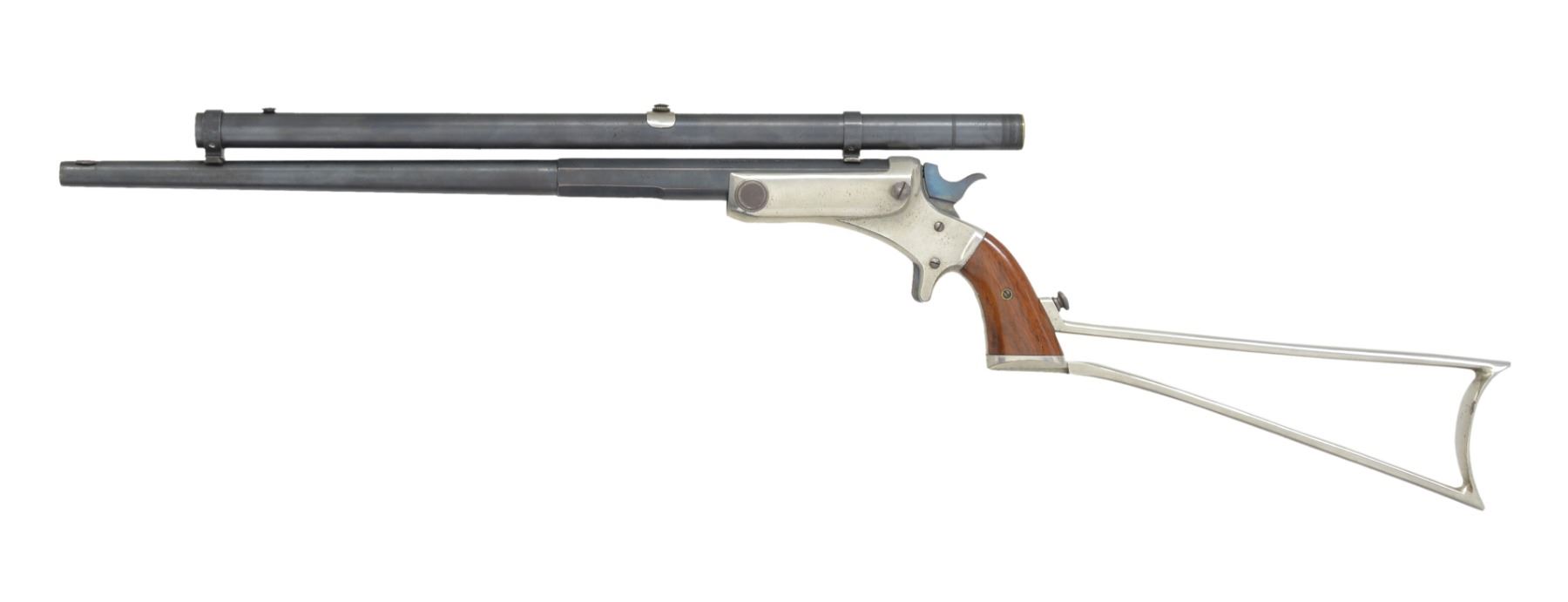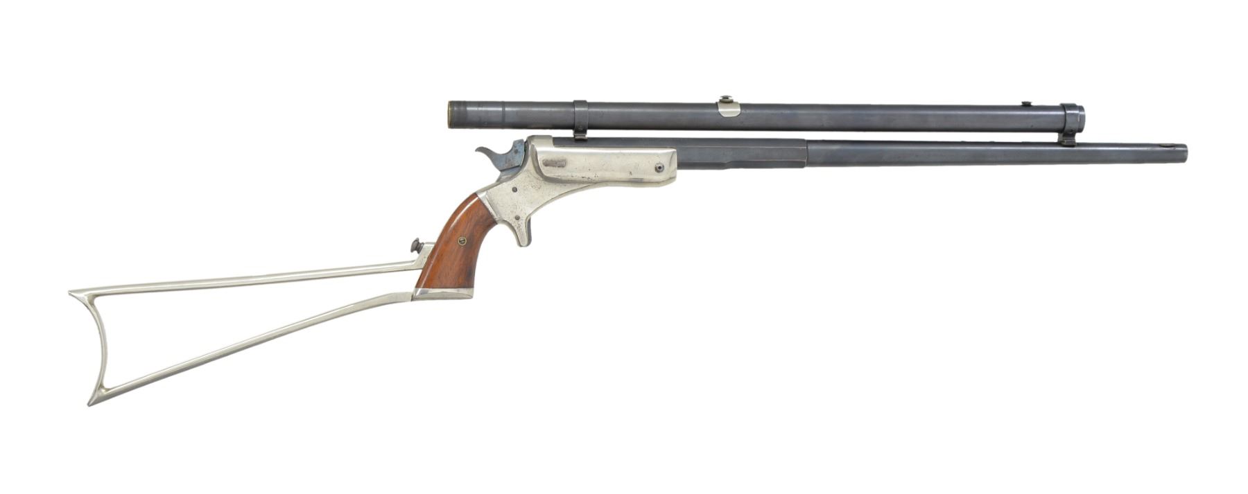Cal. 25 Stevens RF. S# 4429. Bbl. 18" tapered rnd. w/ oct. shank. Fitted w/ L.C. Cummins scope w/ 18" tube & standard crosshairs. Nickel finished iron frame w/ spur trigger, bush firing pin, mushroom type release button & linkage operated extractor. Frame has takedown pin w/ lg. knurled head for easy disassembly. Bbl. & frame have matching numbers. Butt is slotted for attachment for shoulder stock. 2 Piece walnut grips. Estimated production of 4,000, 1872-1900. UNATTACHED ACCESSORIES: 11" nickel finished iron shoulder stock w/ non matching number "4439". CONDITION: frame & shoulder stock retain over 80% nickel showing scattered spots of freckling. Bbl. retains 70% dull lightly faded blue. Grips have lightly worn finish showing light handling marks. Bore is generally bright w/ lightly worn rifling. Scope retains 80% dull lightly faded blue showing spots of freckling & has slightly cloudy optics. (19-5868/DS). CURIO. $1,250-1,750.