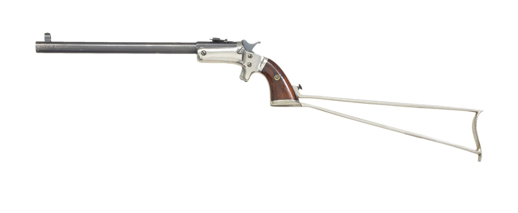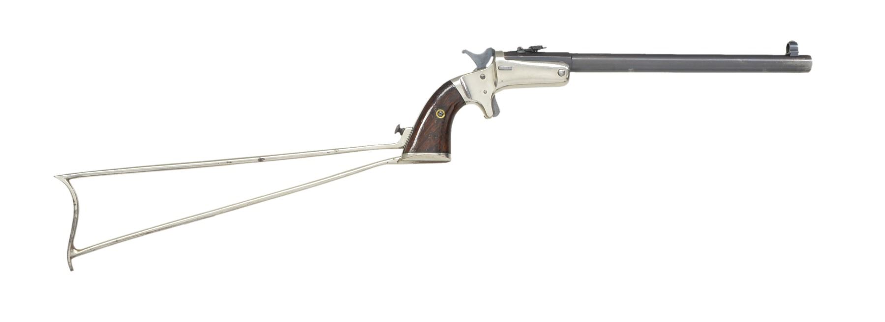 Cal. 22 RF. S# 574. Bbl. 10" rnd. w/ oct. shank & blue finish. Combination globe front sight & Hunters Pet style adj. folding rear sight. Medium size brass frame w/ nickel finish, sideplate, spur trigger, mushroom shaped release button & linkage operated extractor. Early model w/ hammer mounted firing pin. 2 Piece rosewood grips. Butt is fitted w/ slotted plate w/ shoulder stock attachment. Bbl., frame & shoulder stock have matching numbers. Estimated production 15,000, 1875-1896. UNATTACHED ACCESSORIES: 12" iron shoulder stock w/ nickel finish. CONDITION: frame & shoulder stock retain over 95% nickel. Bbl. retains 80% dull lightly faded blue showing sm. spots of pitting near muzzle. Grips have added varnish over scratches & sm. dents. Bore has slightly darkened appearance w/ worn rifling. (01-17014/DS). ANTIQUE. $900-1,300.