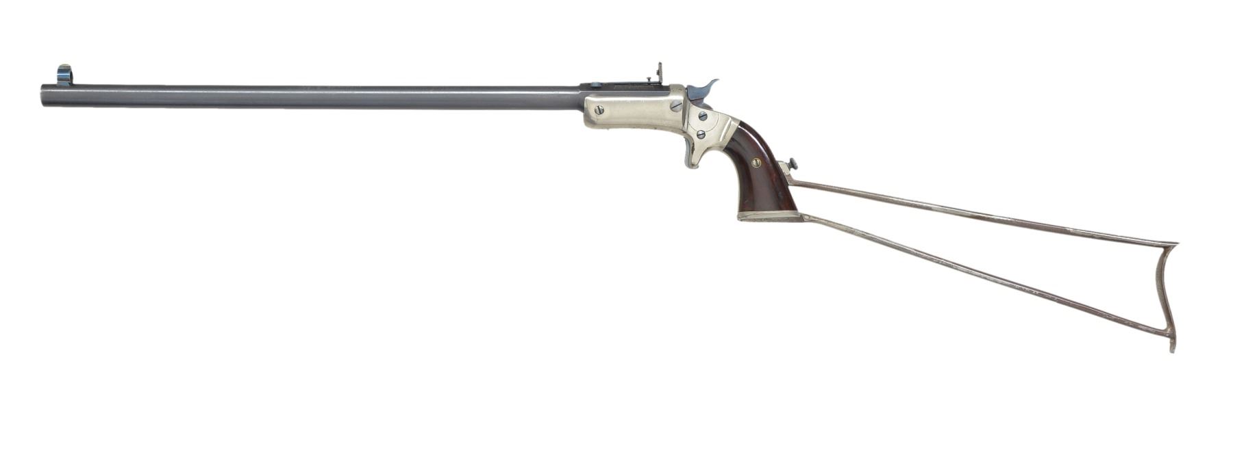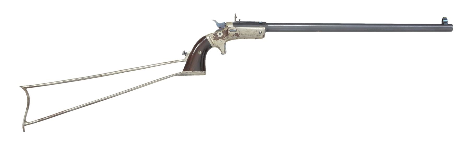 Cal. 22 RF. S# 9308. Bbl. 15" rnd. w/ oct. shank & blue finish. Combination globe front sight w/ elevation adj. peep rear sight. Medium size iron frame w/ nickel finish, spur trigger, bushed firing pin, mushroom style release button & linkage operated extractor. 2 Piece rosewood grips. Butt has slotted cap for stock attachment. Bbl., frame & stock have matching numbers. Estimated production 15,000, 1875-1896. UNATTACHED ACCESSORIES: 11 1/2" nickel finished detachable iron shoulder stock. CONDITION: frame retains 70% nickel w/ areas of flaking most prevalent on the right side. Stock retains 40% nickel. Bbl. retains 80% dull lightly worn blue. Grips have lightly worn finish w/ sm. marks. Bore retains sound rifling showing sm. spots of very light pitting. (01-17031/DS). ANTIQUE. $800-1,100.