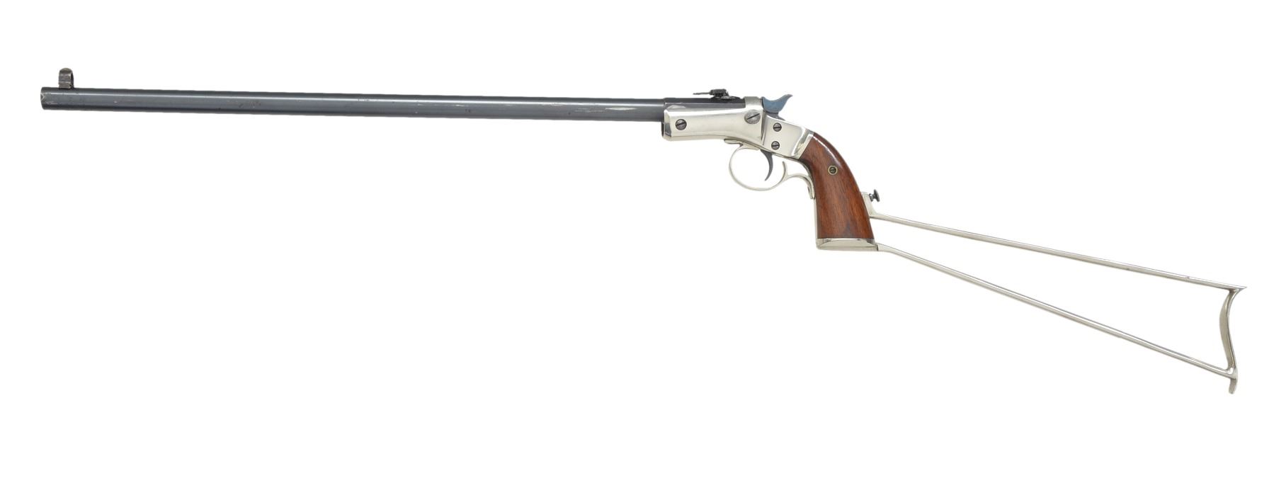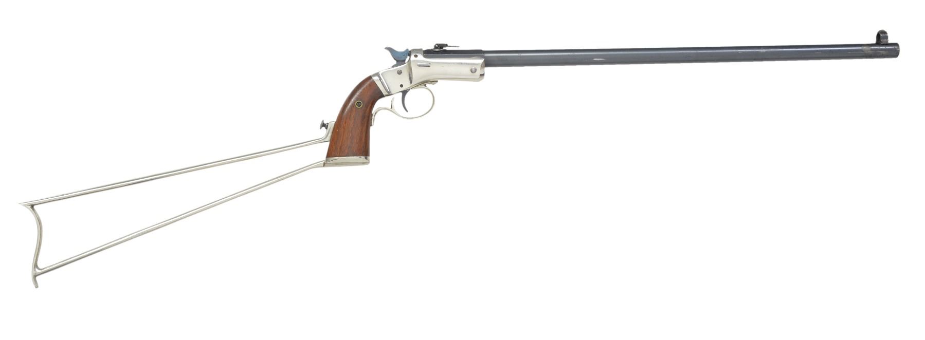 Cal. 32 RF. S# 44804. Bbl. 17 1/2" rnd. w/ oct. shank. Combination globe front w/ combination folding leaf peep rear sight. Blue finished bbl. Nickel finished action & stock. Features include mushroom shaped release button, linkage operated extractor, non bushed firing pin, iron trigger guard & slotted buttcap for stock attachment. 2 Piece walnut grips. Estimated production 15,000, 1896-1916. UNATTACHED ACCESSORIES: 11 1/2" nickel finished detachable iron shoulder stock w/ matching S#. CONDITION: 75% lightly worn bbl. blue showing spots of corrosion & wear w/ sm. dent at left side of muzzle. Action & stock retain over 95% bright nickel finish showing light scratches. Grips show wear w/ scattered scratches & marks. Bore has lightly worn rifling w/ scattered spots of pitting. (19-5674/DS). CURIO. $700-1,000.