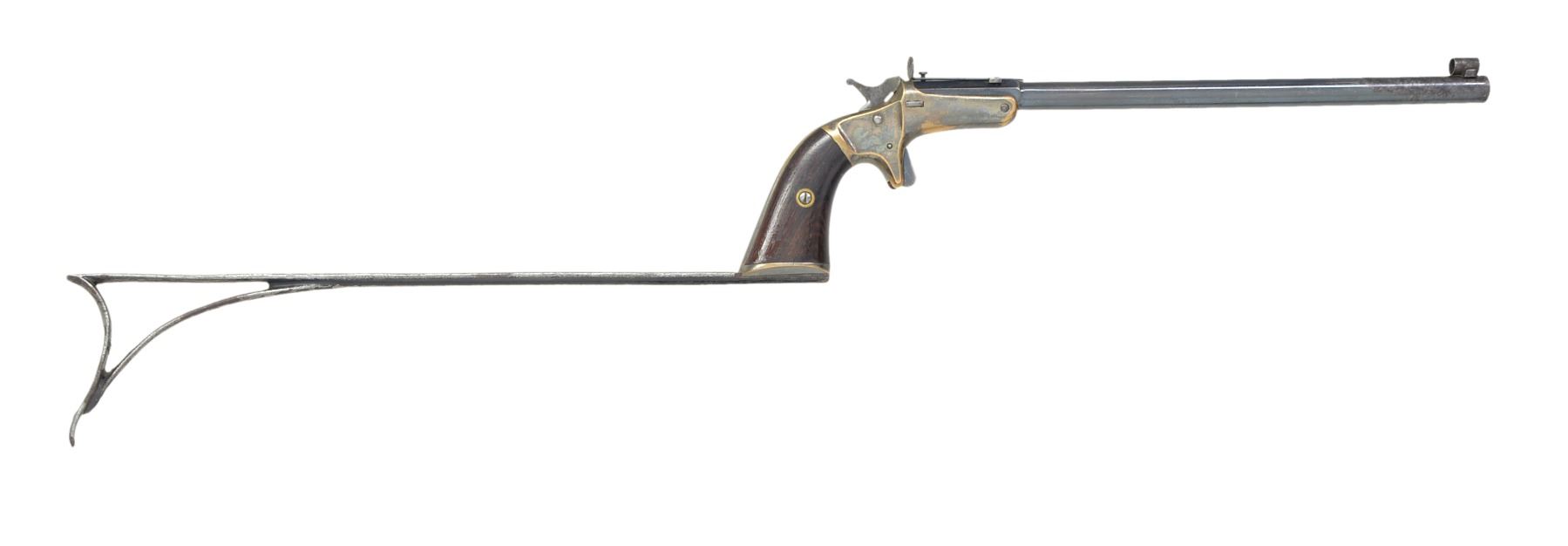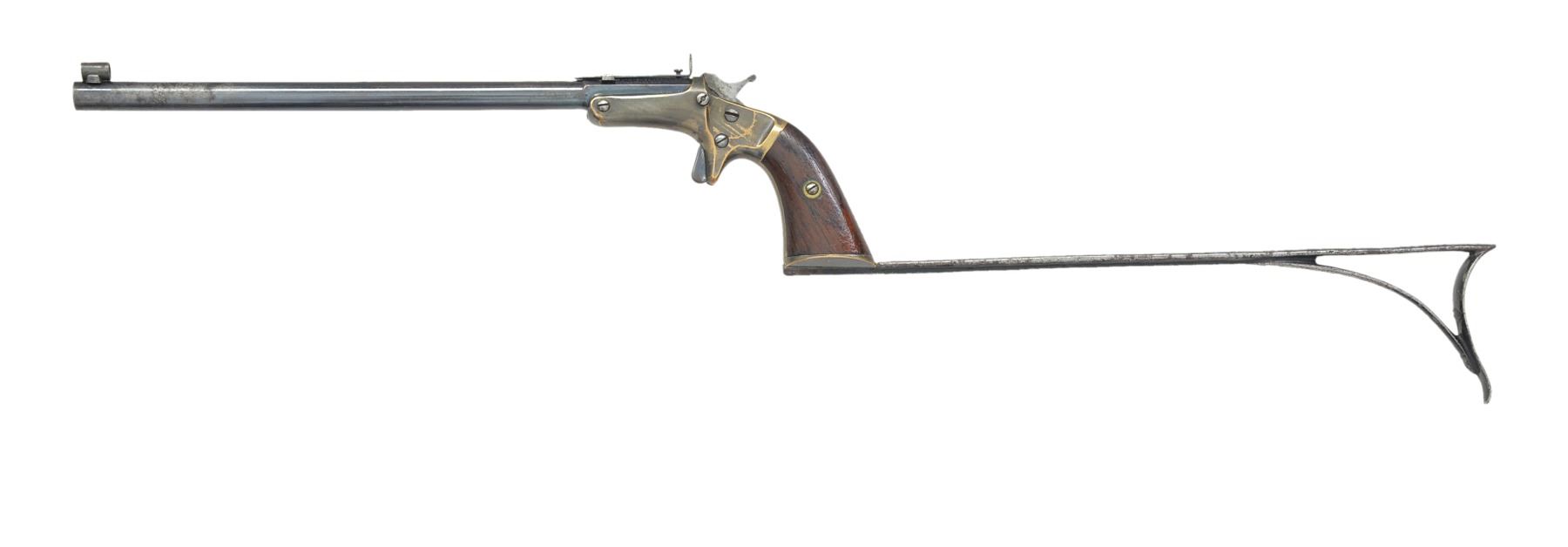 Cal. 22 RF. S# 3404. Bbl. 9" rnd. w/ oct. shank & blue finish. Globe front sight w/ elevation adj. rear peep sight. Silver finished sm. brass frame w/ buttcap to accept shoulder stock. Features include spur trigger, sideplate, straight style release button, hammer mount firing pin & spring operated extractor. 2 Piece walnut grips. Bbl, frame & shoulder stock have matching numbers. Estimated production of 4,000, 1869-1886. UNATTACHED ACCESSORIES: 11" iron shoulder stock w/ Japaned black finish. CONDITION: frame retains 40% silver finish acquiring a darkened tarnish. Bbl. retains 70% lightly faded blue showing spots of light pitting. Grips show worn finish & light handling marks. Bore is dark w/ areas of light pitting retaining lightly worn intact rifling. Stock retains 30% Japaned finish. (01-17012/DS). ANTIQUE. $700-1,000.