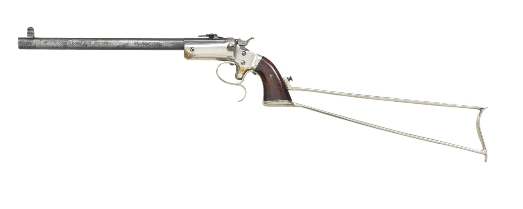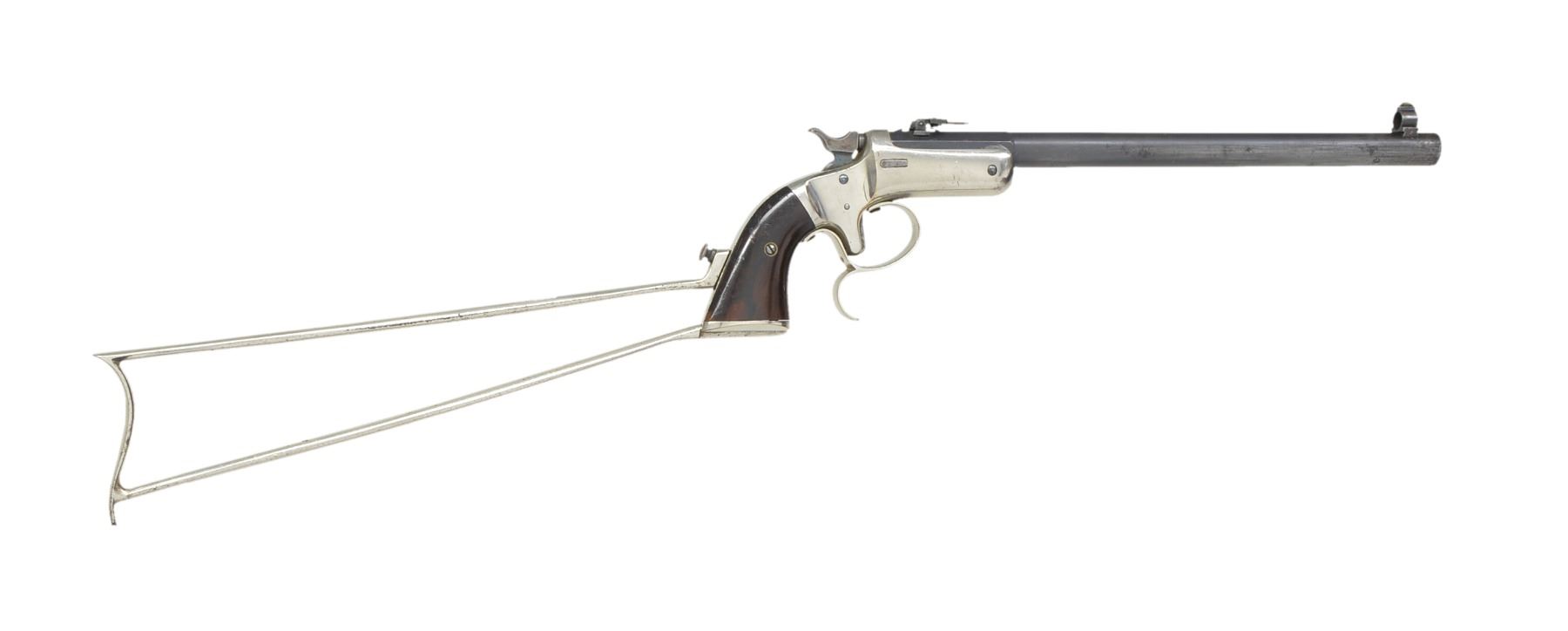 Cal. 22 RF. S# 10851. Bbl. 10" rnd. w/ oct. shank & blue finish. Combination globe front sight w/ Hunters Pet style adj. folding leaf rear sight. Nickel finished medium sized brass frame w/ sideplate, mushroom style release button, bushed firing pin & linkage operated extractor. Spur trigger in conjunction w/ screw fastened nickel finished finger curl trigger guard. 2 Piece rosewood grips. Butt has slotted cap for stock attachment. Frame, bbl. & stock have matching numbers. Estimated production 15,000, 1875-1896. UNATTACHED ACCESSORIES: 11 1/2" nickel finished detachable iron shoulder stock. CONDITION: action & stock retain 80% nickel showing spots of flaking & wear. Bbl. retains 50% dull faded blue w/ cleaned area of pitting along left side. Grips show moderately worn finish w/ dents & handling marks. Bore has slightly darkened appearance w/ intact rifling showing moderate wear. (01-17028/DS). ANTIQUE. $600-900.