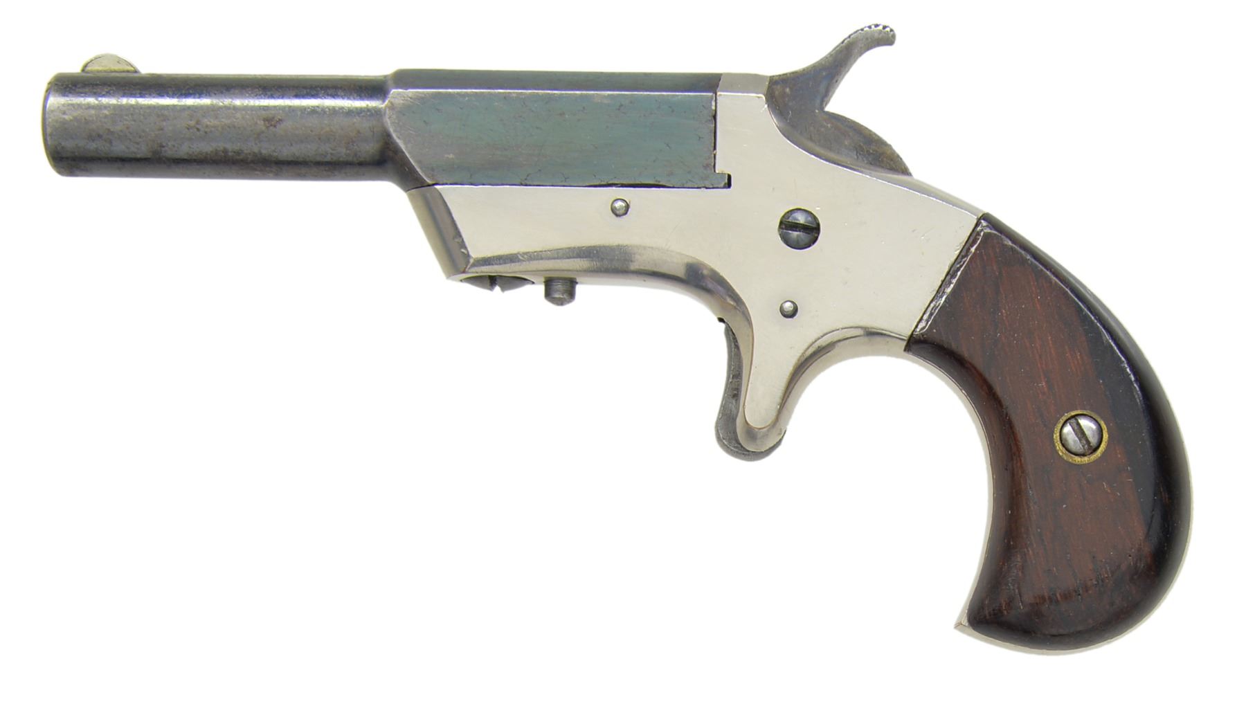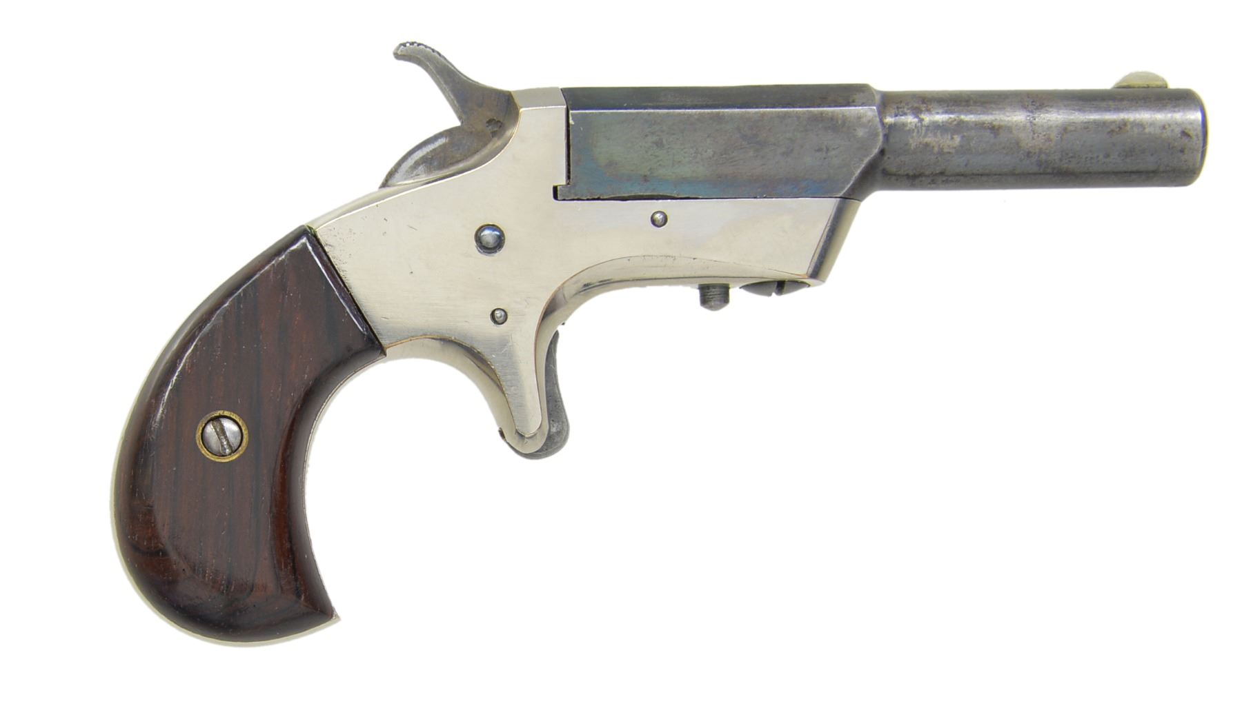 Cal. 22 RF. S# 1741. Bbl. 3" oct. to rnd. w/ German silver semi circle front sight. Top flat marked "GEM". Nickel finished spur trigger action, bbl. rotates to right for loading. 2 Piece walnut bird's head grips w/ matching S# "1741" on inside on both panels. The GEM is the only pistol in the Stevens line that did not use the tip up action & did not bear the Stevens marking. Estimated quantity of 4,000 produced 1872-1890. CONDITION: 70% lightly faded blue showing sm. spots of light pitting. Frame shows 98% nickel showing sm. marks. Grips have original varnish showing spots of wear & handling marks. Dark pitted bore w/ partially visible rifling. Trigger spring appears broken not allowing hammer to hold at full cock. (01-17037/DS). ANTIQUE. $500-750.