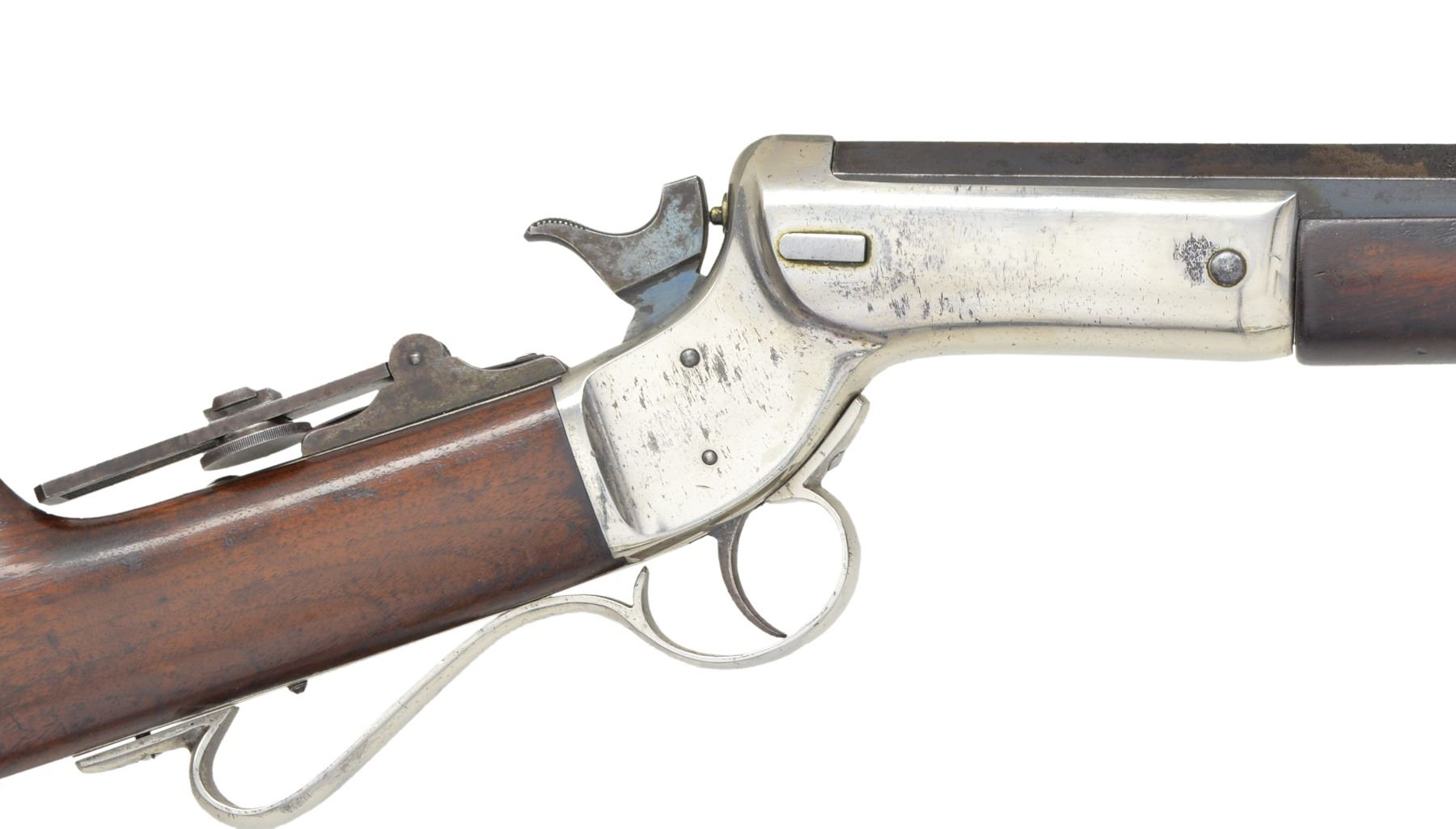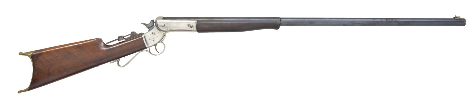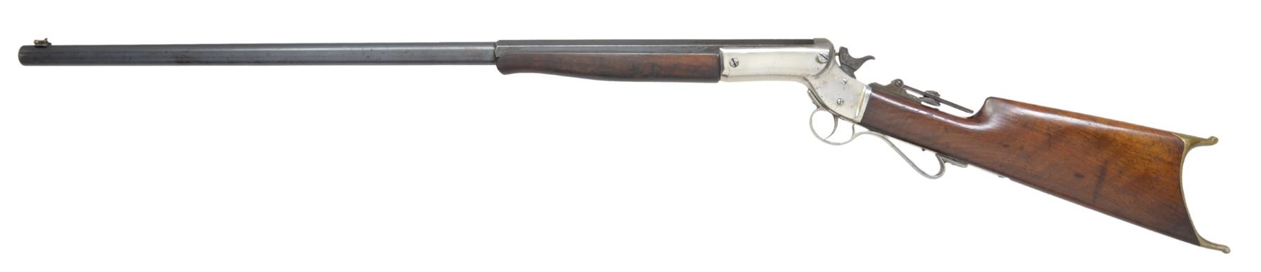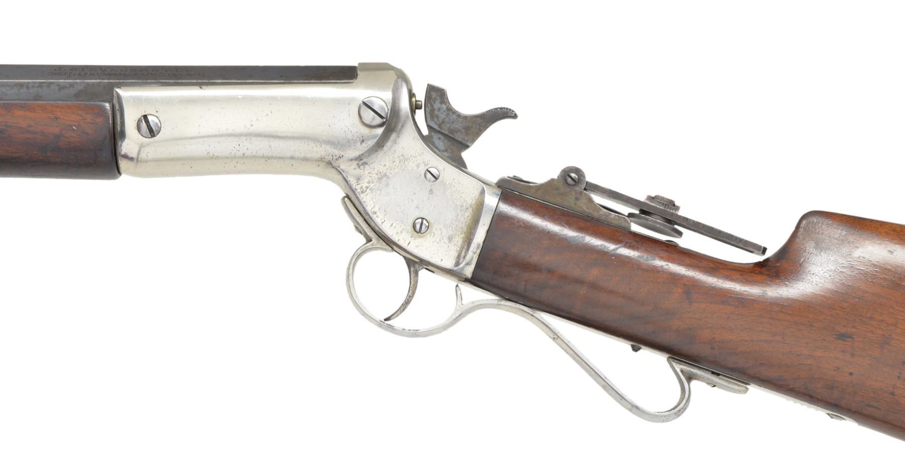 Cal. 32-35 Stevens CF. S# 27974. Bbl. 30" oct. to rnd. Left side of breech end is marked "35" above S# w/ "2" forward S#. Combination front sight w/ gold finished ring & Stevens vernier tang sight. Nickel finished action. Walnut stock & schnabel tipped forearm are nicely grained & fitted with a nickel finished brass Schuetzen buttplate. CONDITION: bbl. retains 70% dull lightly worn blue showing spots of corrosion & pitting heaviest on oct. portion. Action retains 80% nickel showing scattered spots of flaking & pitting. Stock has added finish over scratches & marks. Buttplate retains traces of nickel finish in protected areas. Bore has slightly darkened appearance retaining intact lightly worn rifling. (01-17057/DS). ANTIQUE. $500-800.