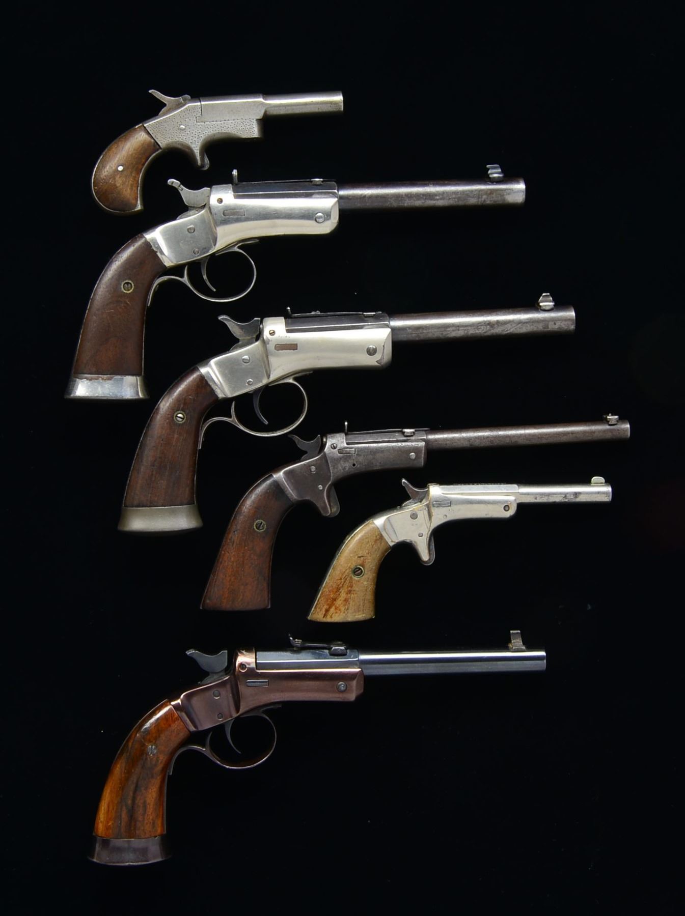 1) EUROPEAN COPY OF GEM POCKET. Cal. 32 RF. S# 537. Bbl. 2 7/8" rnd. 2 Piece walnut bird's head grips. Sides of frame have added punch dot texturing. Backstrap, bottom of frame forward of trigger & sides of hammer have added cut serrations or checkering. CONDITION: metal finish has faded to gray. Pitted bore w/ no visible rifling. grips show heavy wear w/ chips at action. (01-17716/DS). ANTIQUE. 2) STEVENS NO. 35 TIP UP. Cal. 22 LR. S# 29446. Bbl. 6" rnd. w/ oct. shank. Blade front sight w/ V notch rear sight missing elevator. Nickel finished frames features a flared butt cap. Firing pin is mounted in frame w/out bushing. 2 Piece walnut grips. CONDITION: bbl. retains 50% dull fading blue. Front sight has a poor fit in dovetail. Action retains 70% nickel. Hammer has weld attached wide extension w/ hand checkering. Grips show moderate wear w/ sm. handling marks. Relined bore has sound rifling. (20-1021/DS). CURIO. 3) STEVENS NO. 35 OFFHAND TARGET. Cal. 22 LR. S# 40226. Bbl. 6" rnd. w/ oct. shank. Bead front sight w/ elevator adj. U notch rear sight. Blue finished bbl. w/ nickel finished action having flared buttcap. Firing pin is mounted in frame w/out bushing. 2 Piece walnut grips. CONDITION: bbl. retains 40% dull fading blue showing areas of corrosion & light pitting. Action retains 60% dull nickel. Grips show wear & handling marks. Mushroom shaped release button is missing. Dark bore w/ worn rifling. (20-1032/DS). CURIO. 4) STEVENS DIAMOND NO. 43 SECOND ISSUE TIP UP. Cal. 22 Short. S# 54502. Bbl. 5 7/8" rnd. w/ oct. shank. Front sight is missing original globe. Rear sight is missing elevation adj. screw. 2 Piece walnut grips. CONDITION: metal has faded to mottled gray showing light pitting. Frame has added hole below bbl. breech. Grips have age darkened appearance w/ heavy wear & dents. Dark pitted bore. (20-1035/DS). CURIO. 5) STEVENS "SINGLE SHOT PISTOL". Cal. 22 Short. S# 18150. Bbl. 3 1/2" rnd. w/ oct. shank & semi circular front sight. Full nickel finish. Action features spur trigger & hammer mounted firing pin. 2 Piece walnut grips. CONDITION: 75% nickel showing spots of corrosion & sm. dents. Grips have worn finish showing handling marks. Hammer screw is a replacement. Dark pitted bore. (20-1036/DS). CURIO. 6) STEVENS NO. 35 OFFHAND TIP UP. Cal. 22 RF. S# 46332. Bbl. 6" rnd. w/ oct. shank. Replacement blade front sight w/ U notch rear sight having replacement elevator screw. Action has wide flared butt cap. Firing pin is mounted in frame w/out bushing. CONDITION: 90% reblued finish, action has acquired a plum color. Mushroom shaped release button is missing. Grips have glossed finish showing scratches & marks. Bore is dark w/ worn rifling & light pitting. (20-1071/DS). CURIO. $900-1,350.