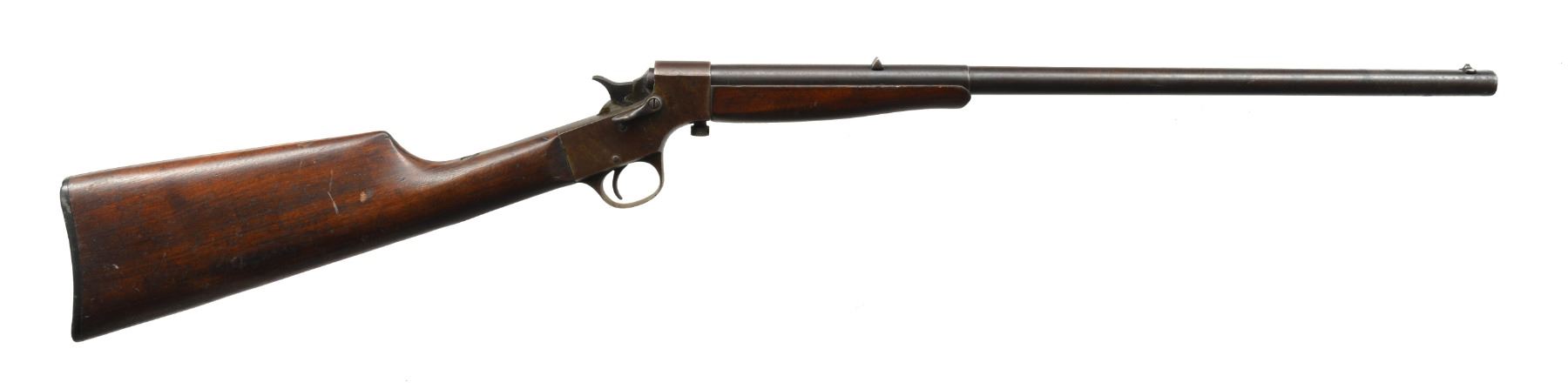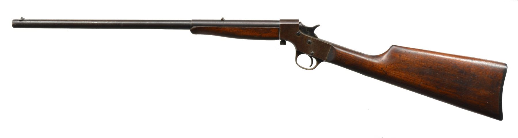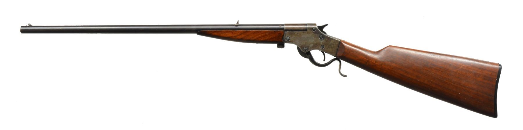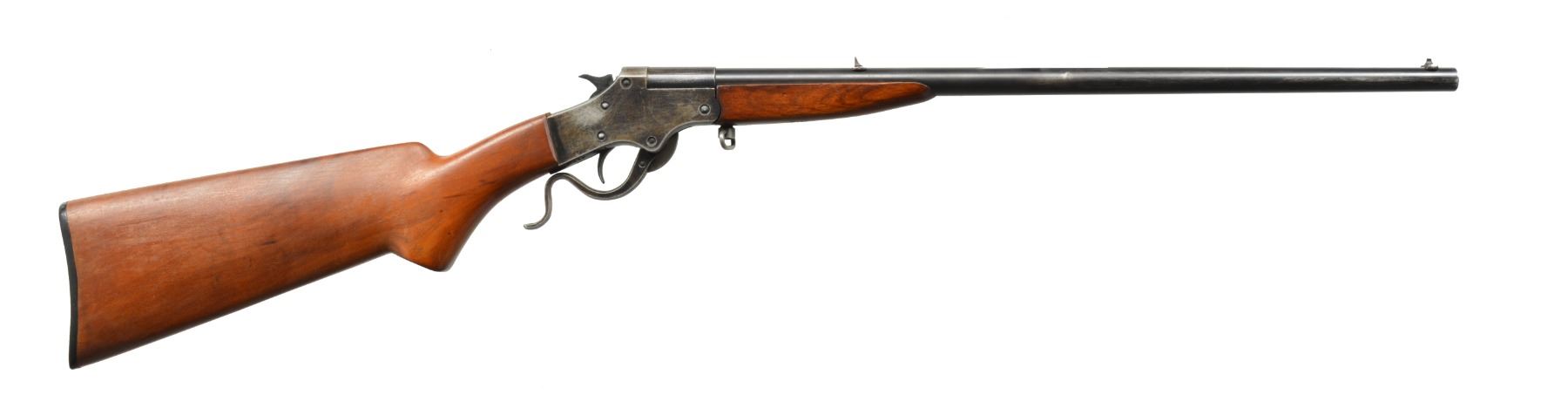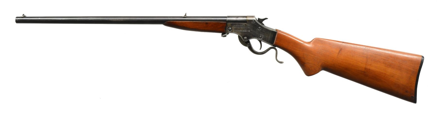 1) MARKSMEN NO. 12. Cal. 22 LR. S# M725. Bbl. 22" rnd. w/ blade front sight & fixed V notch rear sight. Lever operated break open action. Walnut forearm & straight grip stock w/ dished checkered hard rubber buttplate. CONDITION: bbl. retains 80% dull lightly faded blue. Action retains faint traces of blue flaking to mottled gray brown patina. Wood has moderate finish wear showing numerous scratches & handling marks. Bore is bright retaining generally sound rifling. (20-1269/DS). 2) MARKSMEN NO. 12. Cal. 25 Stevens RF. S# L410. Bbl. 20" rnd. w/ bead front sight & fixed V notch rear sight. Lever operated break open action. Original hardwood forearm. Replacement hardwood pistol grip stock using original curved checkered hard rubber buttplate. CONDITION: bbl. retains 70% dull fading blue. Action has 50% lightly faded blue showing scratches from aggressive cleaning. Refinished forearm shows light wear & sm. handling marks. Stock has dull lightly worn finish. Bore retains sound rifling. (20-1270/DS). 3) CRACKSHOT NO. 16. Cal. 22 LR. S# A6694. Bbl. 20" rnd. w/ blade front sight & fixed V notch rear sight. Rolling block style action. Walnut forearm & straight grip stock w/ curved checkered hard rubber buttplate. CONDITION: metal finish is fading to a mottled patina. Wood has worn original finish showing scratches & marks. Dark lightly pitted bore. (20-1272/DS). ALL CURIO. $500-750.