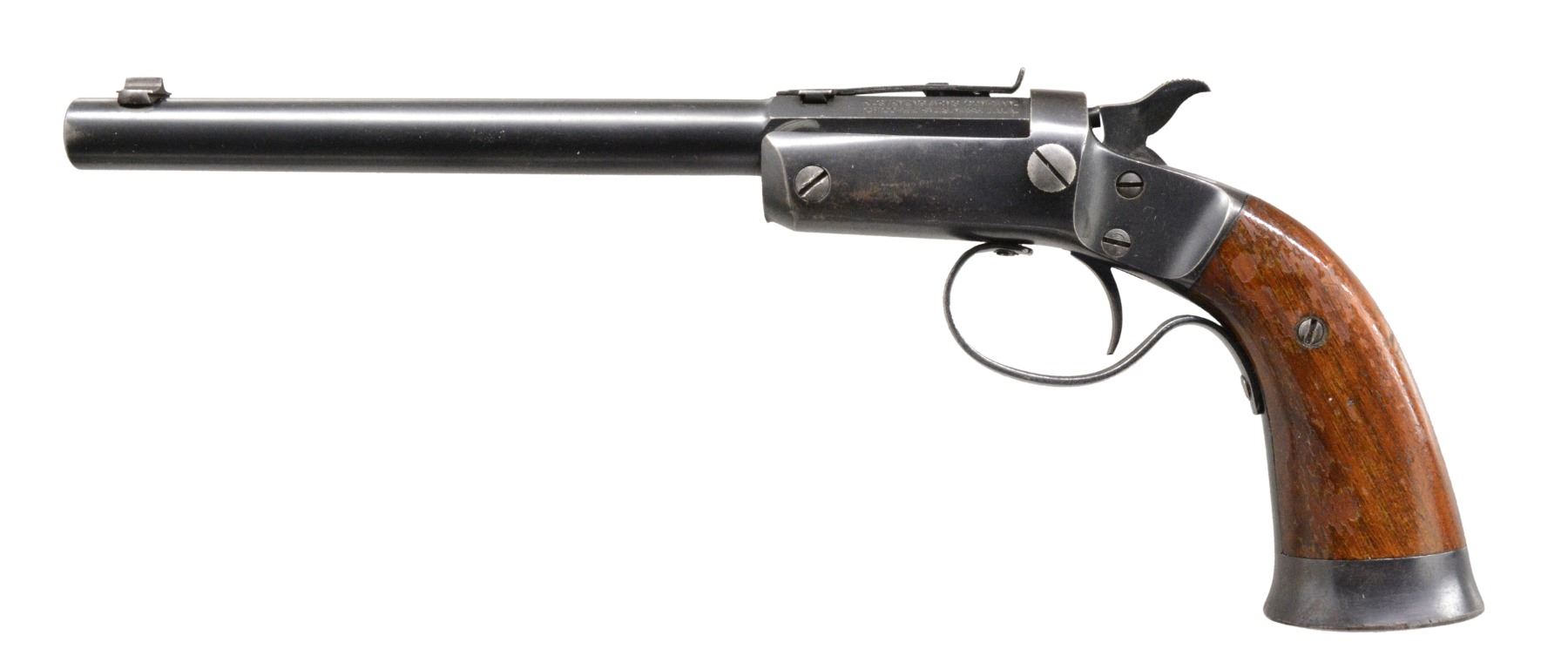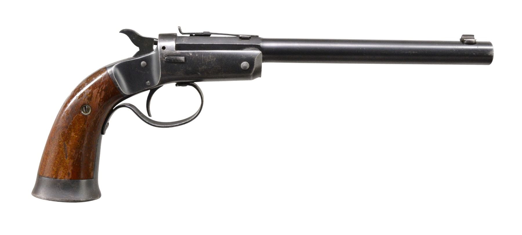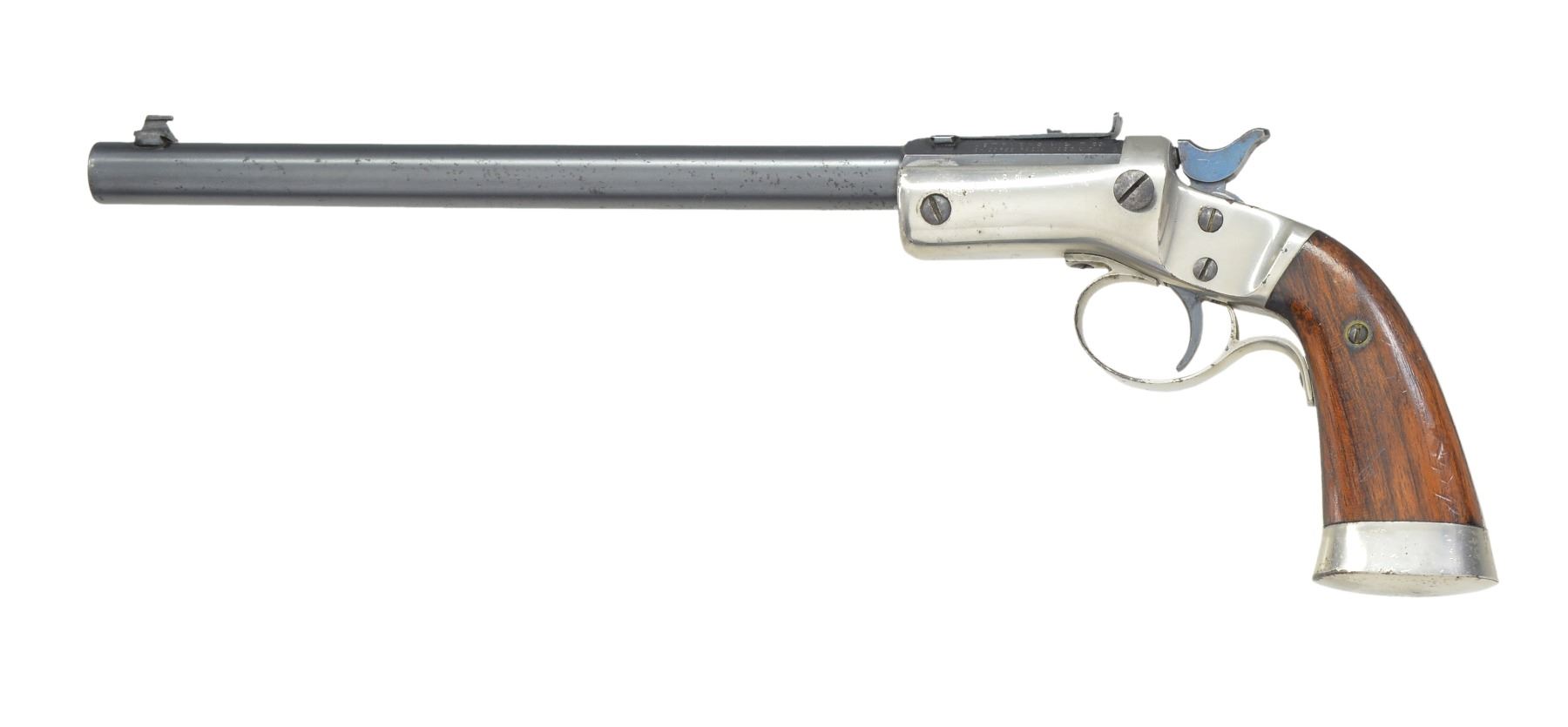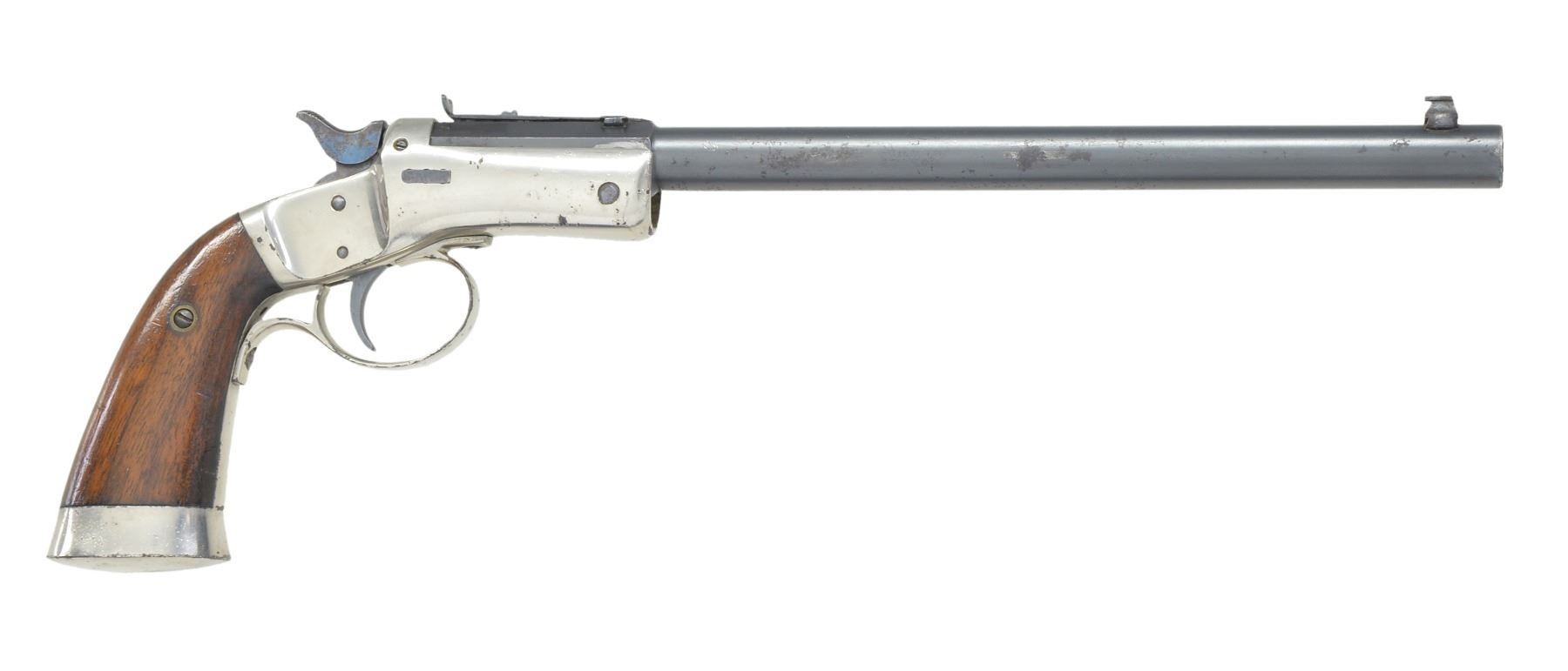 BOTH: cal. 22 RF. Both have iron frames featuring mushroom shaped extractors, conventional triggers, linkage operated extractors, frame mounted firing pins & iron buttcaps. 2 Piece walnut grips. 1) OFFHAND TARGET. S# 37014. Bbl. 10" rnd. w/ oct. shank. Bead front sight w/ elevator adj. U notch rear sight. Blue finish bbl. w/ nickel finished frame. Cast iron trigger guard. Knurled hammer spur. Mfg. 1907-1916. CONDITION: 80% lightly worn blue showing spots of freckling & pitting. Frame retains 80% nickel showing spots of flaking. Grips have added varnish over scratches & marks. Bore is bright w/ sound rifling. (19-5688/DS). 2) OFFHAND. S# 36328. Bbl. 8" rnd. w/ oct shank. Blade front sight hand filed to lower height. Elevation adj. rear sight has hand widened U shaped notch. Full blue finish. Stamped sheet metal trigger guard as used after 1929. Late style hammer w/ grooved spur. Mfg. 1923-1942. CONDITION: over 80% lightly worn blue. Grips have areas of peeling finish w/ scratches & marks. Front edge of frame shows distortion from bbl. contact. Bore has sound rifling. (19-5699/DS). BOTH CURIO. $700-1,000.