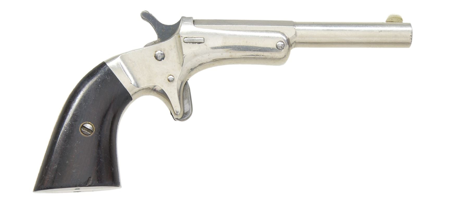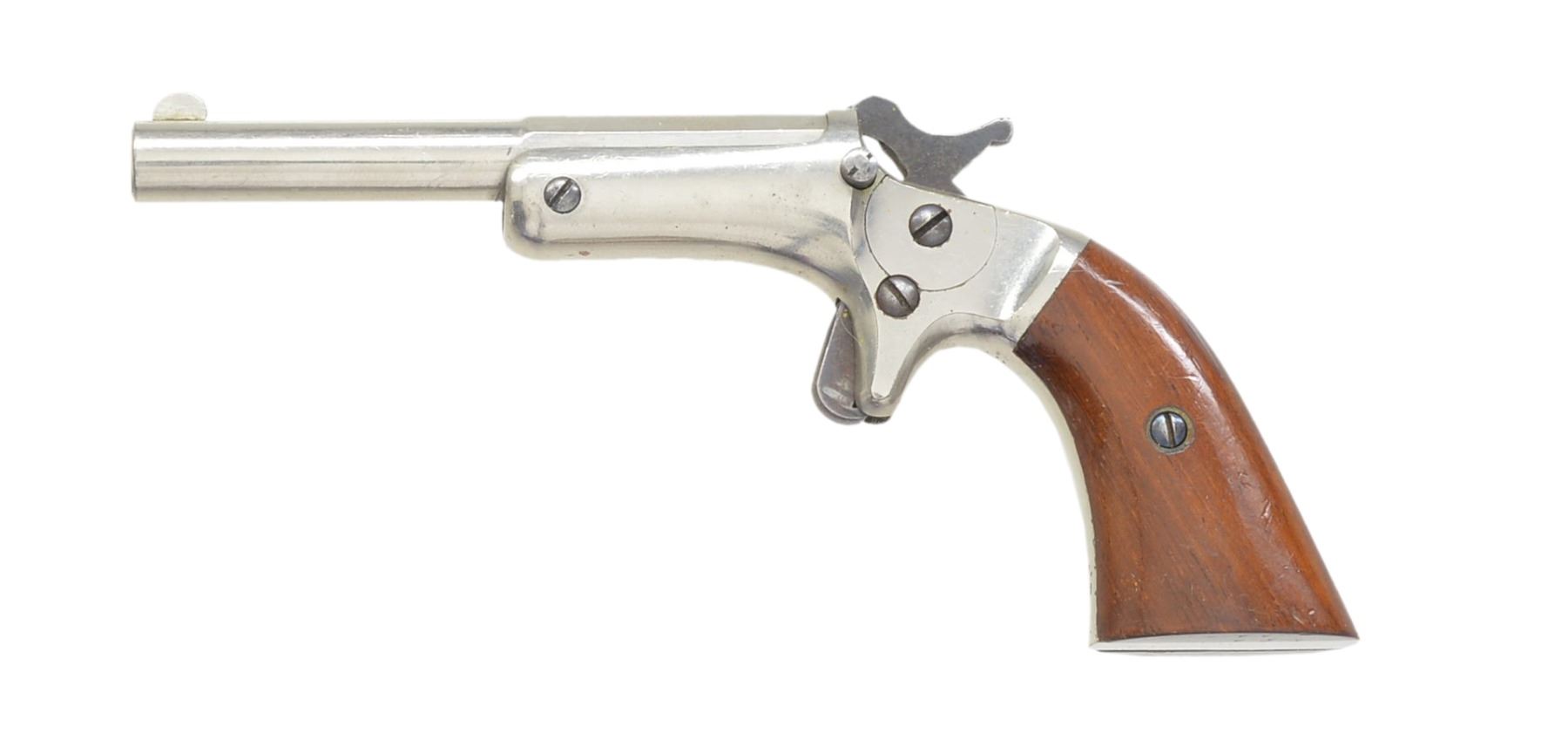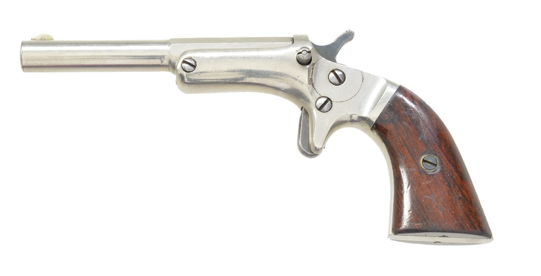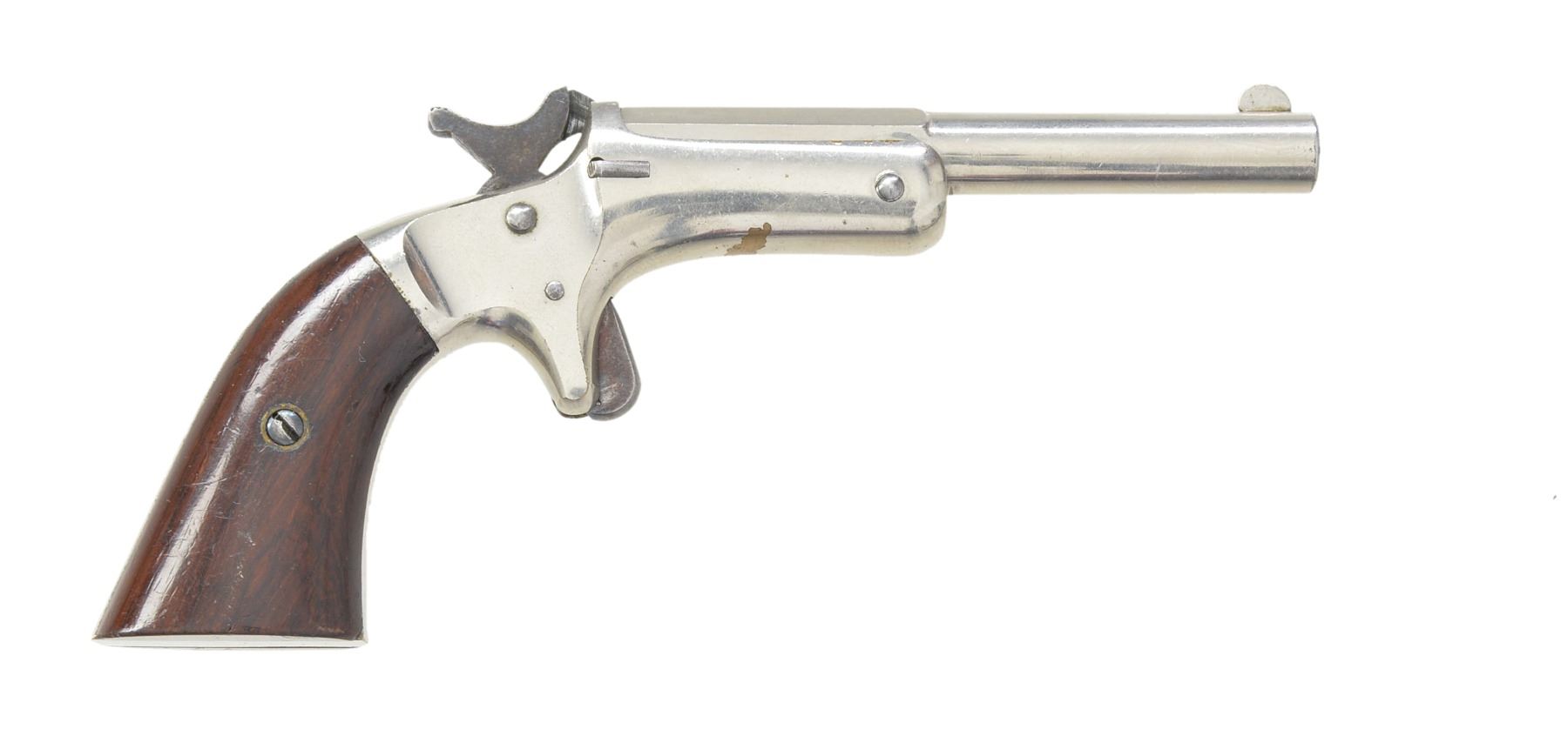 BOTH: bbls. 3 1/2" oct. to rnd. w/ semi circular front sight. Spur trigger actions w/ straight style release buttons, spring type extractors, side plates & full nickel finish. 2 Piece rosewood grips. Estimate production of 15,000 between 1864-1886. 1) Cal. 22 RF. S# 5402. CONDITION: over 90% nickel showing handling marks. Original grip finish shows wear w/ handling marks having sm. chip at butt of right panel. Bore retains clearly visible rifling showing a darkened appearance & some light pitting. (01-17021/DS). 2) Cal. 30 RF. S# 2388. CONDITION: over 90% nickel showing sm. spots of freckling. Original grip finish shows light wear. Bore retains sound rifling showing scattered spots of light pitting. Hammer will not hold at full cock. Extractor is not functioning. (01-17025/DS). BOTH ANTIQUE. $400-600.