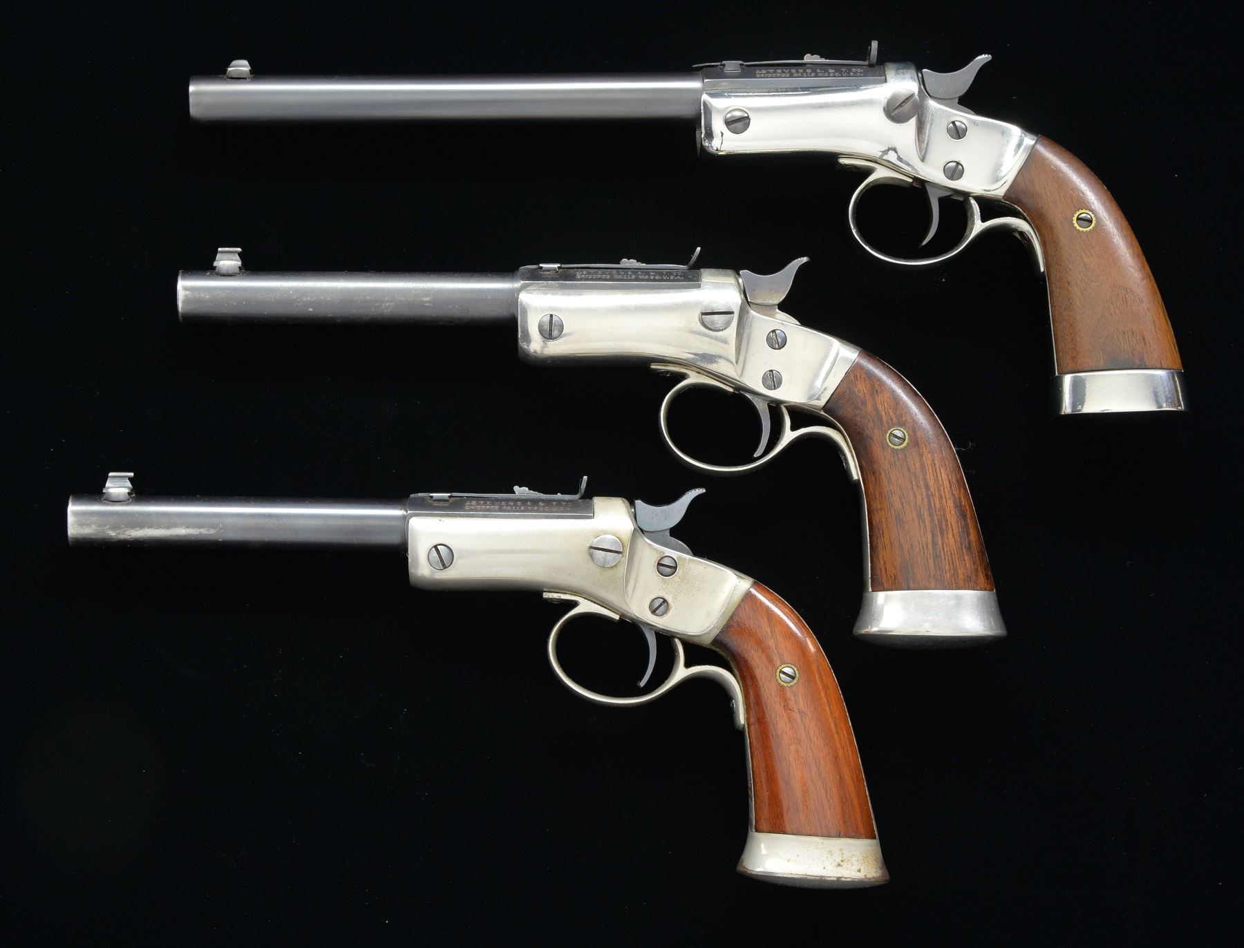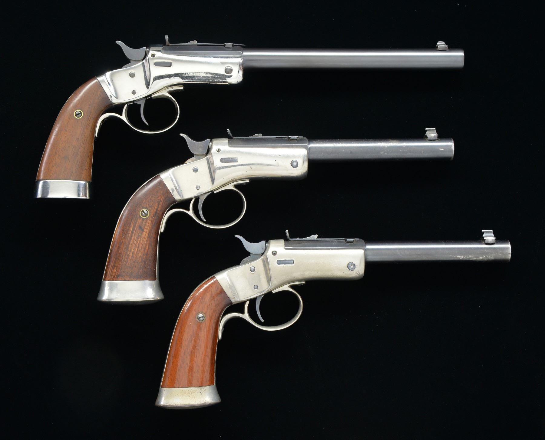ALL: blue finish bbls. w/ nickel finished frames. Features include mushroom shaped release buttons, linkage operated extractors, conventional triggers, frame mounted firing pins & iron buttcaps. 2 Piece walnut grips. Mfg. 1907-1916. 1) Cal. 25 Stevens RF. S# 33652. Bbl. 6" rnd. w/ oct. shank. Bead front sight & elevator adj. U notch rear sight. Cast iron trigger guard. CONDITION: bbl. retains 80% blue showing spots of wear. Frame retains over 80% nickel showing spots of wear & having a dulled appearance. Grips have good finish showing scattered marks. Bore retains largely intact rifling showing scattered pitting. (19-5692/DS). 2) S# 32286. Cal. 22 RF. Bbl. 6" rnd. w/ oct. shank. Bead front sight w/ elevator adj. V notch rear sight. Cast iron trigger guard. CONDITION: 60% dull worn blue. Frame retains over 90% nickel. Sanded & refinished grips. Bore retains lightly worn rifling showing very light pitting. (19-5694/DS). 3) S# 27535. Cal. 25 Stevens RF. Bbl. 8" rnd. w/ oct. shank. Blade front sight w/ elevator adj. V notch rear sight. CONDITION: bbl. retains 98% reblued finish. Frame has very good renickeled finish. Refinished grips showing some handling marks. Bbl. is loose on frame. Dark pitted bore w/ partially intact rifling. (19-5701/DS). ALL CURIO. $750-1,100.
