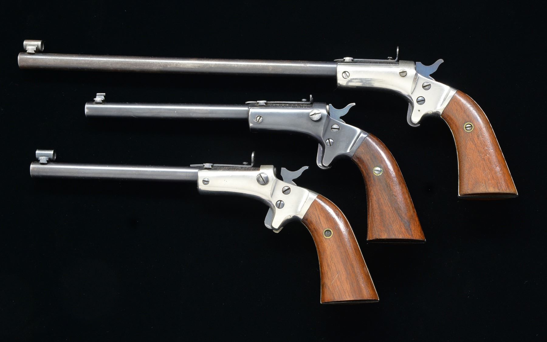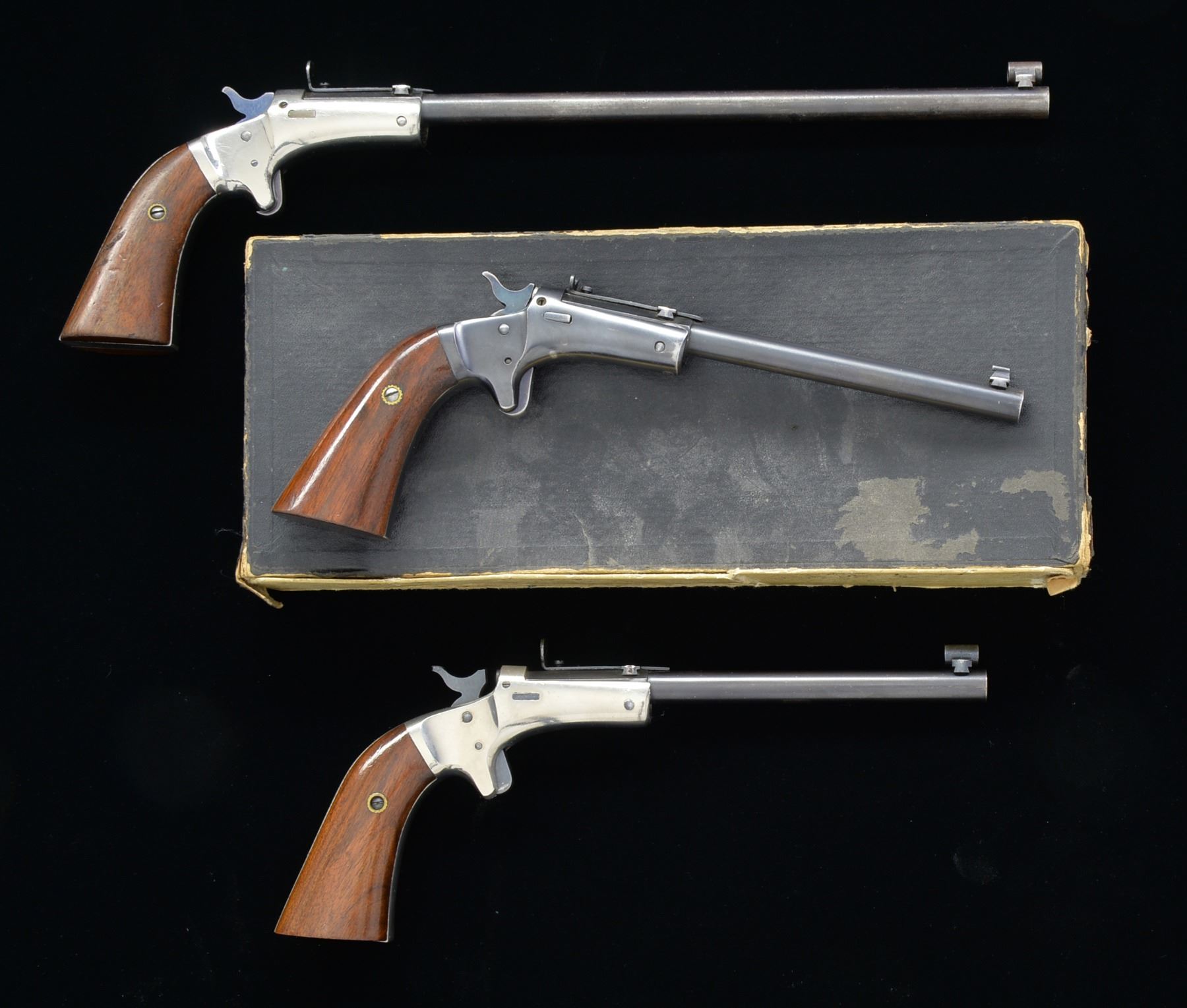 PISTOLS. ALL: cal. 22 RF. Iron frames w/out sideplates. Features include spur triggers, linkage operated extractors, frame mounted firing pins & 2 piece walnut grips. Estimated quantity 70,000, 1896-1916. 1) S# 13609. Bbl. 10" rnd. w/ oct. shank. Globe front sight w/ elevation adj. peep sight. Blue finished bbl. w/ nickel finished frame. Straight style release button. CONDITION: 60% dull fading bbl. blue showing spots of corrosion. Frame retains over 90% nickel. Grips show wear w/ dents & scratches. Pitted bore retains partially visible rifling. (19-5670/DS). 2) S# 50037. Bbl. 6" w/ bead front sight & elevation adj. U notch rear sight. Full blue finish. Mushroom shaped release button. UNATTACHED ACCESSORIES: 2 piece black box w/ proper label for Stevens No. 35 Offhand pistol w/ 6" bbl. Bottom of box is number "50037" to match pistol. Box shows wear & tattering w/ 1 side of lid missing. CONDITION: over 80% lightly worn blue. Grips show light wear & scattered marks. Bore retains worn rifling w/ 1 sm. area of deep pitting. (19-5671/DS). 3) S# 60760. Bbl. 6" rnd. w/ oct. shank. Globe front sight w/ elevation adj. peep sight. Blue finished bbl. w/ nickel finished frame. Mushroom type release button. CONDITION: 90% lightly worn blue showing sm. marks. Frame retains over 95% nickel showing sm. scratches & marks. Grips show light wear w/ scattered scratches & dents. Bore retains worn rifling w/ spots of pitting. (19-5702/DS). ALL CURIO. $750-1,100.