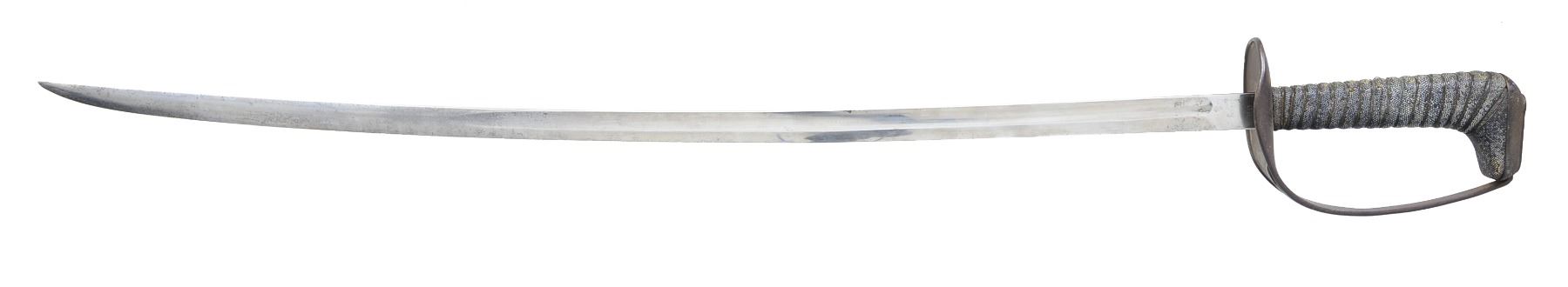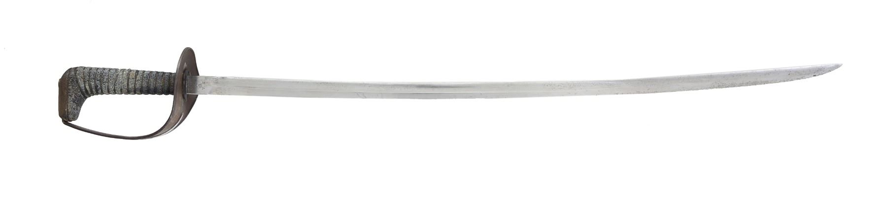 Overall length: 38". Blade length: 31 1/2". Single fuller blade marked at the ricasso, “S A(flaming bomb)1906” on 1 side & “80” on the other. Iron guard. Brass wire wrapped fish skin grip. No scabbard. CONDITION: blade has a light gray patina. Hilt is a bit oxidized. Grip shows light to moderate wear. Most of the wire wrap is missing. (02-13664/BF). $800-1,200.