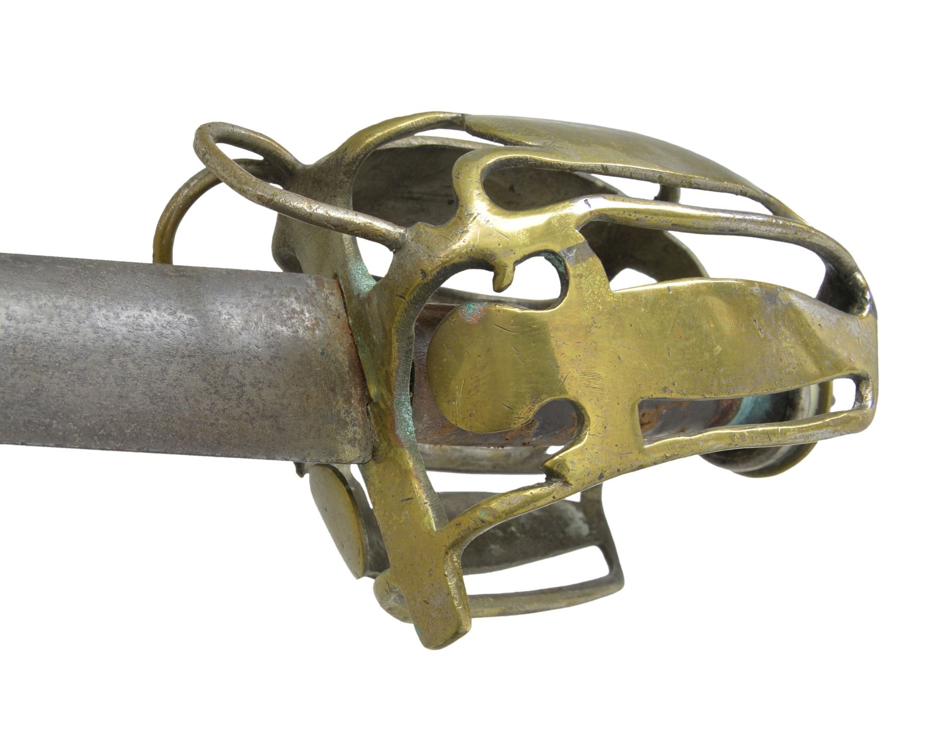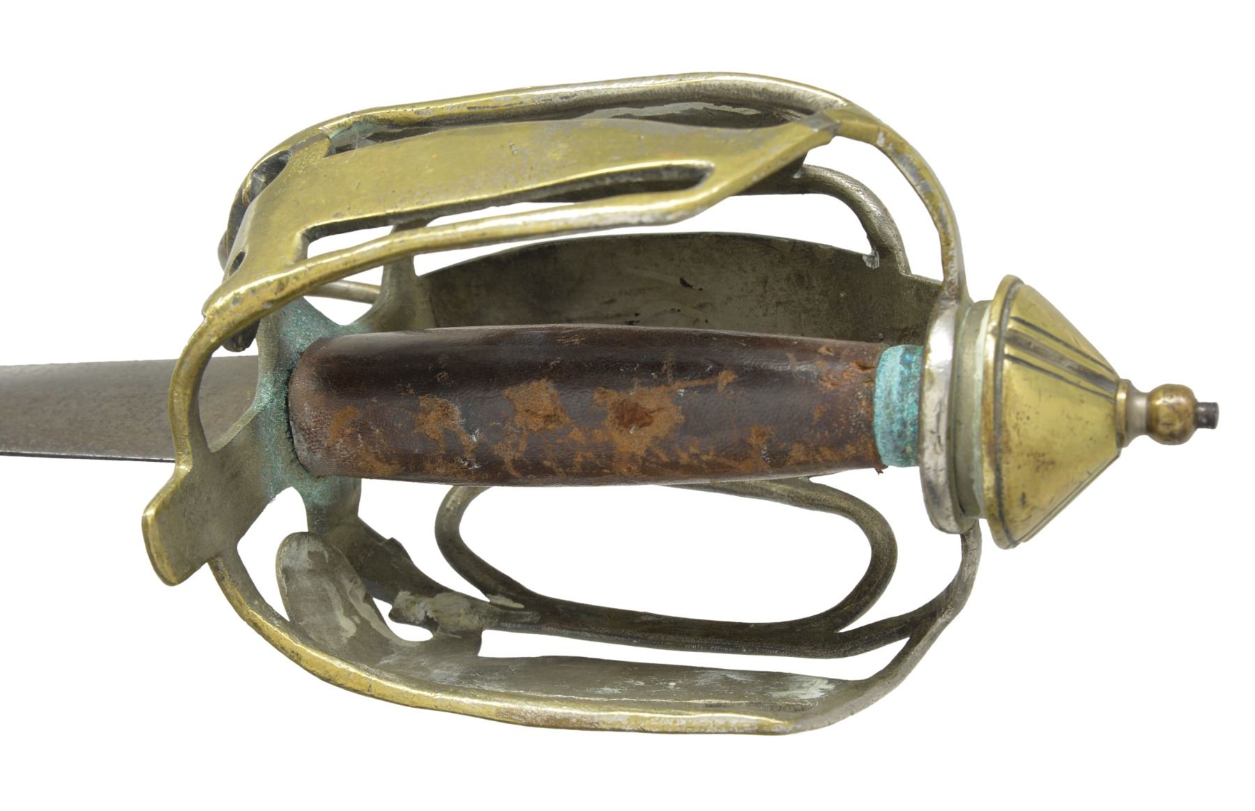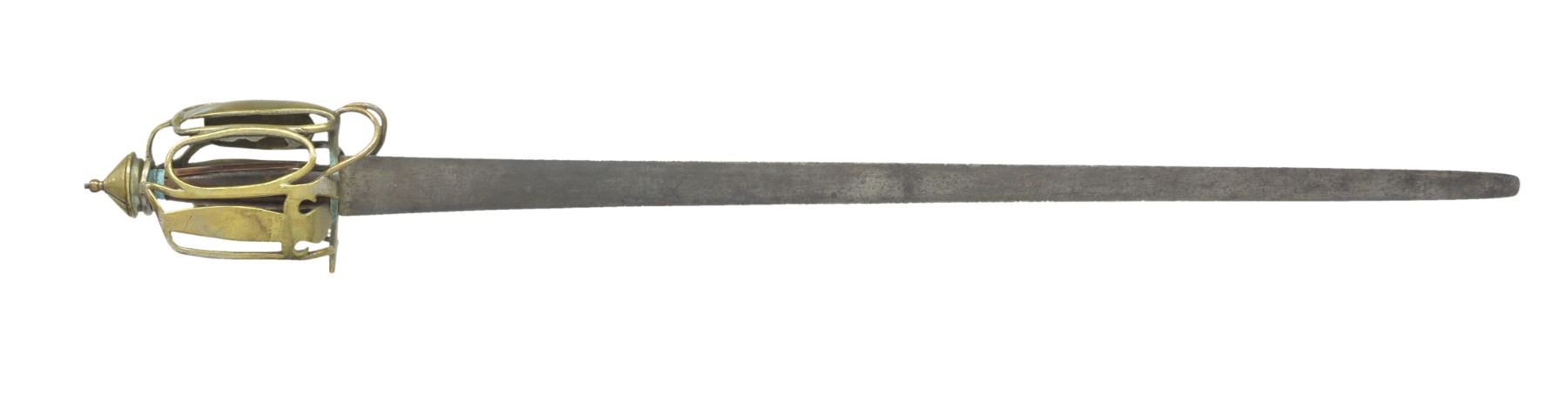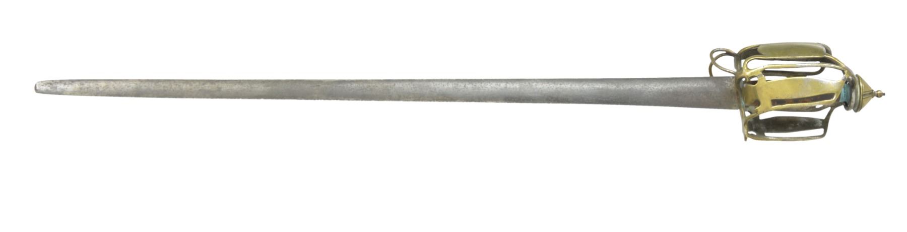 Overall length: 36 1/2". Blade length: 30 1/4". Plain unfullered dbl. edged blade. Brass basket style hilt w/ brass pommel cap. Leather covered wood grip. No scabbard. CONDITION: blade has a dark patina w/ some nicks to the edge. Tip of blade is a bit rounded. Basket guard has numerous dents, dings & minor bends but no major damage. Lower looped bars appear to have been reattached during period of use. Leather on grip appears to be an earlier 20th century replacement. Early brass basket hilts are seldom encountered in today's market. (02-13353/BF). $1,500-2,200.
