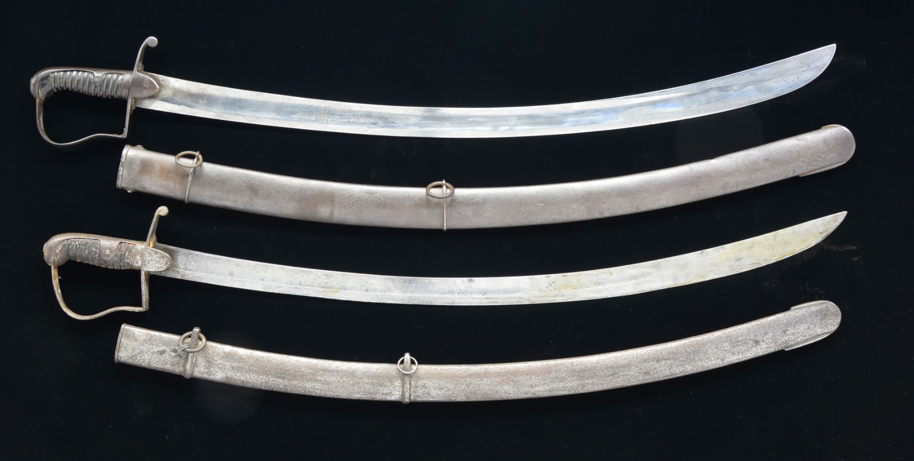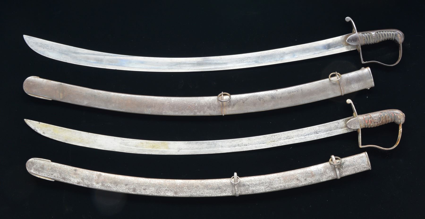 1) M1796 BRITISH LIGHT DRAGOON SABER. Overall length: 38 1/4". Blade length: 32 1/8". Plain, single wide fullered blade w/ an etched maker's mark at the ricasso that reads "PARKER FIELD & SON 233 HOLBORN LONDON". Iron hilt. Leather covered wood grip w/ vestiges of red paint. Iron scabbard. CONDITION: blade has a light gray cleaned finish & shows some evidence of light sharpening. Hilt is a bit misshaped & has heavy oxidation & pitting. Grip is quite dry & cracked w/ a roughened finish likely from scraping red paint from the grip. Scabbard has a dark oxidized patina w/ pitting & shallow dents particularly near the tip. (02-13370/BF). 2) M1796 BRITISH LIGHT DRAGOON SABER. Overall length: 39 7/8". Blade length: 33 1/4". Single wide fullered blade is etched over 1/3 of its length w/ various motifs including a crowned "GR", charging dragoon & crowned British arms. Blade is etched near the ricasso w/ a ribbon that reads "R.B. COOPER". Iron hilt w/ spade shaped languet engraved "16 LD". Wire wrapped leather covered wood grip w/ sm. rudimentary ears emanating from the backstrap. Iron scabbard engraved on 1 side "16 LD". The other side has an engraved maker's mark that is illegible. The 16th Light Dragoons had a significant history in the British Army including extensive service against the French during the Napoleonic Wars culminating w/ service at Waterloo. CONDITION: blade has a heavily cleaned light gray finish showing areas of cleaned light pitting. Etching is a bit worn but is easily legible & discernible. Hilt has a dark patina. Grip is nearly complete w/ very minor losses to the leather. Scabbard is undamaged & has an overall dark patina w/ heavier pitting on the reverse. (02-13373/BF). $800-1,200.