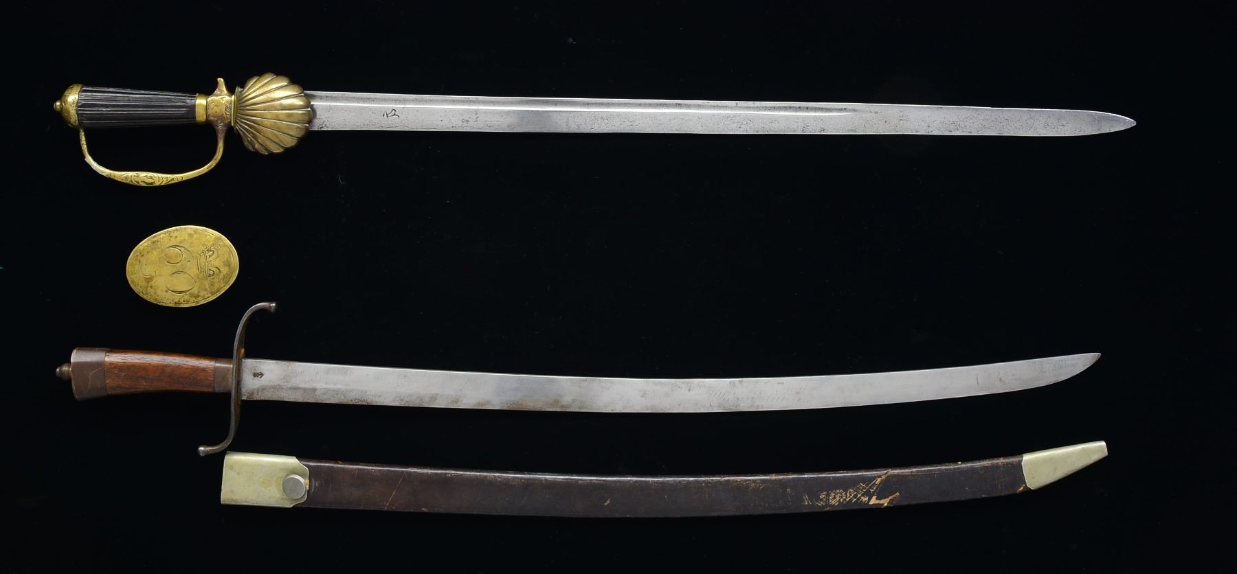 1) 60TH CROSS BELT PLATE. A brass oval plate measuring 3 1/4" x 2 1/8". Plate is hand engraved w/ a crown over "60" over "3". The crown appears to be possibly English but the quality of the plate indicates possible mfg. in an English colony. The plate shows mfg. techniques typical of the early 1800s but we cannot assign a concrete date to the plate. CONDITION: plate shows a partially cleaned, mottled patina on the front w/ a darker overall patina on the back. Wear does appear throughout the plate. (02-13363/BF). 2) HUNTING SWORD. Overall length: 30 7/8". Blade length: 25 1/2". Plain blade w/ a sm. fuller at the spine running for 18". There is a fleur de lis like stamp on each side of the blade, though 1 is barely visible. Brass hilt w/ down turned scallop shell guard. Knuckle bow & pommel cap are decorated. Quillon is missing. Reeded wood grip. No scabbard. CONDITION: blade shows a light gray lightly mottled, cleaned finish. Brass has a somewhat mellow patina. There is a sm. break near the top of the knuckle bow. Grip shows moderate wear. (02-13378/BF). 3) HANGER TYPE SWORD. Overall length: 30 1/4". Blade length: 24 3/8". Plain blade stamped at the ricasso w/ a broad arrow over "S" on 1 side & "LS" over "1986" on the other. Iron S shaped guard, ferrule & pommel. Shaped wood grip. German silver mounted leather scabbard w/ pewter button replacing missing frog stud. A difficult sword to identify but it appears to show mid 1800s mfg. techniques. Scabbard has questionable association w/ the sword but fits very well. CONDITION: blade has a light gray finish. Iron has a medium to dark patina. Grip shows scuffs & scrapes but no major damage. Scabbard is a bit flexed & shows scattered scuffs & scrapes. (02-13391/BF). $700-1,000.