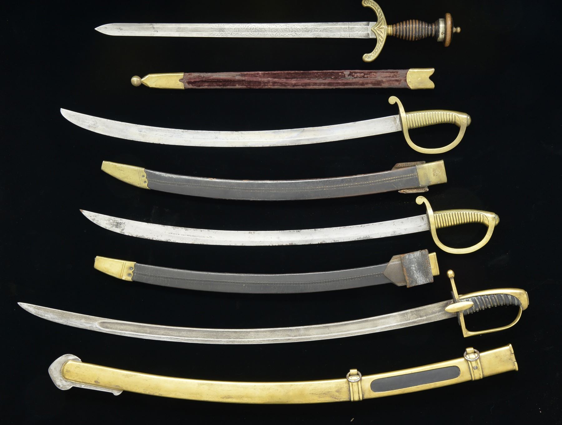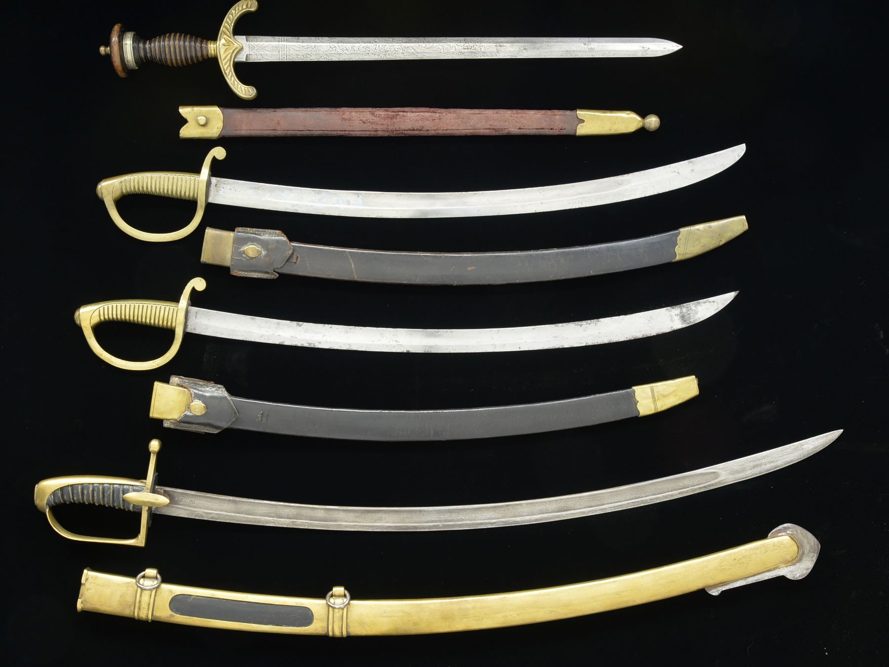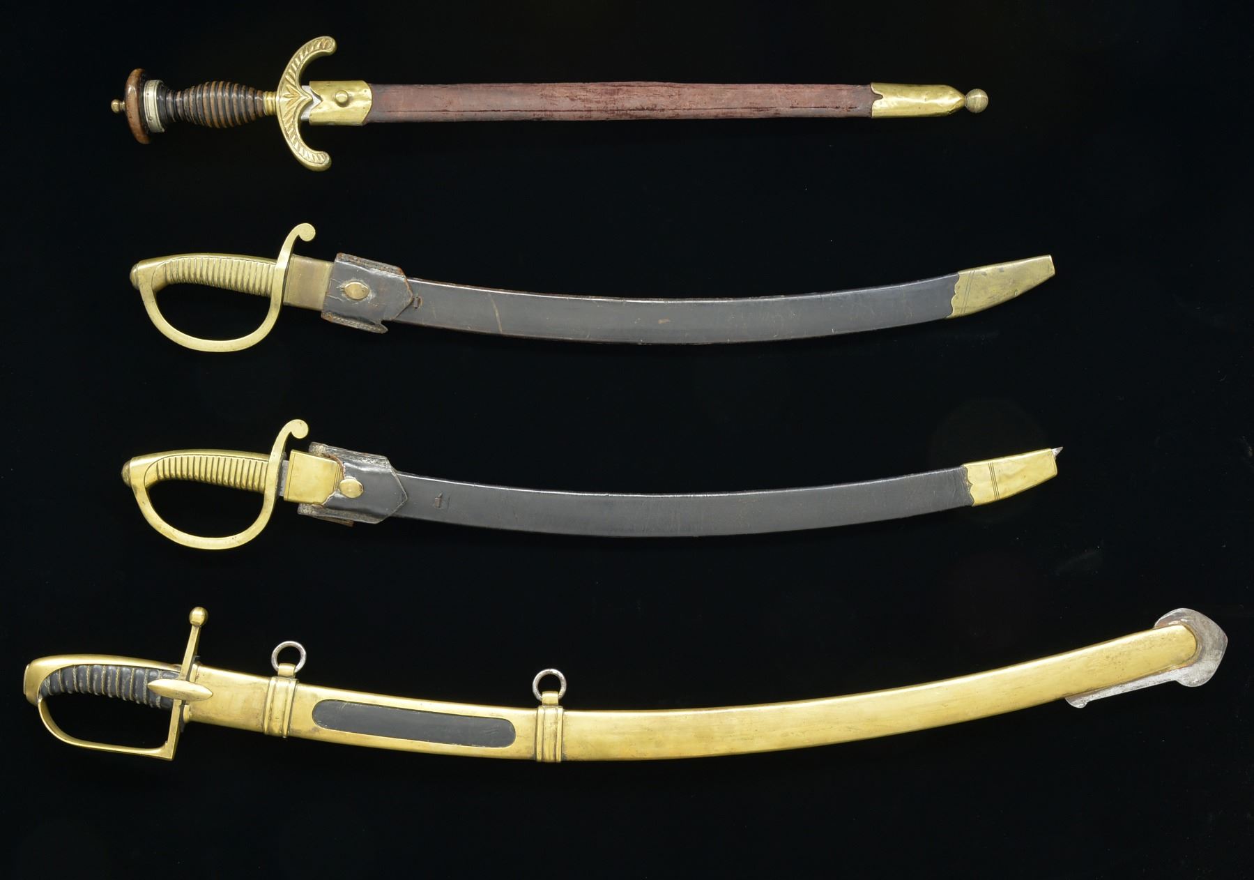 1) FRENCH STYLE INFANTRY HANGER. Overall length: 31 5/8". Blade length: 25 3/4". Plain, single fullered blade. Solid brass hilt w/ brass ribbed grip. Brass mounted leather scabbard w/ partial frog. CONDITION: blade has a light gray finish w/ a few areas of scattered light oxidation. Hilt has a mellow patina. Scabbard shows minor flexing but remains strong. Frog is missing the entire back side. (02-13376/BF). 2) NAPOLEONIC STYLE FRENCH SABER. Overall length: 41". Blade length: 33". Plain blade w/ a single wide fuller & 2 stampings at the ricasso which appear to be a sun over "M" & "LW" in a circle w/ dots. Heavy brass hilt. Wire wrapped leather grip. Brass scabbard w/ iron drag & suspension rings. There is a 6 3/4" leather section revealed by an oval cut out in the scabbard beginning 4 1/2" down from the throat. This saber is believed to be a very high quality recreation of a Napoleonic Imperial Guard Light Dragoon saber. CONDITION: blade has a medium gray cleaned finish. Hilt shows minor dents & dings but remains quite solid. Leather grip shows surface wear. Wire complete. Scabbard shows overall light wear & has a mellow patina to the brass. (02-13377/BF). 3) FRATERNAL SWORD. Overall length: 30". Blade length: 21 3/4". Blade is etched over 2/3 of its length w/ various military & foliate motifs. Brass turned down guard w/ turned wood ribbed grip. Lg. wooden disk pommel w/ German silver ferrule below. Brass pommel nut. Brass mounted, burgundy velvet covered scabbard w/ frog stud on the top mount. This sword does have military motifs on the blade but its overall size & motif indicate possible fraternal use. The style of the etching indicates possible British mfg. CONDITION: blade has a medium gray patina w/ light wear however the etching remains quiet sharp. Hilt shows light to moderate wear overall w/ no major damage. Scabbard is well worn w/ much of the velvet worn away. The scabbard has shrunk a bit causing the blade to fit tightly. (02-13384/BF). 4) FRENCH STYLE INFANTRY HANGER SWORD. Overall length: 31 3/4". Blade length: 26 1/2". Plain, single fulled blade. Solid brass hilt w/ brass ribbed grip. Brass mounted leather scabbard w/ partial frog. CONDITION: blade has a light gray finish w/ scattered areas of oxidation. Hilt has a pleasing patina. Scabbard is a bit flexed but remains quite strong. Frog is torn at the belt loop & missing an area above the frog stud. (02-13407/BF). $800-1,400.