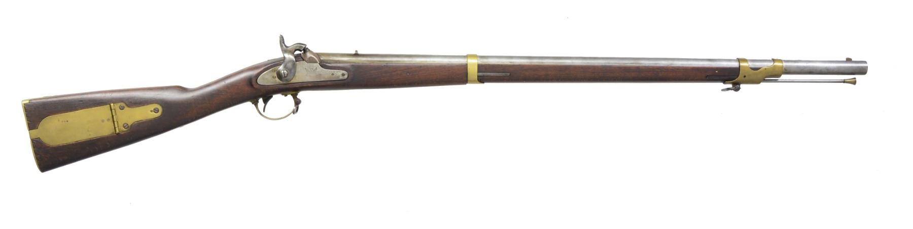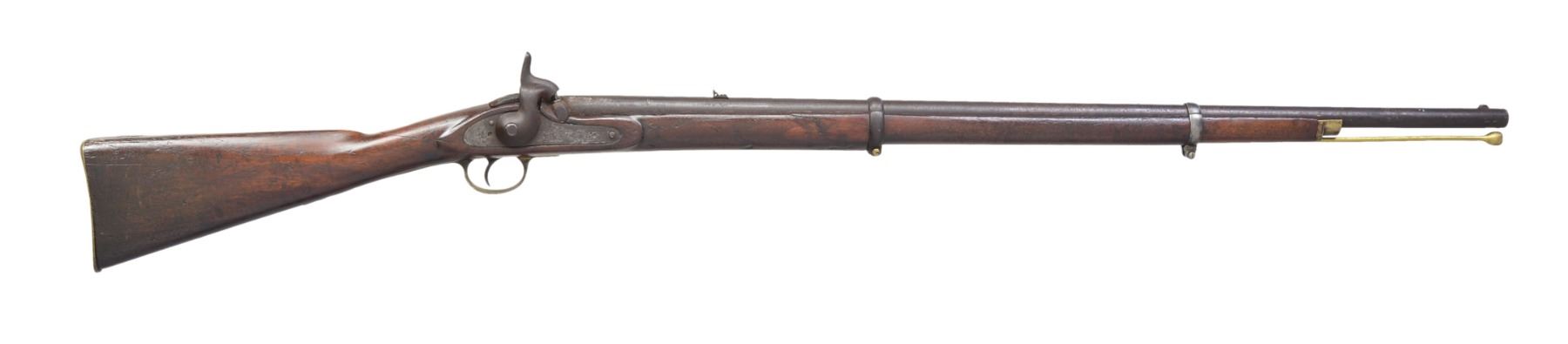 1) Cal. About 62 smoothbore. Famous “M” rifle, for many years these were thought to be Confederate but more recent research has concluded they were made in New York by Moore. Lock is dated 1861 w/ Eagle over shield w/ “M”; 35” bbl. was once rifled. CONDITION: fair to good overall metal is dark, front band, nosecap, & rats ramrod are added, stock has been refinished w/ rounded edges; mechanically functional w/ smoothbore. 2) Cal 65. Enfield 2 band rifle w/ 33” smoothbore bbl. Bbl. has fixed rear sight & indiscernible markings Lethbridge, the lock is unmarked, probably British colonial. CONDITION: fair to good overall. Front band replaced w/ non infield band but as matching sling swivel to 1 in stock, mechanically functional w/ smoothbore. 3) Cal. 58. S# 5921. reproduction Mississippi rifle, standard configuration w/ 33" bbl. CONDITION: very good overall, excellent mechanics and bright shiny rifled bore. PROVENANCE: From the Estate of Ronald A. Katchuk. (01-16765(3)/JS). ALL ANTIQUE. $800-1,200.