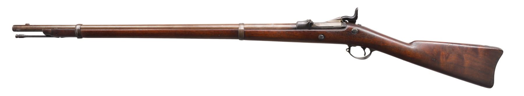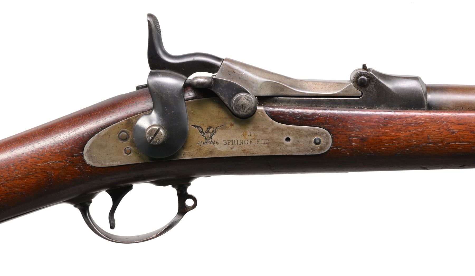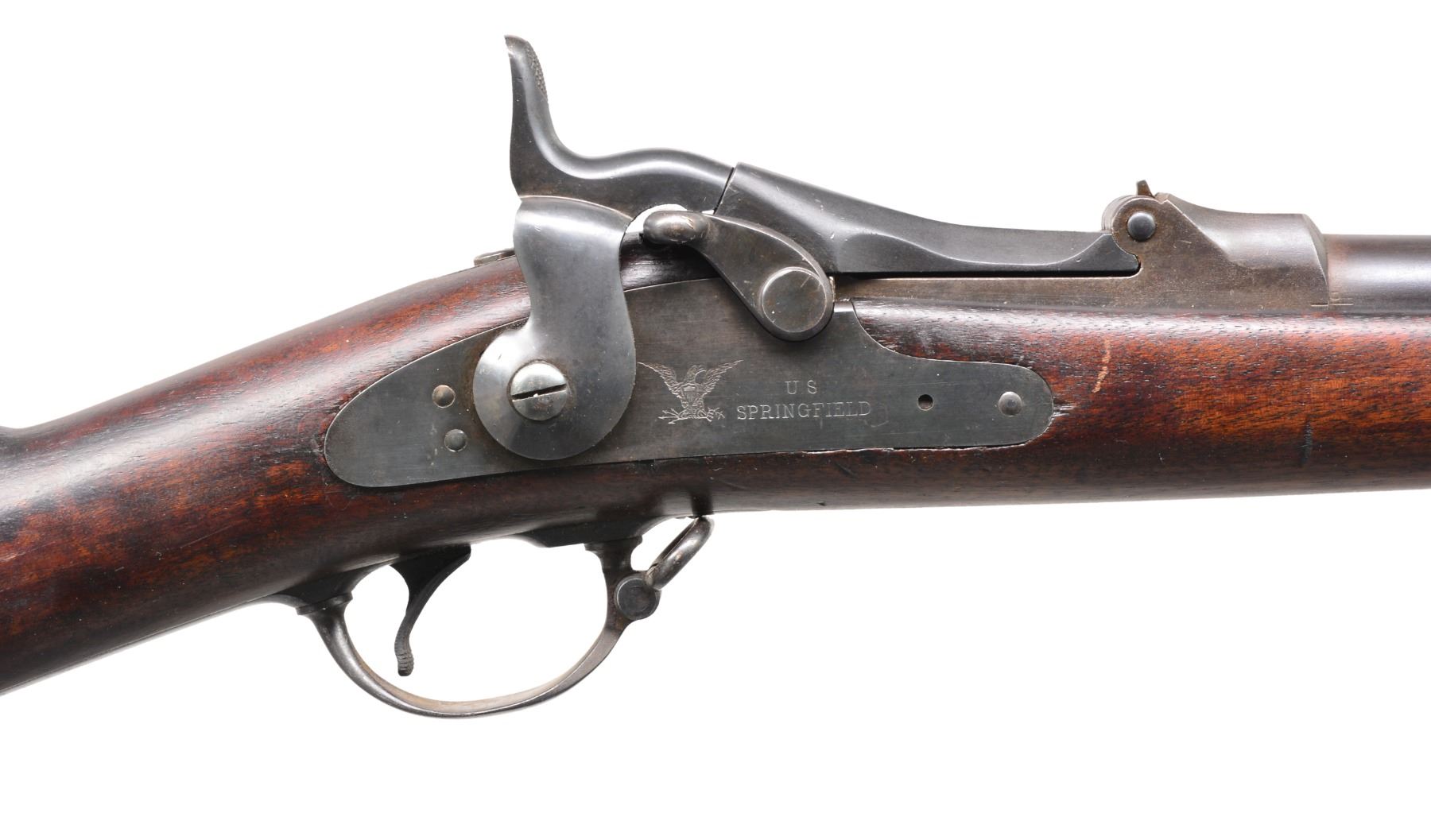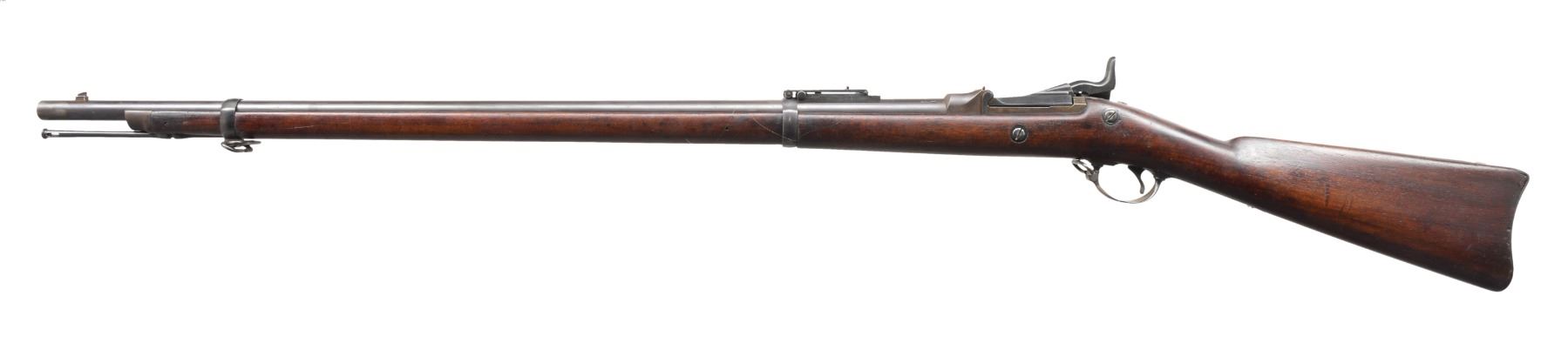 1) US SPRINGFIELD 1884 CADET TRAPDOOR RIFLE. Cal. 45-70. S# 499995. Bbl. 29 5/8". Lowered front sight, rear sight is removed. Replacement 1873 dated low arch breech block. Replacement 1873 short comb 2 band walnut stock. Slotted tipped iron ramrod. Bottom of stock below stock has hand cut initials "U.R.". Peak of buttplate is stamped "55". CONDITION: bbl., lockplate, trigger guard & breech block finish have faded gray coloration from touch up finish. Action retains 50% faded blue showing touch up. Hammer has 75% fading blue. Sanded & refinished stock shows scratches & marks. Bore retains sound rifling showing scattered spots of pitting. (01-17200/DS). 2) BELGIAN ZULU CONVERSION SINGLE SHOT SHOTGUN. Cal. 12 Ga. S# N591. Bbl. 34 1/4". Top of bbl. marked "ZULU". Conversion from musket using breech loading action. Breech block swings to right for loading. Stock is cut to single band sporter style. CONDITION: metal has mottled gray brown appearance showing areas of cleaning & light pitting. Stock has added varnish over dents & handling marks. Bore shows scattered spots of pitting. (01-17201/DS). 3) US SPRINGFIELD MODEL 1884 TRAPDOOR RIFLE. Cal. 45-70. S# 359949. Bbl. 32 5/8". Buffington rear sight. 1884 Dated low arch breech block. 2 Band walnut stock w/ sling swivels. Right side of stock has faintly visible cartouche w/ 1889 date. Slotted button tipped iron ramrod. CONDITION: bbl. & action have 80% dull blue fading to brown showing scattered spots of very light pitting. Lock & hammer retains 80% dull lightly faded blue. Sanded & refinished stock shows dents & handling marks. Bore is generally bright retaining sound rifling w/ scattered spots of pitting. (01-17202/DS). ALL ANTIQUE. $800-1,200.