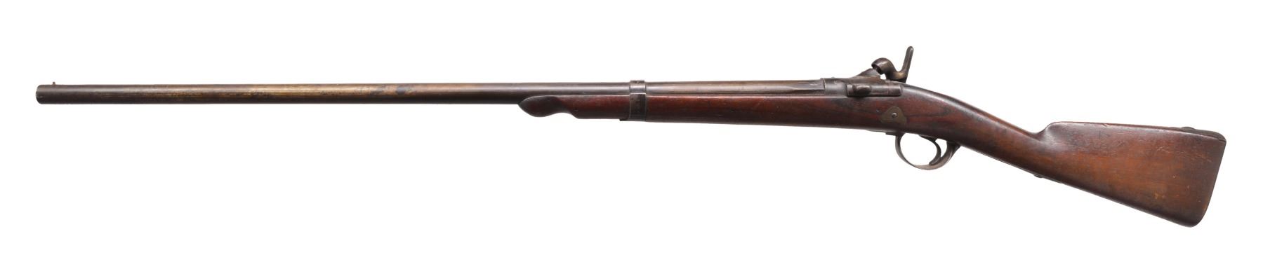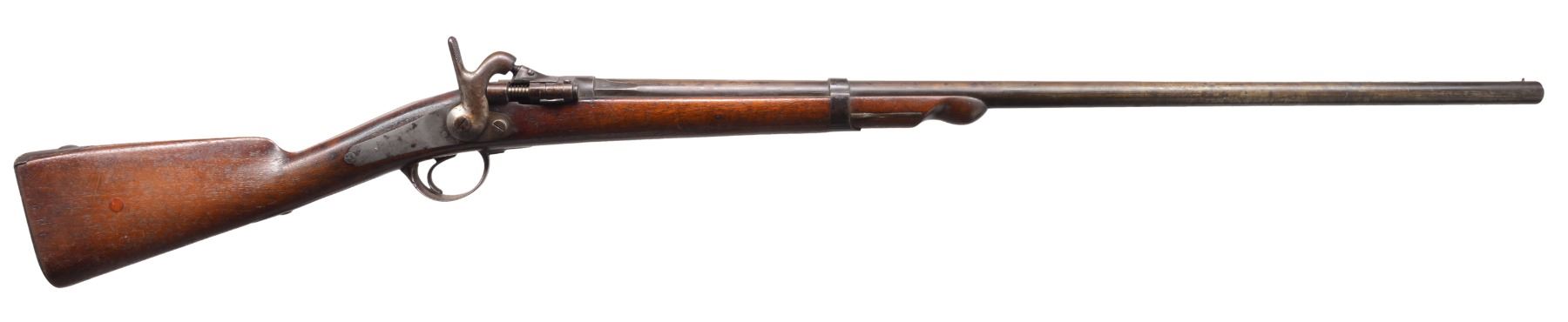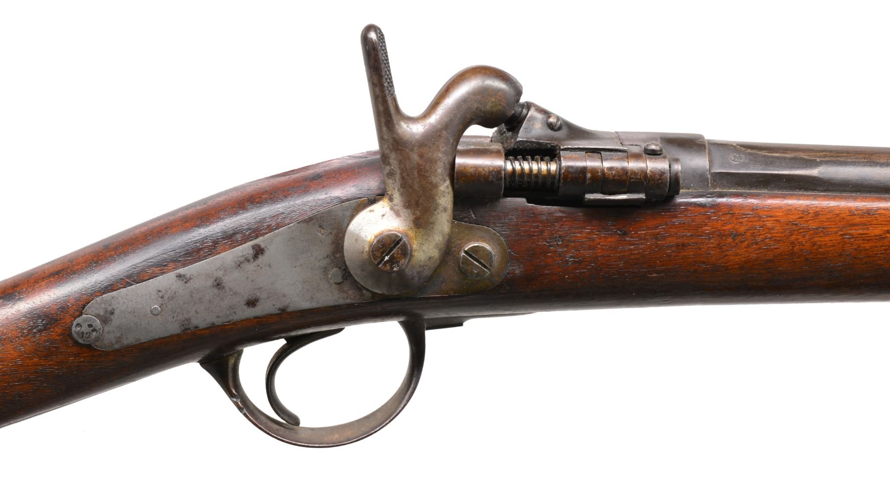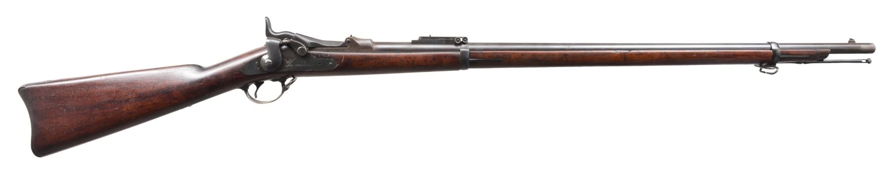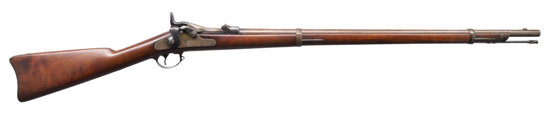 1) US SPRINGFIELD 1884 CADET TRAPDOOR RIFLE. Cal. 45-70. S# 499995. Bbl. 29 5/8". Lowered front sight, rear sight is removed. Replacement 1873 dated low arch breech block. Replacement 1873 short comb 2 band walnut stock. Slotted tipped iron ramrod. Bottom of stock below stock has hand cut initials "U.R.". Peak of buttplate is stamped "55". CONDITION: bbl., lockplate, trigger guard & breech block finish have faded gray coloration from touch up finish. Action retains 50% faded blue showing touch up. Hammer has 75% fading blue. Sanded & refinished stock shows scratches & marks. Bore retains sound rifling showing scattered spots of pitting. (01-17200/DS). 2) BELGIAN ZULU CONVERSION SINGLE SHOT SHOTGUN. Cal. 12 Ga. S# N591. Bbl. 34 1/4". Top of bbl. marked "ZULU". Conversion from musket using breech loading action. Breech block swings to right for loading. Stock is cut to single band sporter style. CONDITION: metal has mottled gray brown appearance showing areas of cleaning & light pitting. Stock has added varnish over dents & handling marks. Bore shows scattered spots of pitting. (01-17201/DS). 3) US SPRINGFIELD MODEL 1884 TRAPDOOR RIFLE. Cal. 45-70. S# 359949. Bbl. 32 5/8". Buffington rear sight. 1884 Dated low arch breech block. 2 Band walnut stock w/ sling swivels. Right side of stock has faintly visible cartouche w/ 1889 date. Slotted button tipped iron ramrod. CONDITION: bbl. & action have 80% dull blue fading to brown showing scattered spots of very light pitting. Lock & hammer retains 80% dull lightly faded blue. Sanded & refinished stock shows dents & handling marks. Bore is generally bright retaining sound rifling w/ scattered spots of pitting. (01-17202/DS). ALL ANTIQUE. $800-1,200.