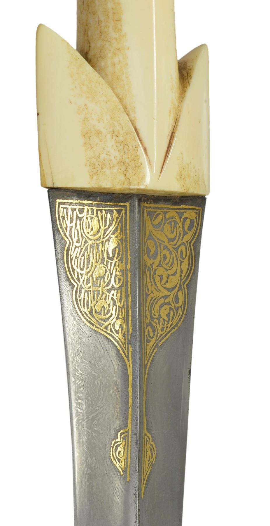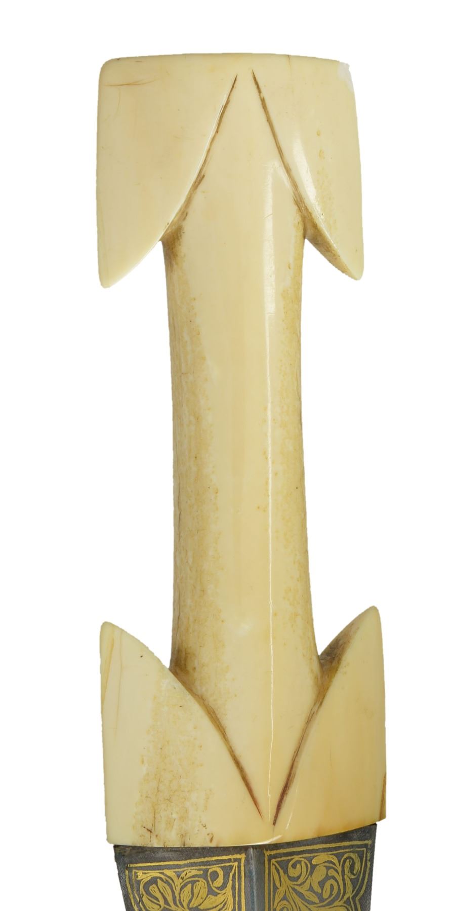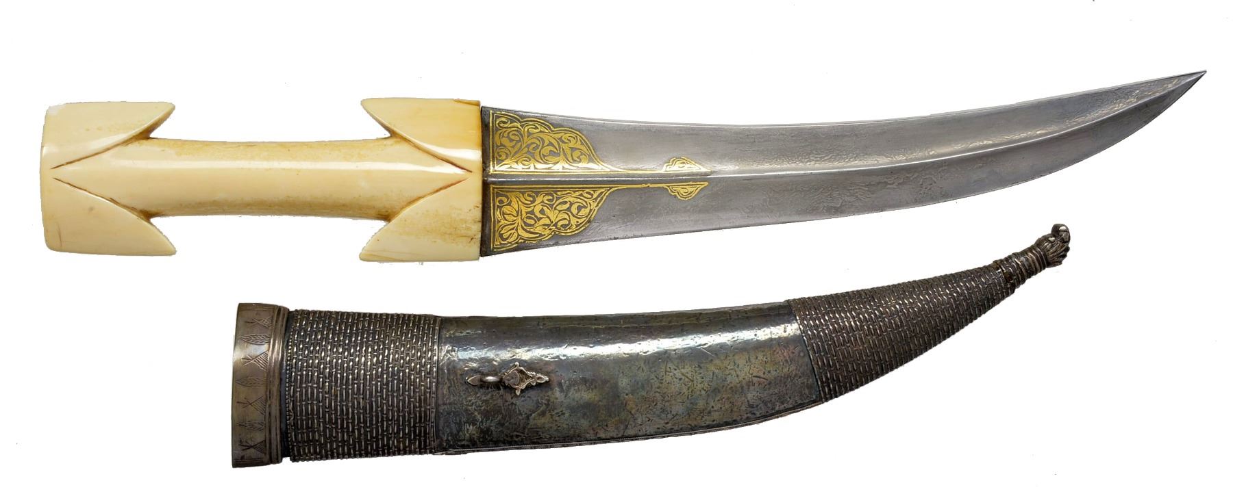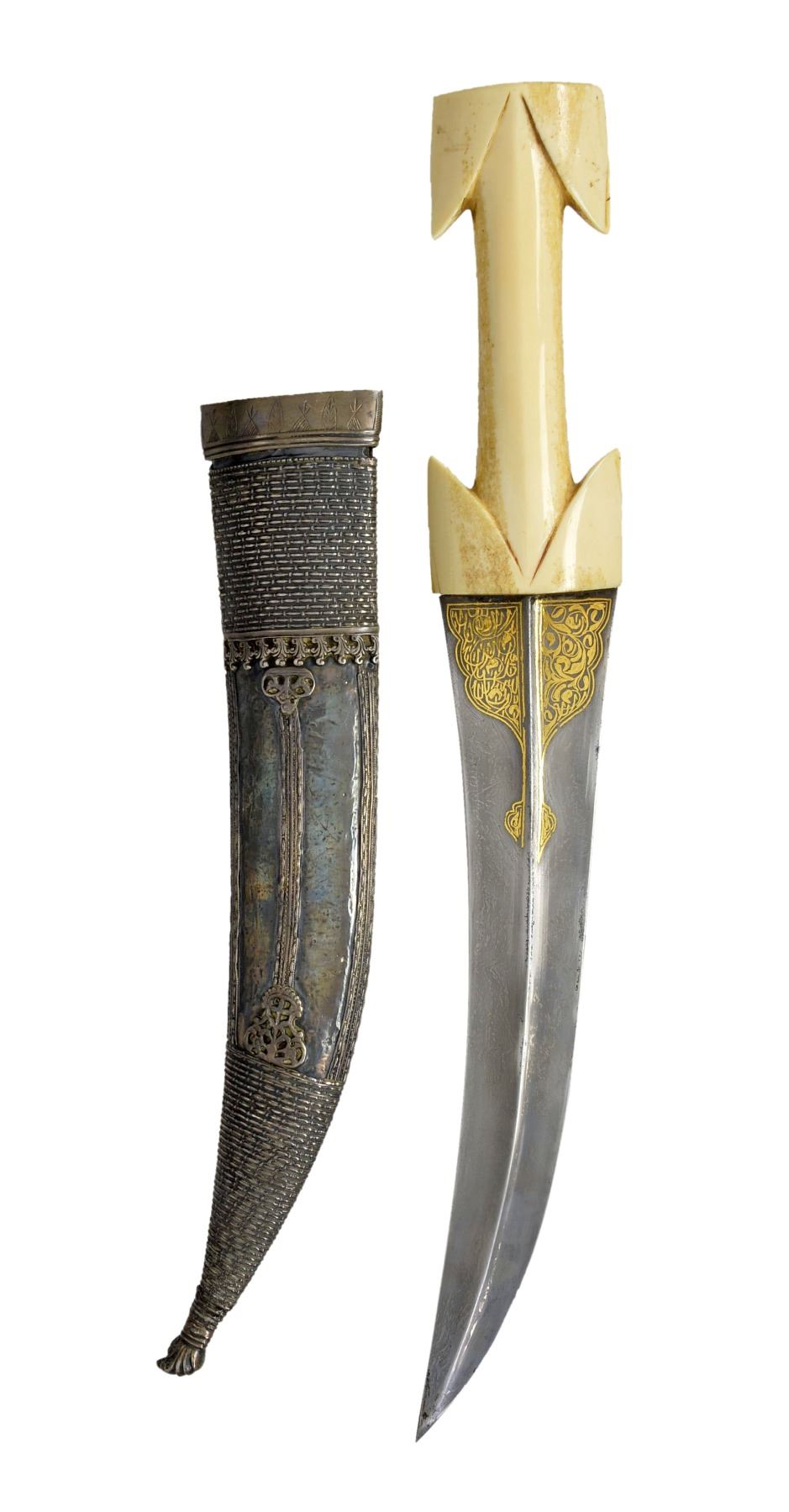 Overall length: 22". Blade length: 12 3/4". A truly artistic rendition of an Albanian jambiya, of the early to mid 1800s, showing influences from the Ottoman Empire. Blade has a pronounced medial ridge w/ gold inlaid Ottoman motifs near the hilt (see "Arms of the Paladins", pg. 29). 1 Piece walrus ivory hilt of classic, unembellished Albanian form. Wooden scabbard completely covered in tooled sheet silver w/ cast silver adornments. The Ottoman embellishments on this jambiya attest to the spread of Ottoman cultural influence across southeastern Europe. CONDITION: blade has a light gray cleaned finish. Gold inlays are complete. Hilt has a few very minor chips at the top of the pommel. Walrus ivory has a wonderful patina. Scabbard has a rich, dark patina over the silver. (02-13348/BF). $1,000-1,500.
