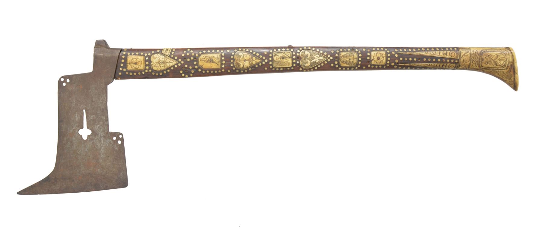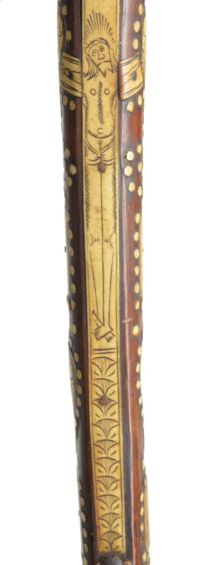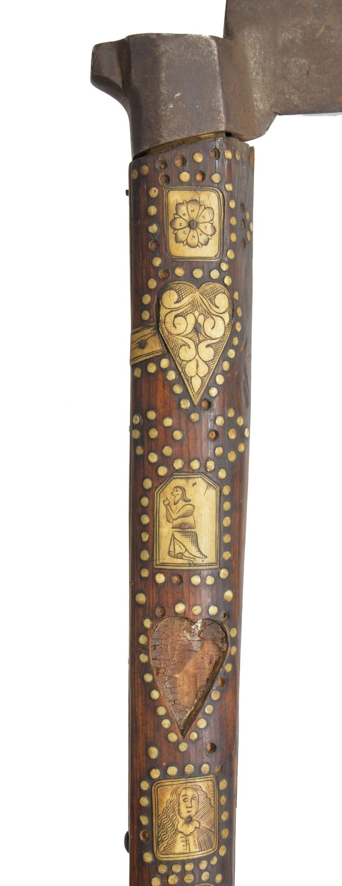 9.5 x 7” Iron head w/ piercings including cross mounted on 26” wood haft profusely inlaid w/ engraved staghorn panels & dots, the back edge w/ a depiction of Christ on the Cross, a lower panel w/ crossed pick & hammer bearing the date 1681. Very old “Fenton & Sons” label on butt. CONDITION: very good overall, haft has dried & several inlays loose, one heart shaped plaque missing & several dots, iron patina to head, head is loose & shimmed w/ paper. (02-13484/JS). $1,500-2,000.