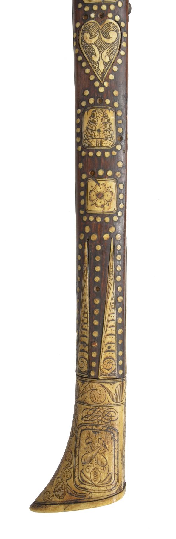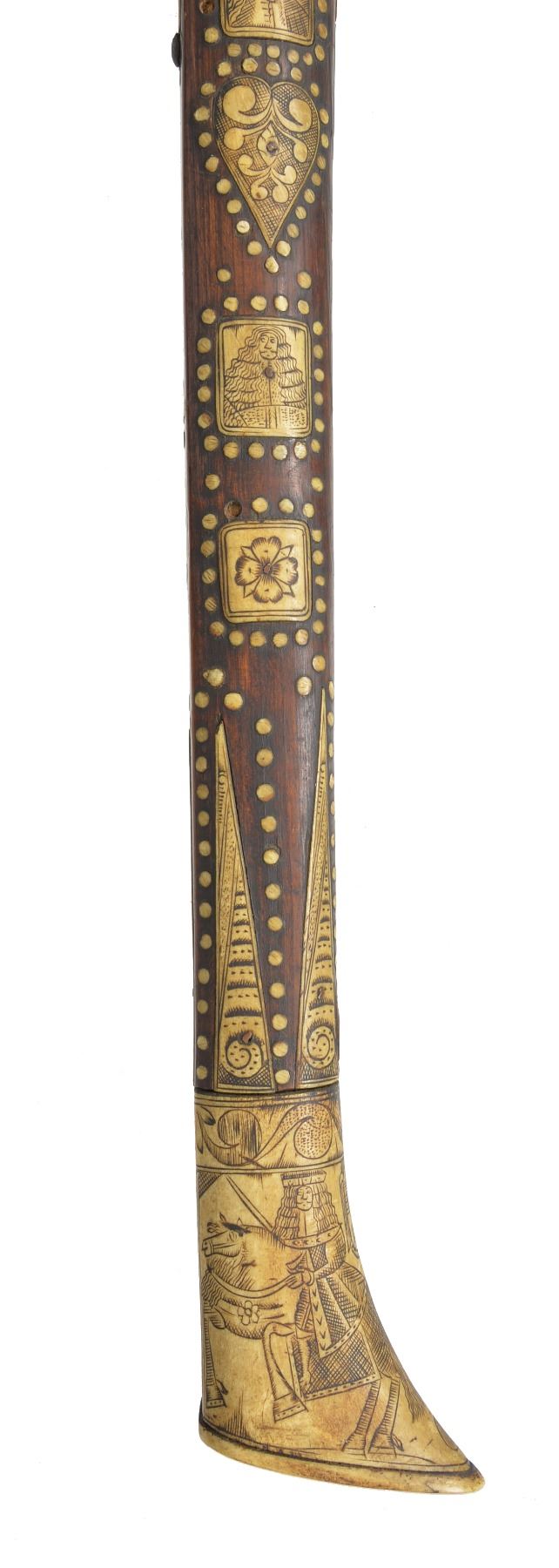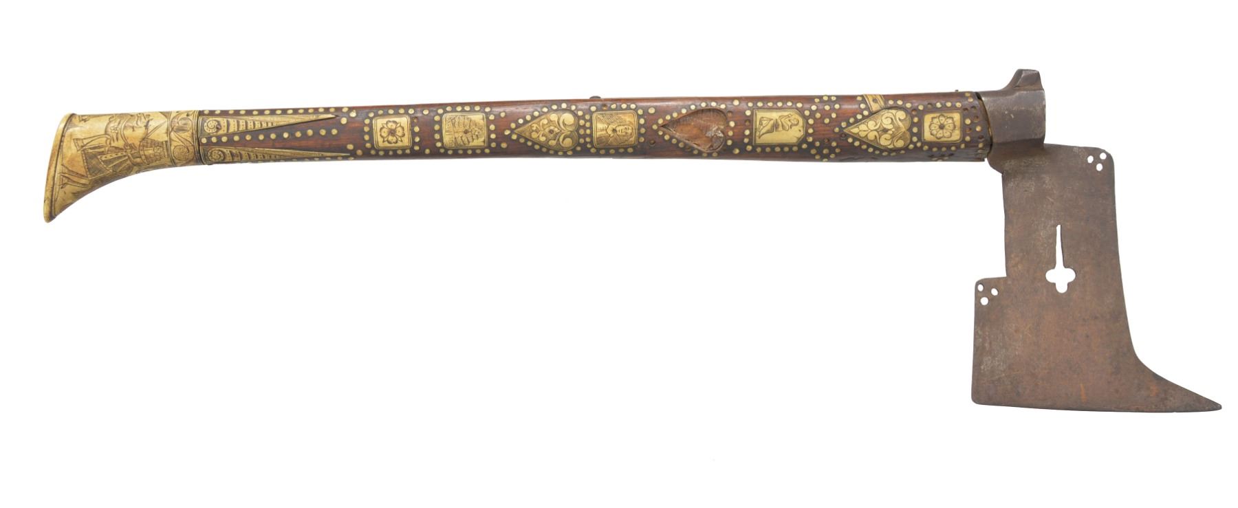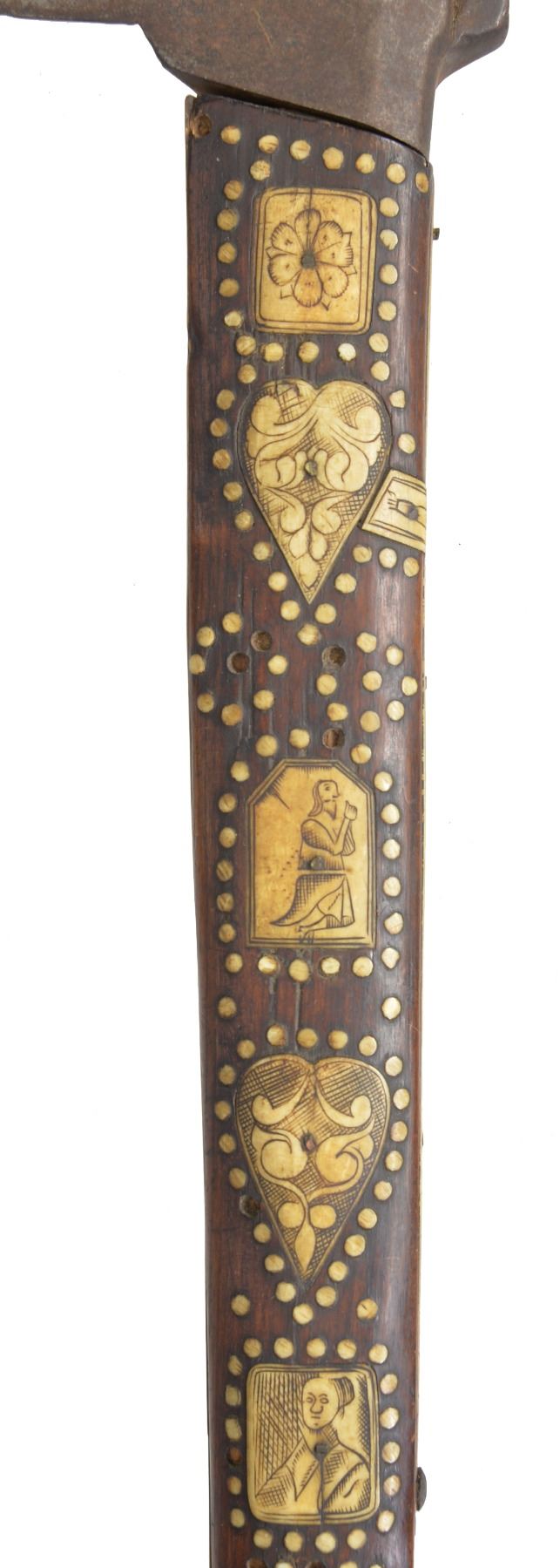 9.5 x 7” Iron head w/ piercings including cross mounted on 26” wood haft profusely inlaid w/ engraved staghorn panels & dots, the back edge w/ a depiction of Christ on the Cross, a lower panel w/ crossed pick & hammer bearing the date 1681. Very old “Fenton & Sons” label on butt. CONDITION: very good overall, haft has dried & several inlays loose, one heart shaped plaque missing & several dots, iron patina to head, head is loose & shimmed w/ paper. (02-13484/JS). $1,500-2,000.