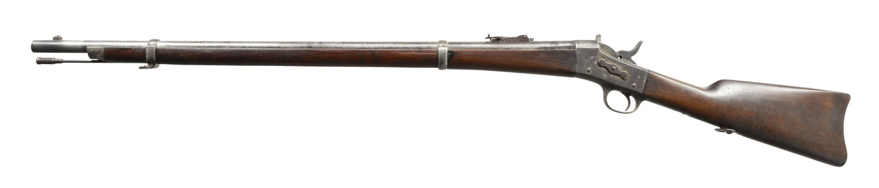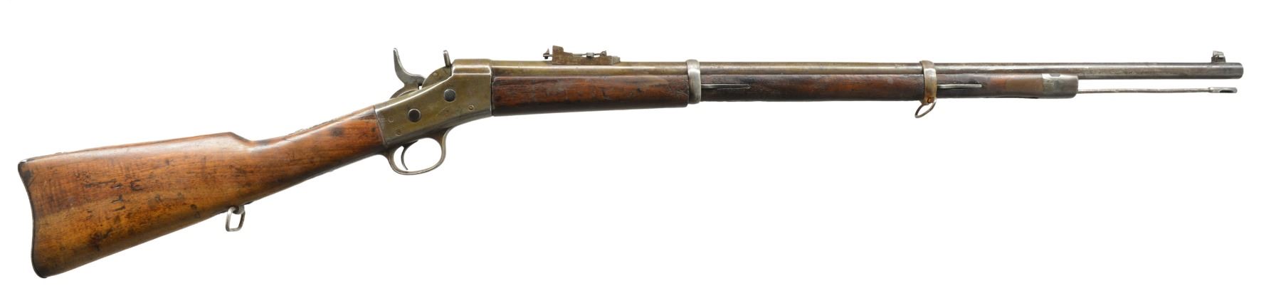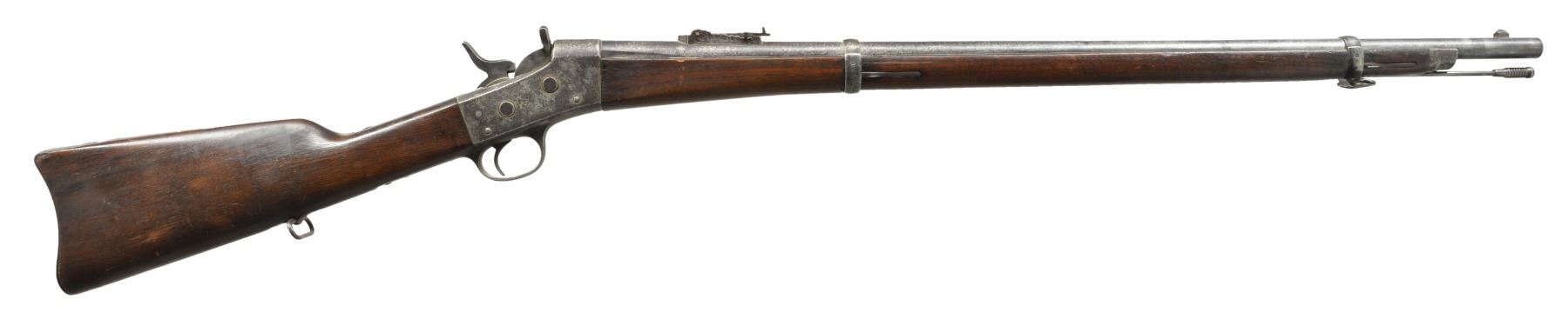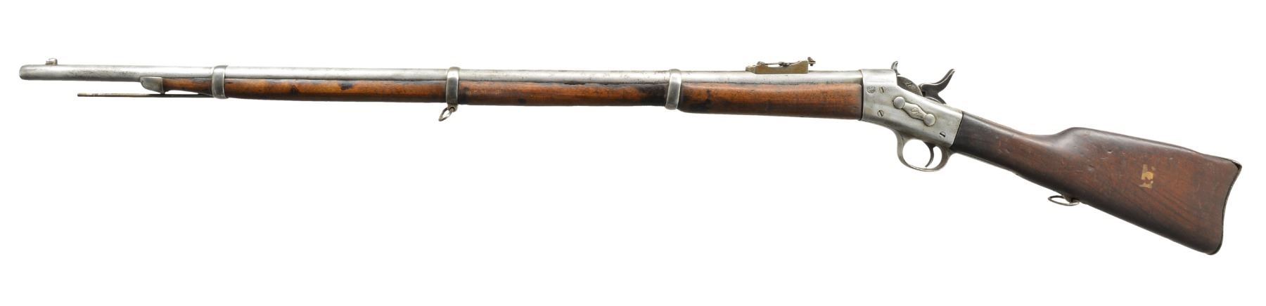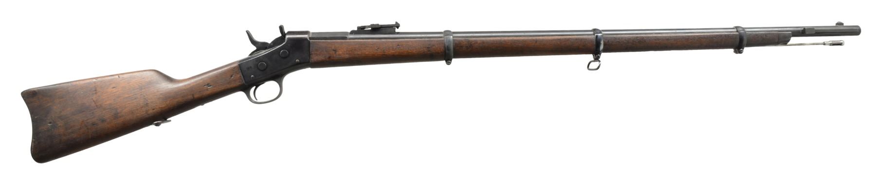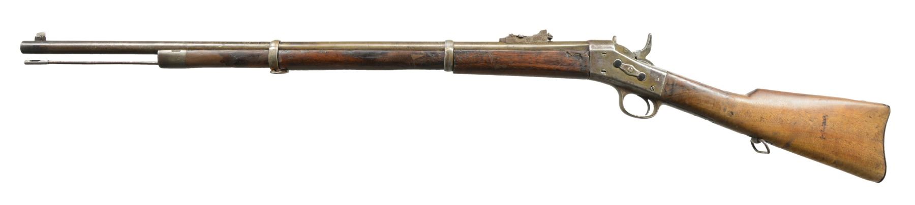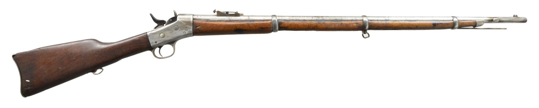 1) EGYPTIAN INFANTRY RIFLE. Cal. 43 Egyptian Remington. NSN. Bbl. 30 3/4" w/ Amheric markings at breech end. Military blade front sight & graduated leaf rear sight. 2 Band forearm w/ sling swivel & slotted tipped ramrod. Walnut musket stock w/ steel buttplate & sling swivels. Left side of stock has markings that appear to be "E/71". CONDITION: cleaned metal has gray coloration from touch up finish & scattered pitting. Stock & forearm show heavy wear & handling marks w/ numerous cracks, chips & areas of epoxy repair. Bore retains worn rifling w/ scattered pitting. (01-17635/DS) 2) EGYPTIAN RIFLE. Cal. 43 Egyptian Remington. S# 247. Bbl. 35" w/ right side bayonet lug, breech end has Amheric markings. Blade front sight. Graduated leaf military rear sight. Left side of receiver has "EP" over crescent moon Egyptian Police markings. Right side of receiver has "247". 3 Band forearm & walnut musket stock w/ sling swivels & steel buttplate. CONDITION: cleaned gray metal w/ areas of pitting. Heavily worn wood shows wear, dark spots, chips, sm. cracks, dents & handling marks. Cleaning rod is replaced w/ drill rod. Bore has worn rifling w/ spots of deep pitting. (01-17641/DS) 3) REMINGTON INFANTRY RIFLE. Cal. 50-70. NSN. Bbl. 31 1/4" w/ blade front sight & graduated leaf military rear sight. Tang has 3 line address, last patent date is March 18th, 1874. 2 Band forearm & musket walnut stock w/ sling swivels & steel buttplate. Slotted tip ramrod. CONDITION: metal finish has faded to mottled gray w/ light pitting. Stock & forearm retains good finish w/ scattered handling marks. Chips along ramrod chip & crack extending from buttplate peak. Bore retains lightly worn rifling showing scattered spots of pitting. (01-17667/DS). 4) REMINGTON 1879 ARGENTINE INFANTRY RIFLE. Cal. 43 Spanish (11.15x58mm). NSN. Bbl. 36" rnd. w/ oct. shank. Top flat is marked "MODELO ARGENTINO 1879 E". Blade front sight w/ graduated leaf military rear sight. Top tang has 3 line marking, last patent date March 18, 1874. 3 Band forearm & walnut musket stock w/ sling swivels & steel buttplate. Slotted tipped cleaning rod. Comb of stock is stamped "R". CONDITION: bbl. & action retains over 90% lightly faded reblued finish. Refinished stock & forearm show scattered dents, scratches & handling marks. Bore is generally bright retaining sound rifling. (01-17668/DS). ALL ANTIQUE. $900-1,500.