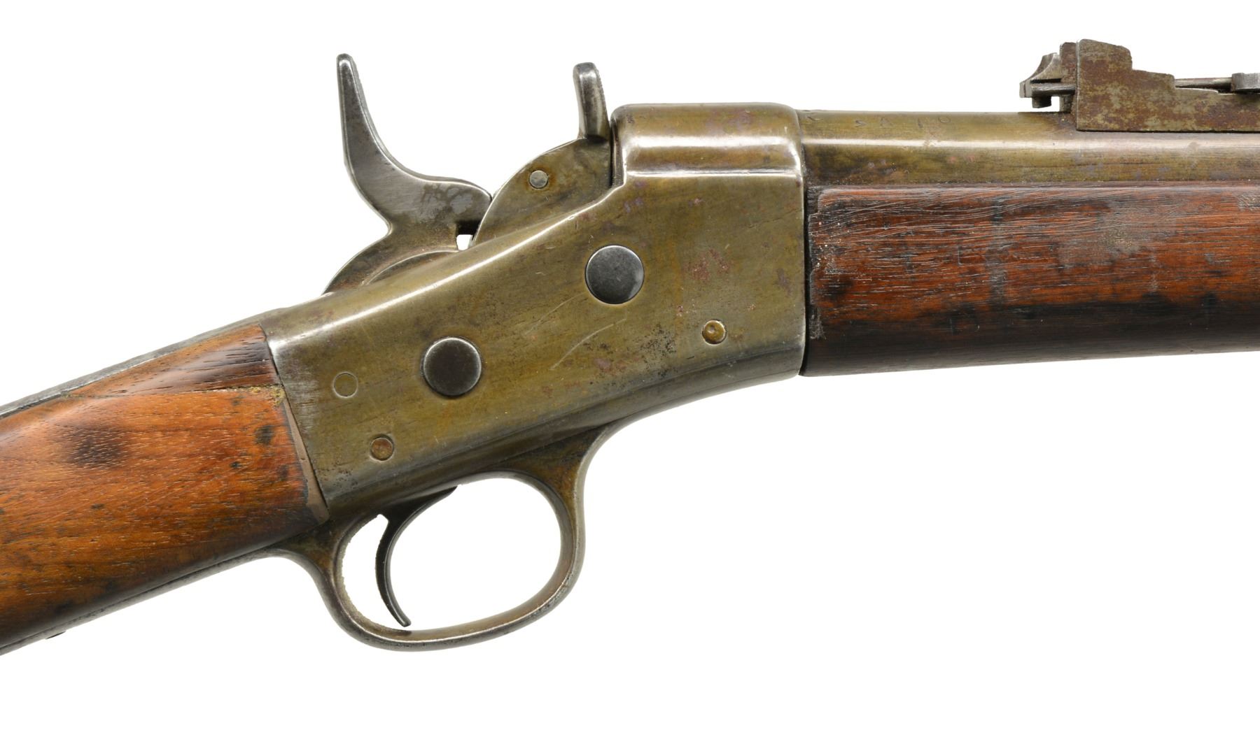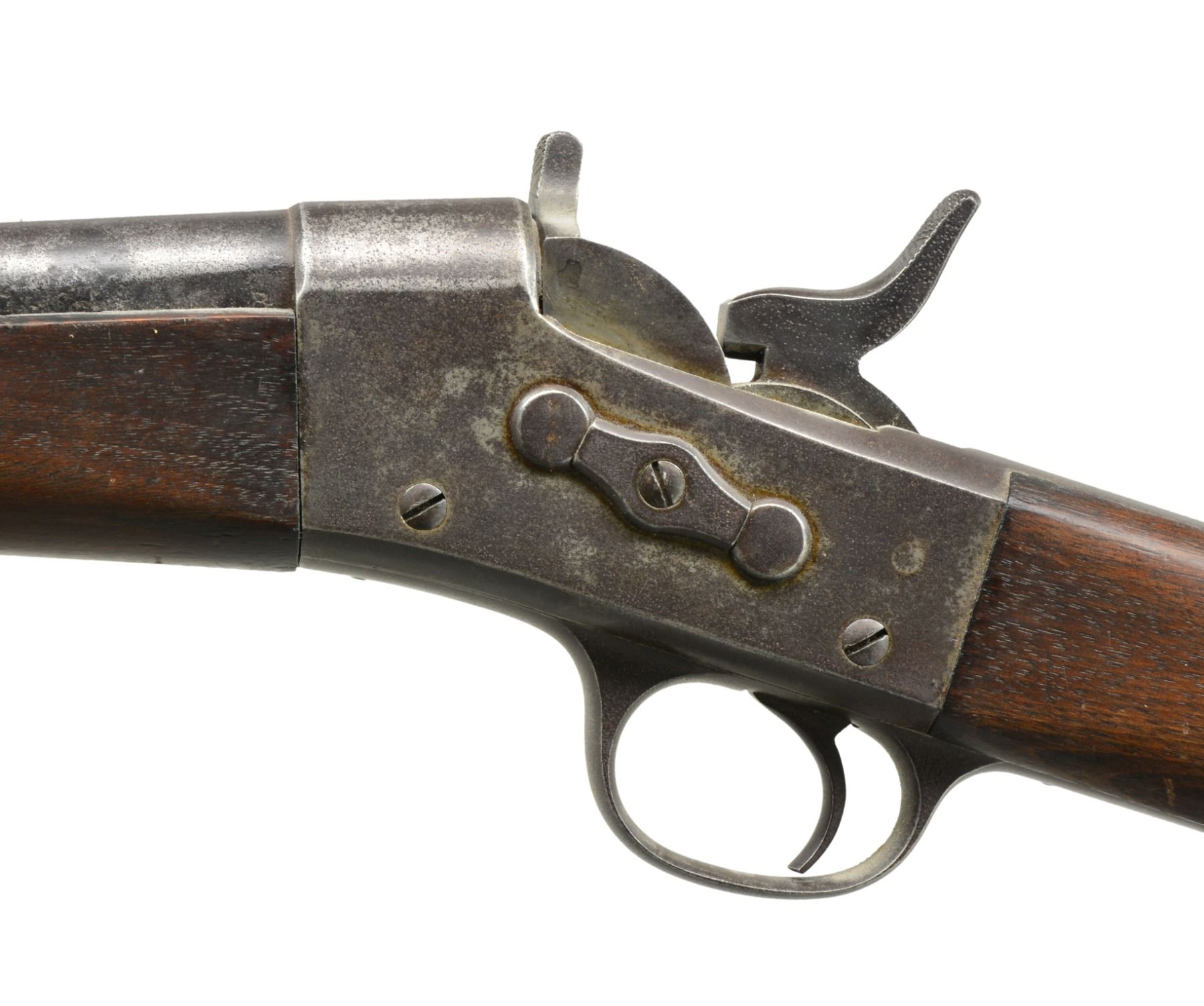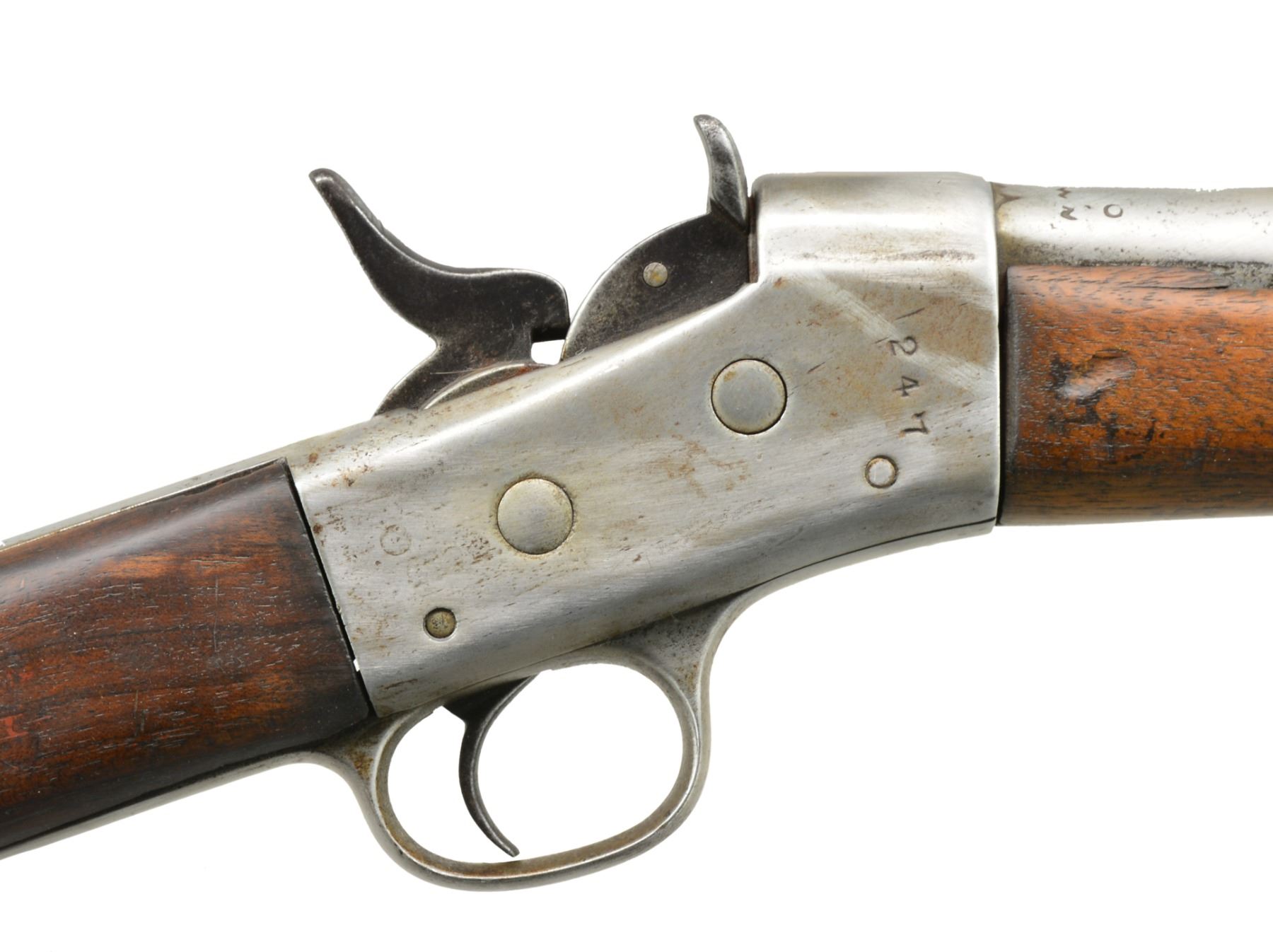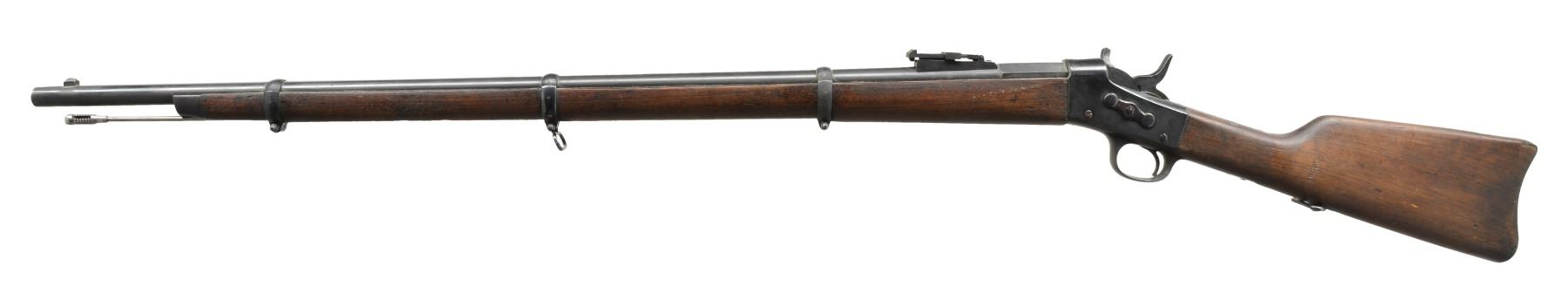 1) EGYPTIAN INFANTRY RIFLE. Cal. 43 Egyptian Remington. NSN. Bbl. 30 3/4" w/ Amheric markings at breech end. Military blade front sight & graduated leaf rear sight. 2 Band forearm w/ sling swivel & slotted tipped ramrod. Walnut musket stock w/ steel buttplate & sling swivels. Left side of stock has markings that appear to be "E/71". CONDITION: cleaned metal has gray coloration from touch up finish & scattered pitting. Stock & forearm show heavy wear & handling marks w/ numerous cracks, chips & areas of epoxy repair. Bore retains worn rifling w/ scattered pitting. (01-17635/DS) 2) EGYPTIAN RIFLE. Cal. 43 Egyptian Remington. S# 247. Bbl. 35" w/ right side bayonet lug, breech end has Amheric markings. Blade front sight. Graduated leaf military rear sight. Left side of receiver has "EP" over crescent moon Egyptian Police markings. Right side of receiver has "247". 3 Band forearm & walnut musket stock w/ sling swivels & steel buttplate. CONDITION: cleaned gray metal w/ areas of pitting. Heavily worn wood shows wear, dark spots, chips, sm. cracks, dents & handling marks. Cleaning rod is replaced w/ drill rod. Bore has worn rifling w/ spots of deep pitting. (01-17641/DS) 3) REMINGTON INFANTRY RIFLE. Cal. 50-70. NSN. Bbl. 31 1/4" w/ blade front sight & graduated leaf military rear sight. Tang has 3 line address, last patent date is March 18th, 1874. 2 Band forearm & musket walnut stock w/ sling swivels & steel buttplate. Slotted tip ramrod. CONDITION: metal finish has faded to mottled gray w/ light pitting. Stock & forearm retains good finish w/ scattered handling marks. Chips along ramrod chip & crack extending from buttplate peak. Bore retains lightly worn rifling showing scattered spots of pitting. (01-17667/DS). 4) REMINGTON 1879 ARGENTINE INFANTRY RIFLE. Cal. 43 Spanish (11.15x58mm). NSN. Bbl. 36" rnd. w/ oct. shank. Top flat is marked "MODELO ARGENTINO 1879 E". Blade front sight w/ graduated leaf military rear sight. Top tang has 3 line marking, last patent date March 18, 1874. 3 Band forearm & walnut musket stock w/ sling swivels & steel buttplate. Slotted tipped cleaning rod. Comb of stock is stamped "R". CONDITION: bbl. & action retains over 90% lightly faded reblued finish. Refinished stock & forearm show scattered dents, scratches & handling marks. Bore is generally bright retaining sound rifling. (01-17668/DS). ALL ANTIQUE. $900-1,500.