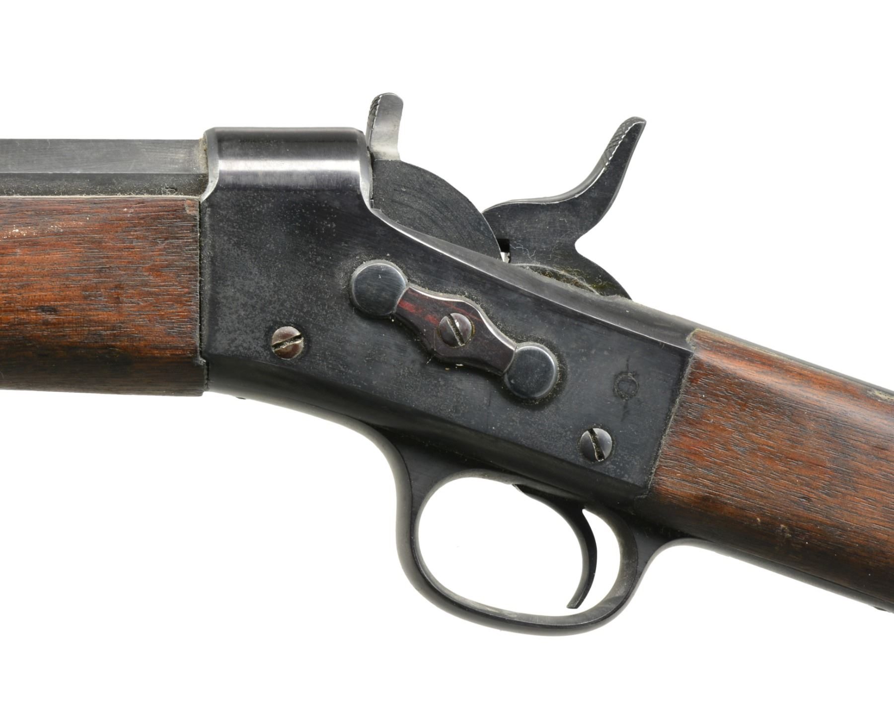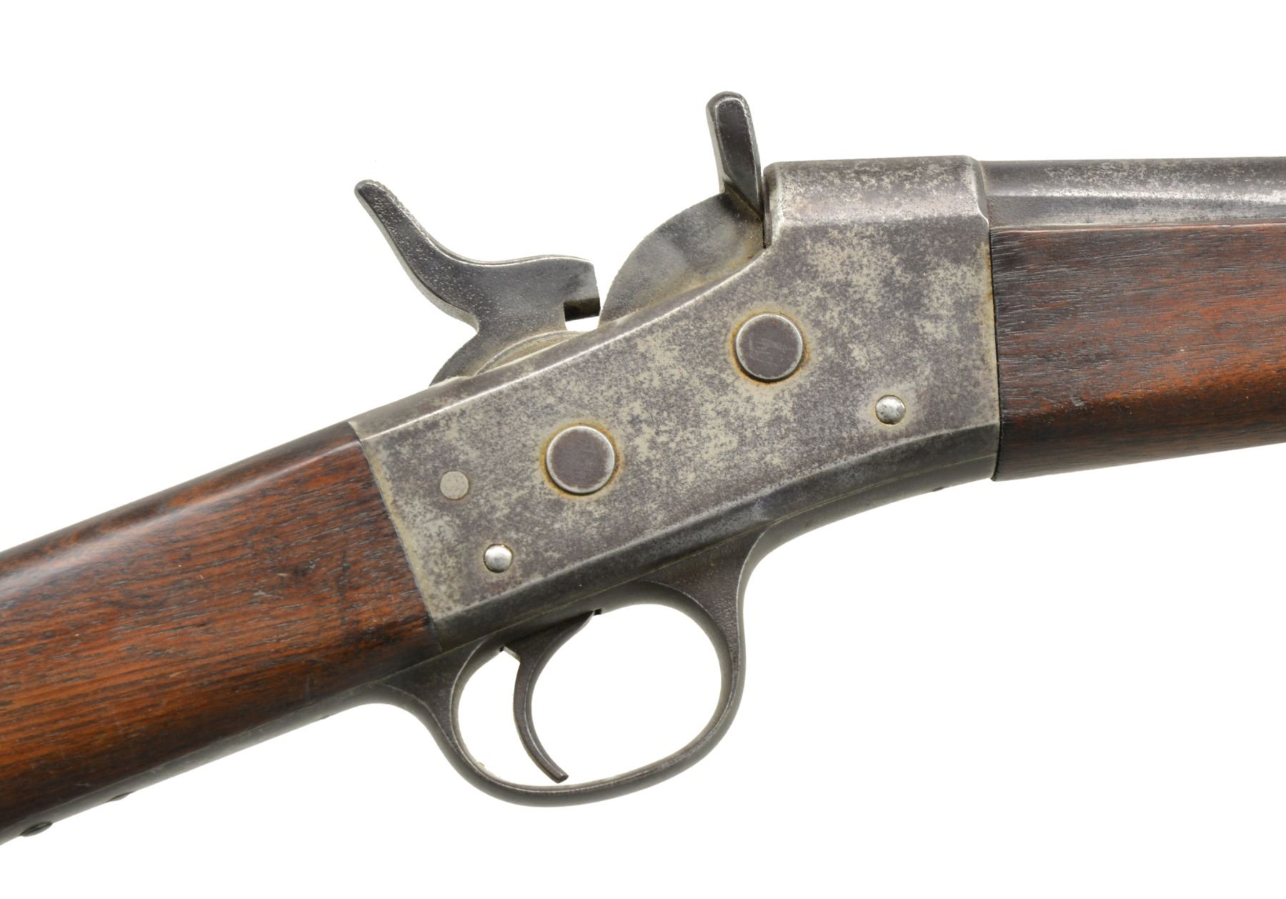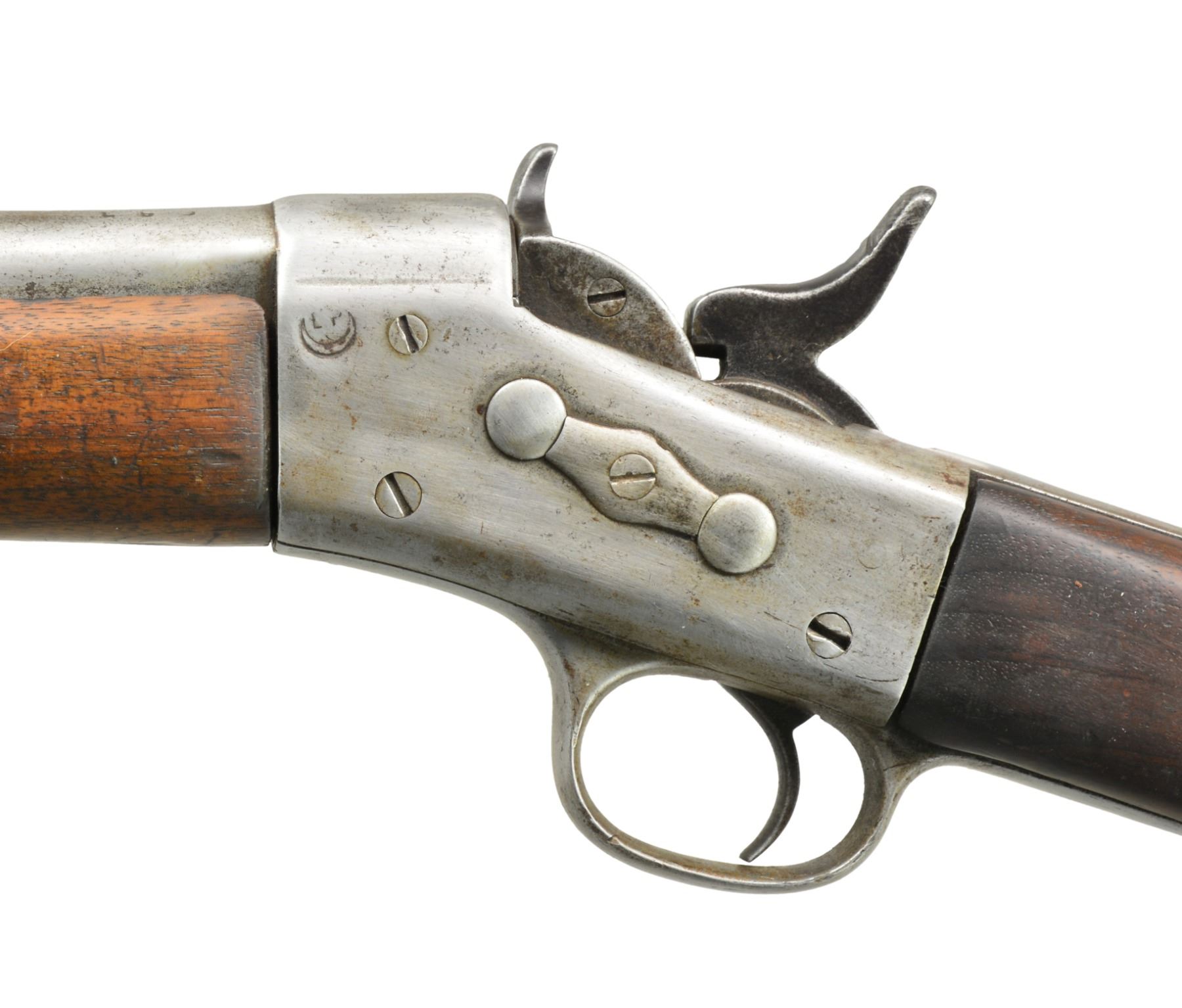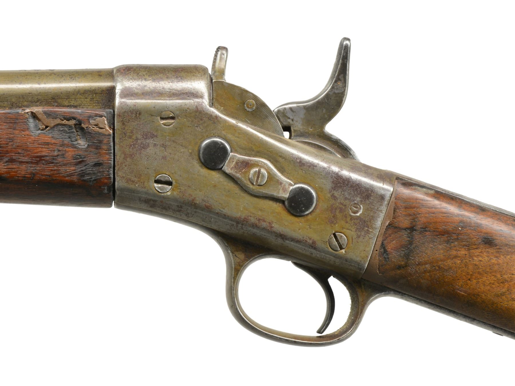 1) EGYPTIAN INFANTRY RIFLE. Cal. 43 Egyptian Remington. NSN. Bbl. 30 3/4" w/ Amheric markings at breech end. Military blade front sight & graduated leaf rear sight. 2 Band forearm w/ sling swivel & slotted tipped ramrod. Walnut musket stock w/ steel buttplate & sling swivels. Left side of stock has markings that appear to be "E/71". CONDITION: cleaned metal has gray coloration from touch up finish & scattered pitting. Stock & forearm show heavy wear & handling marks w/ numerous cracks, chips & areas of epoxy repair. Bore retains worn rifling w/ scattered pitting. (01-17635/DS) 2) EGYPTIAN RIFLE. Cal. 43 Egyptian Remington. S# 247. Bbl. 35" w/ right side bayonet lug, breech end has Amheric markings. Blade front sight. Graduated leaf military rear sight. Left side of receiver has "EP" over crescent moon Egyptian Police markings. Right side of receiver has "247". 3 Band forearm & walnut musket stock w/ sling swivels & steel buttplate. CONDITION: cleaned gray metal w/ areas of pitting. Heavily worn wood shows wear, dark spots, chips, sm. cracks, dents & handling marks. Cleaning rod is replaced w/ drill rod. Bore has worn rifling w/ spots of deep pitting. (01-17641/DS) 3) REMINGTON INFANTRY RIFLE. Cal. 50-70. NSN. Bbl. 31 1/4" w/ blade front sight & graduated leaf military rear sight. Tang has 3 line address, last patent date is March 18th, 1874. 2 Band forearm & musket walnut stock w/ sling swivels & steel buttplate. Slotted tip ramrod. CONDITION: metal finish has faded to mottled gray w/ light pitting. Stock & forearm retains good finish w/ scattered handling marks. Chips along ramrod chip & crack extending from buttplate peak. Bore retains lightly worn rifling showing scattered spots of pitting. (01-17667/DS). 4) REMINGTON 1879 ARGENTINE INFANTRY RIFLE. Cal. 43 Spanish (11.15x58mm). NSN. Bbl. 36" rnd. w/ oct. shank. Top flat is marked "MODELO ARGENTINO 1879 E". Blade front sight w/ graduated leaf military rear sight. Top tang has 3 line marking, last patent date March 18, 1874. 3 Band forearm & walnut musket stock w/ sling swivels & steel buttplate. Slotted tipped cleaning rod. Comb of stock is stamped "R". CONDITION: bbl. & action retains over 90% lightly faded reblued finish. Refinished stock & forearm show scattered dents, scratches & handling marks. Bore is generally bright retaining sound rifling. (01-17668/DS). ALL ANTIQUE. $900-1,500.