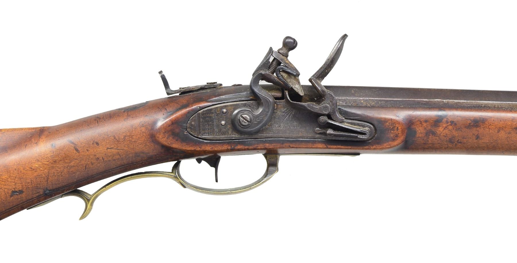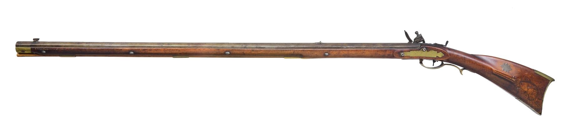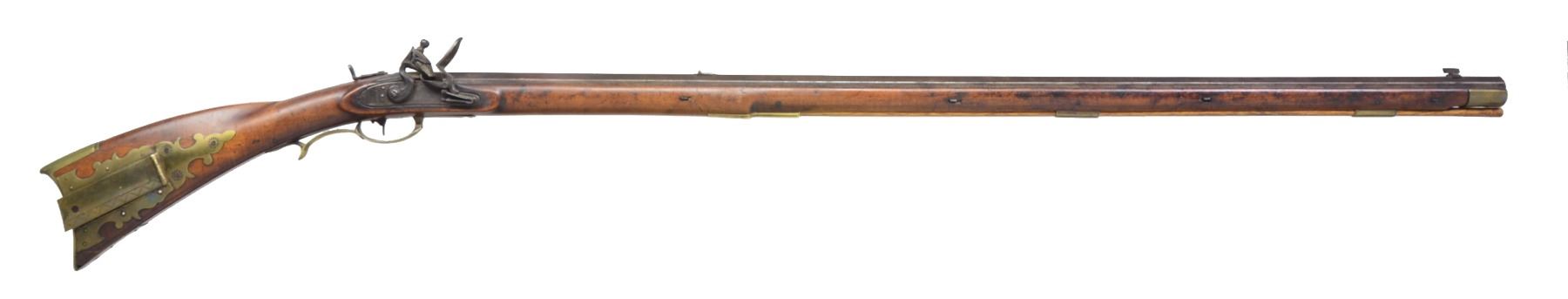 Cal. 50. NSN. Bbl. 41 1/2" oct. measuring 7/8" across flats at muzzle. Dovetail mounted replacement blade front sight w/ fixed V notch rear sight w/ added ghost ring tang sight. Engraved trade lock marked "R.A. PARRISH" . Plain trigger. Full length maple stock held by 4 keys. Stock has Roman nose style comb as produced in Schulkill County PA & surrounding area. Toeline & ramrod channel are bordered by incise carving. Cheekpiece has 4 carved grooves. Foliate scroll carving is found between cheekpiece & buttplate. Brass furniture consists of engraved segmented rectangular lid patchbox, crescent buttplate, toeplate, finger rest trigger guard, sideplate & nose cap. German silver 8 point star is above the cheekpiece. Top of wrist has cutout for missing heart shape inlay. Hickory ramrod is held by brass thimble & 2 brass pipes. CONDITION: bbl. & lock have dark patina appearance w/ pitting in breech area. Bbl. shows some wrench marks. Stock shows wear w/ scratches & handling marks having sm. cracks & chips around sideplate, lock & key escutcheon areas. Toe of stock shows cracks & chips. Brass shows evidence of past cleaning. Bore is dark w/ intact rifling showing some very light pitting. (01-17462/DS). ANTIQUE. $1,200-1,500.