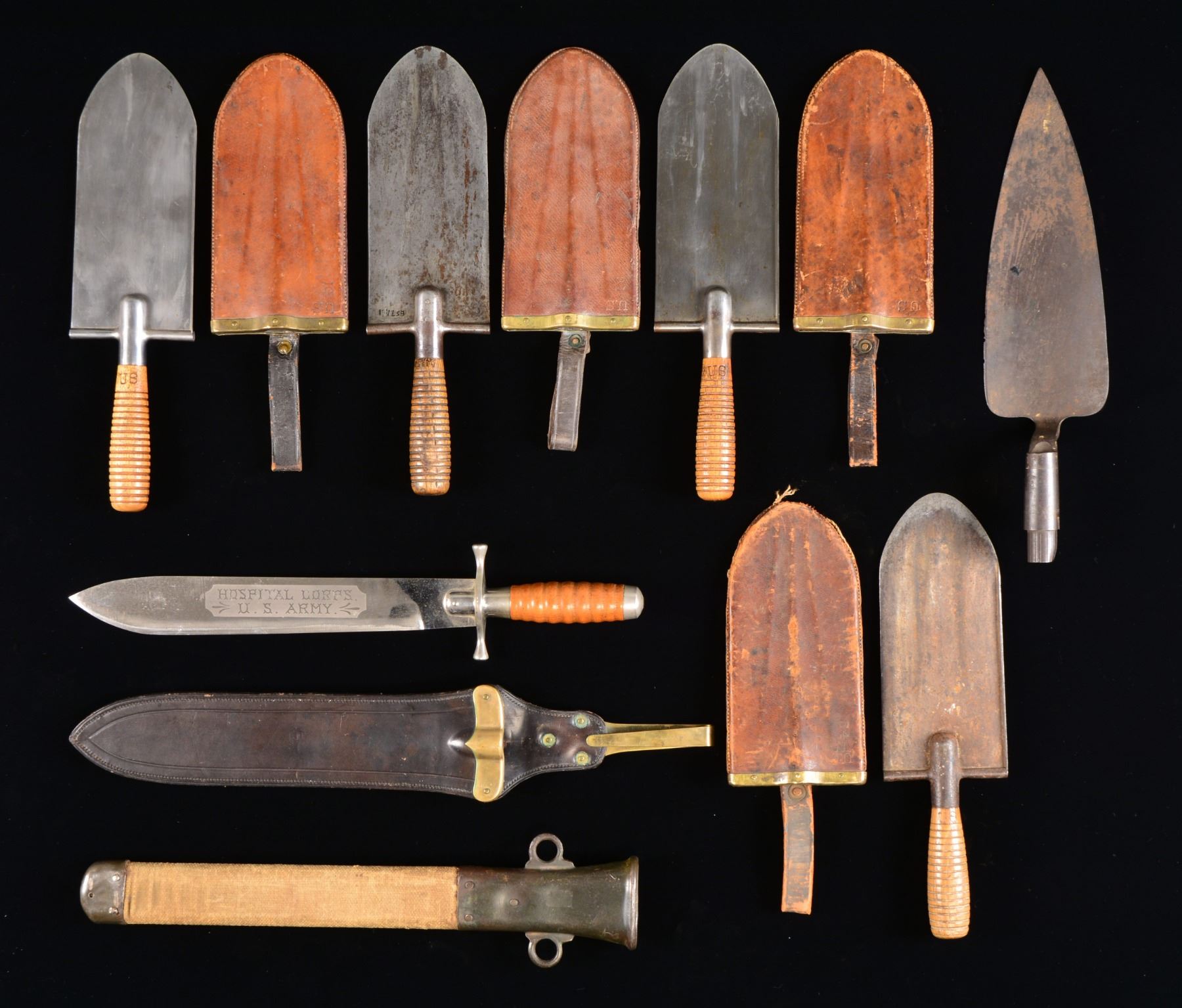 SCABBARD. 1) MODEL 1873 HAGNER ENTRENCHING TOOL. 8” Blade. Hardwood handle 4 1/4”. Blade unmarked, handle stamped “US”. Leather scabbard marked “US” at top right corner & marked “10”. Leather belt loop. CONDITION: tool has been polished leaving scattered sm. pits. Handle has been refinished. Leather scabbard has light wear, scuffing w/ tight stitching. 2) MODEL 1873 HAGNER ENTRENCHING TOOL. 8” Blade retained by 2 rivets. Blade is marked in electro pencil “ES71?1” on top right corner. Hardwood handle has faint US marking & added inked marking “A1352E5715.1”, possible museum inventory numbers. Correct leather scabbard w/ brass throat. Scabbard is marked “US” & “31” on top right corner. Also marked on back w/ “8” inventory number. CONDITION: tool has scattered patina, oxidation & very fine pitting throughout. Handle has wear, scratches & several cracks. Scabbard w/ scuffing & tight stitching. 3) MODEL 1873 HAGNER ENTRENCHING TOOL. 8” Blade attached by 1 rivet. Grooved hardwood handle marked “US”. Brown leather scabbard w/ brass throat marked “US” & “32” in upper right corner. CONDITION: metal has scattered spots of fine pitting w/ wear & staining. Handle has light wear & staining throughout. Scabbard has wear, flexing & scuffing. Stitching is tight. 4) MODEL 1873 HAGNER ENTRENCHING TOOL. 8” Blade. Hardwood handle marked “US”. Leather scabbard w/ brass throat marked “US” & “54”. CONDITION: scabbard has wear, flexing & scuffing. Stitching around tip is loose or missing. Metal has turned patina w/ oxidation & fine pitting throughout. Worn handle has several cracks including 1 full length crack on reverse side. 5) MODEL 1887 US HOSPITAL CORPS. KNIFE. 12” Single edge blade has etched “HOSPITAL CORPS. U.S. ARMY.” on left side. Turned hardwood handle w/ nickel plated brass cap. Plated brass crossguard. Later type black leather scabbard w/ brass throat & brass belt hangar. Belt hangar is marked on reverse side “RIA”. Scabbard w/ crisp legible lettering “ROCK ISLAND ARSENAL W.T.G J.L.”. Scabbard is in very nice condition showing little wear, tight stitch, brass turning into pleasing mustard color w/ sm. spot of verdigris. Bright finished knife has sm. spots of peppery oxidation throughout. Handle has light wear. Blade has appearance of light sharpening. 6) MODEL 1873 TROWEL SOCKET BAYONET ENTRENCHING TOOL. 10” Blade, 3 1/2” wide. No visible markings. Missing the locking piece on end of handle. CONDITION: bayonet has turned patina w/ oxidation & pitting throughout. Has approx. 6 1/4” crack in left side of blade. Sight slot is dented on both sides. 7) SHORTENED MODEL 1913 “PATTON” SABRE SCABBARD. Scabbard has shortened to approx. 16 1/4” w/ steel tip replaced. CONDITION: web covering shows wear, staining. Metal turning patina. Tip has grinding marks & crude riveting. (02-13681/RW). $700-1,000.