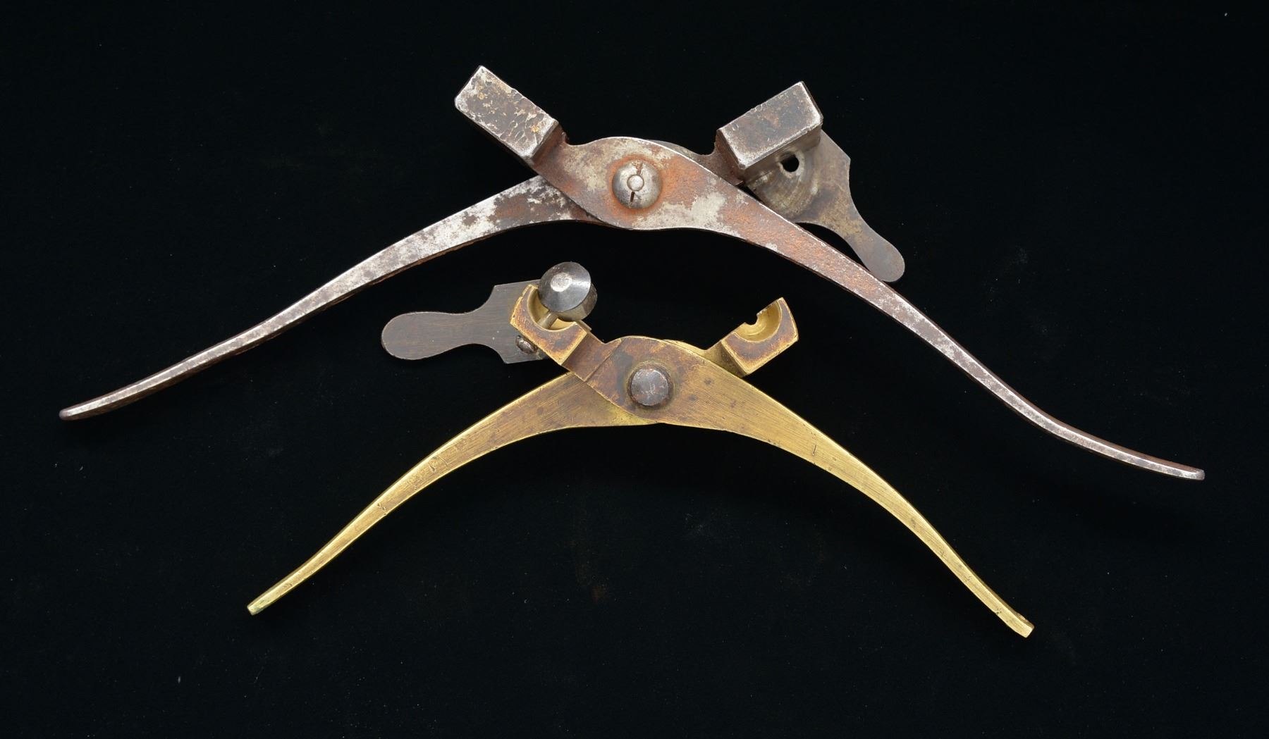 1) Brass .577 Enfield mold complete w/ plug & sprue cutter, no markings other than spurious "CSA". 2) Iron w/ cavity for a rare Brunswick ball elongated ball w/ 2 raised ribs. CONDITION: Enfield mold is very good to fine overall. Brunswick mold has clear cavity, is good overall w/ pitting & has partially discernable maker's mark on 1 arm under rust & pitting. PROVENANCE: Estate Collection of Dan Poppen. (02-13447-14/JS). $800-1,200.