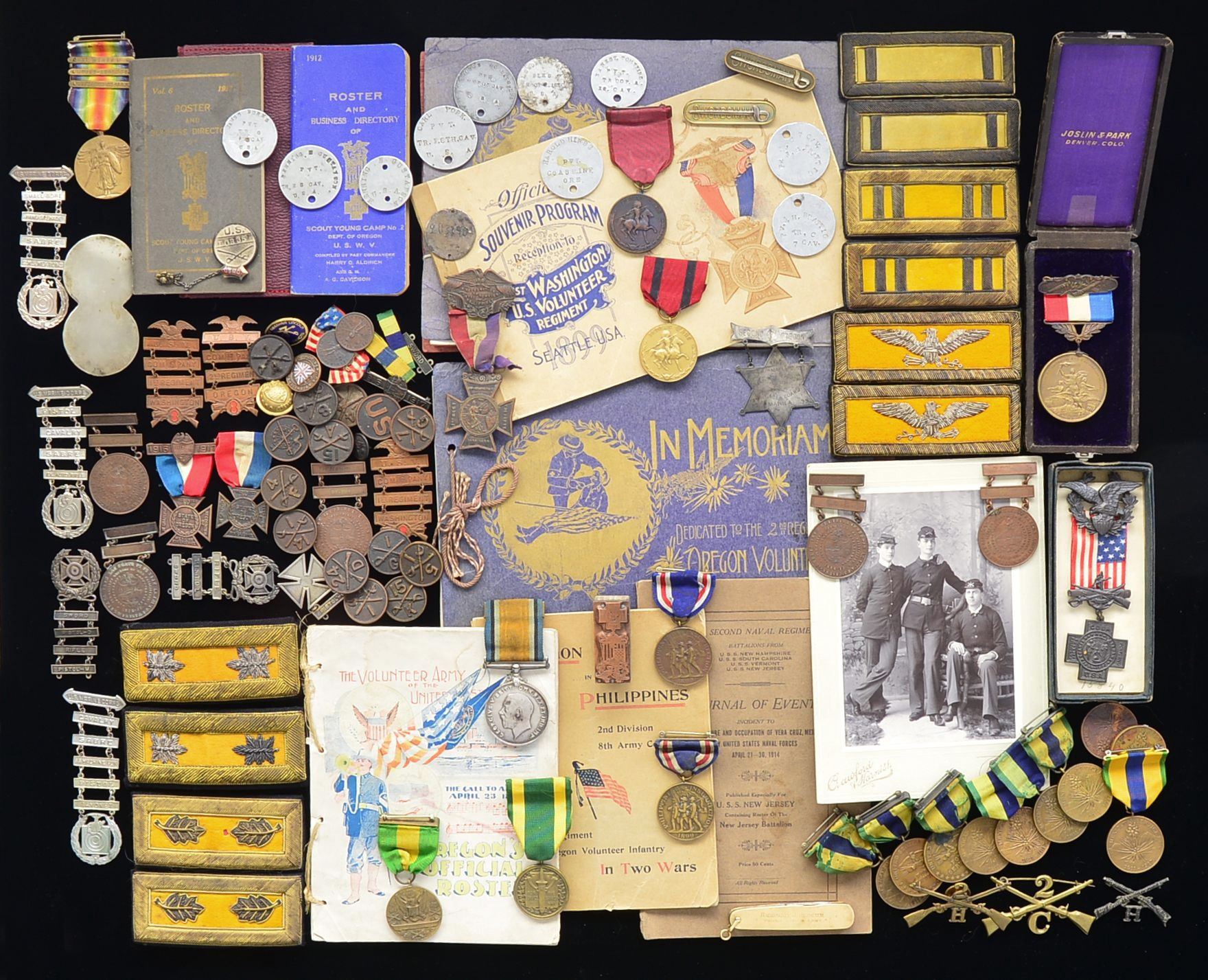 COLLAR DISKS, DOG TAGS & MORE. This lg. & varied lot consists of 13 WWI US collar disks from various units. / 10 WWI dog tags. / 3 Span-Am period crossed rifles insignia. / 7 Numbered US Mexican service medals 1911-1917 w/ ribbons. / 3 US Mexican service medals 1911-1917 planchet only. 2 Are numbered, 1 is not. / 5 Pair of circa 1900 cavalry shoulder straps. Ranks include 1st lieutenant, captain, major, lieutenant colonel & colonel. / 1 British WWI service medal. / 2 Spanish War service medals, 1 w/ number. / 2 Numbered Philippine insurrection medals. / 2 Indian Wars campaign medals, both of questionable age. / 2 Swordsman pins. / 3 Marine Corps proficiency badges. / 3 Army proficiency badges. / 1 WWI Victory medal. / 1 Gold plated pocket knife by George Wostenholm measuring 2 3/4" closed. / 1 Spanish War veteran’s medal. / 3 USV proficiency medals. / 4 Second Oregon UCV state service medals. / 2 Oregon border service medals. / 1 Washington Span-Am service medal. / 1 Colorado Span-Am service medal. / 1 Second Oregon Manila service medal. / A sm. misc. group of pins. / 1 Sm. Span-Am roster book of the 1st Reg. Washington Volunteer Infantry. / 1 Sm. roster book of Oregon war veterans. / 1 Souvenir program for Washington Volunteers. / 2 Sm. books dedicated to the Oregon 2nd Regiment. / 1 Sm. roster book of Oregon Span-Am volunteers. / 1 Sm. pamphlet titled “Oregon in the Philippines”. / 1 Sm. pamphlet titled “Journal of Events Veracruz 1914”. / 1 Card photo of circa 1898 Oregon Volunteers. CONDITION: as expected, condition of this group varies greatly. Most paper items show light wear. Ribbons on medals show moderate wear. Shoulder straps are solid but some show moth damage. Other items show expected light to moderate wear. (02-13700/BF). $1,000-2,000.