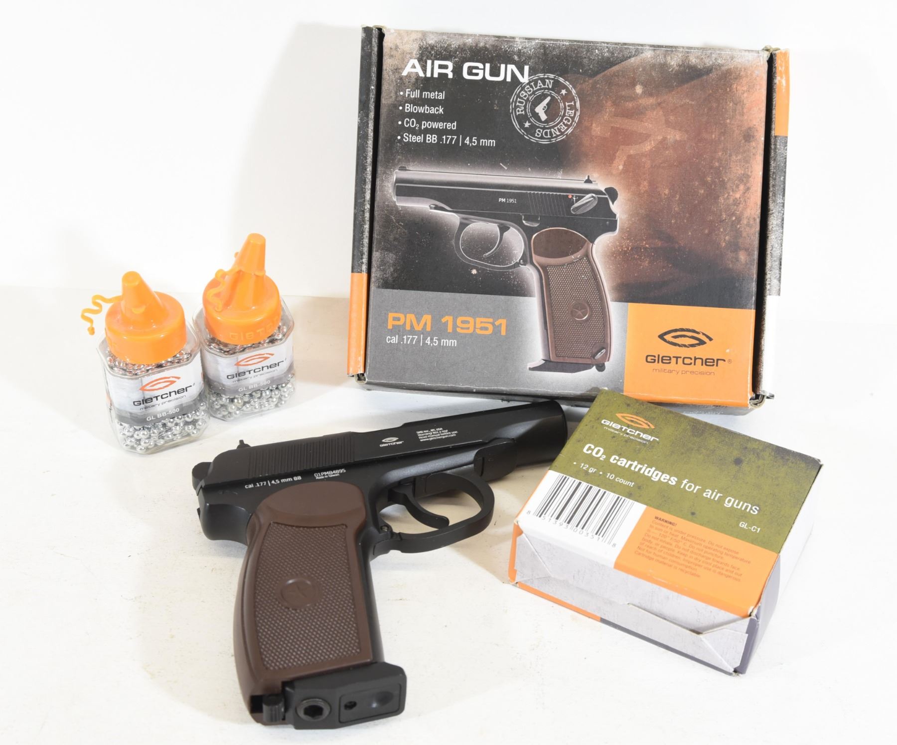 Gletcher PM 1951 BB/.177cal air pistol with original box. Box of ten 12gr CO2 cartridges. Two 500 piece Gletch military precision bottles of steel BBs.