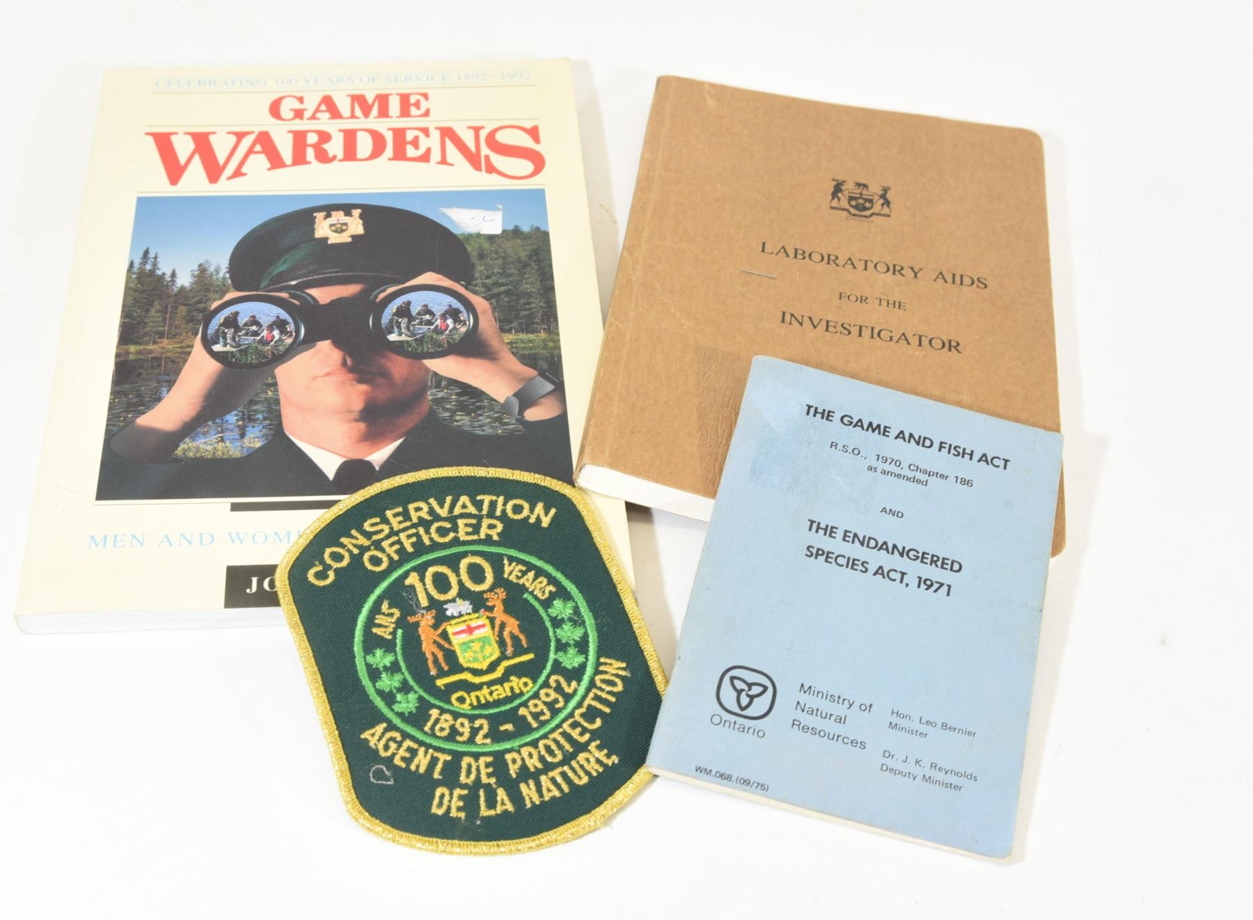 Copy of Laboratory Aids for the investigator. Conservation Officer shoulder badge. The Game and Fish Act, The Endangered Species Act 1971. One copy of Game Wardens, Men and Women in Conservation by Joe Fiser.