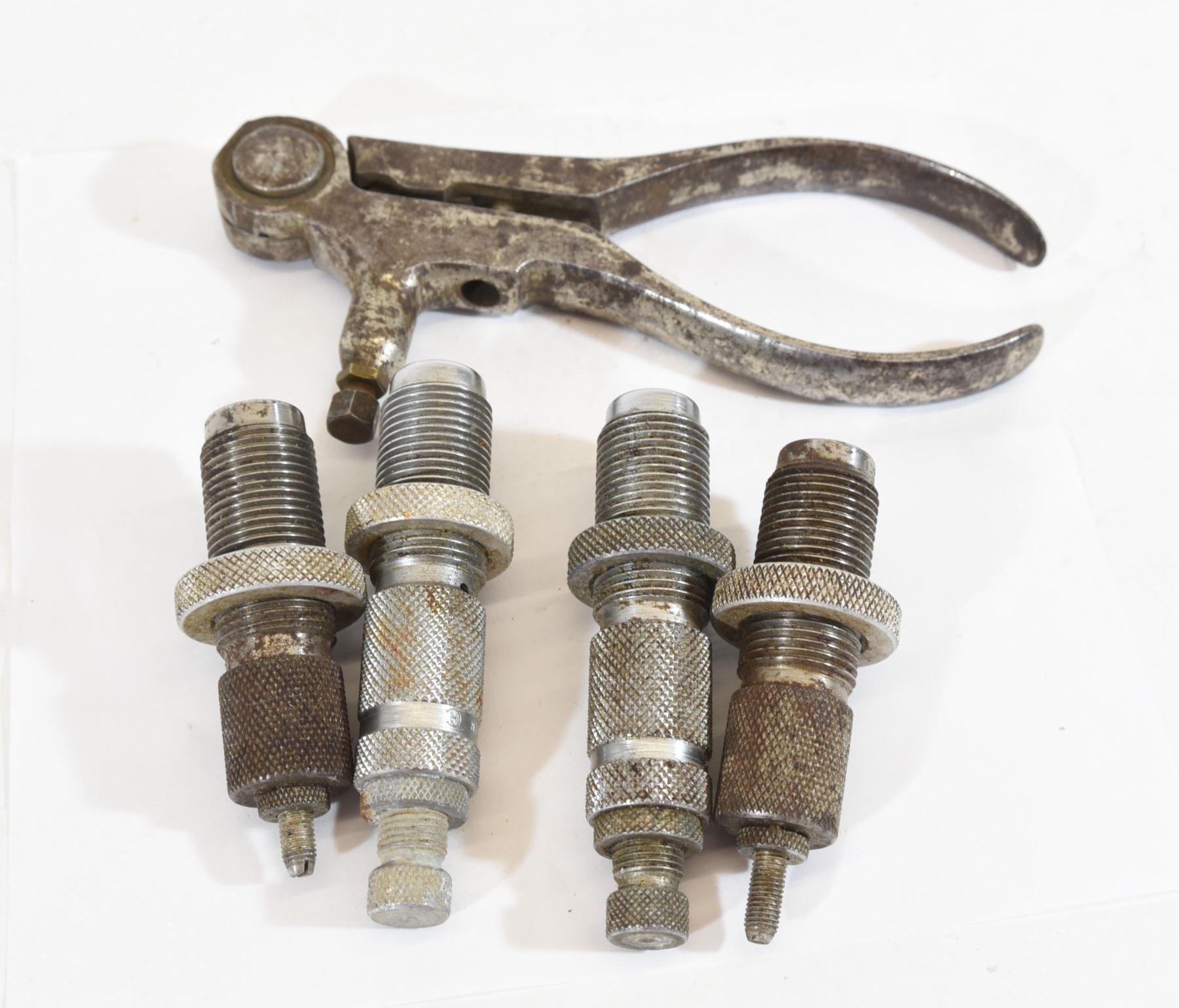 Tong Tool 32 S&W hand loader. 270WCF sizer die. 270WCF seater. Two unknown partial dies (parts).