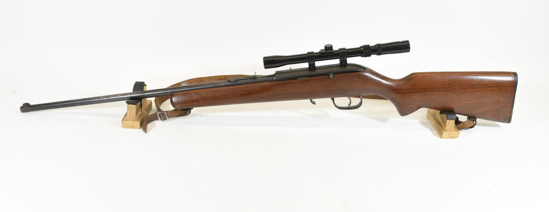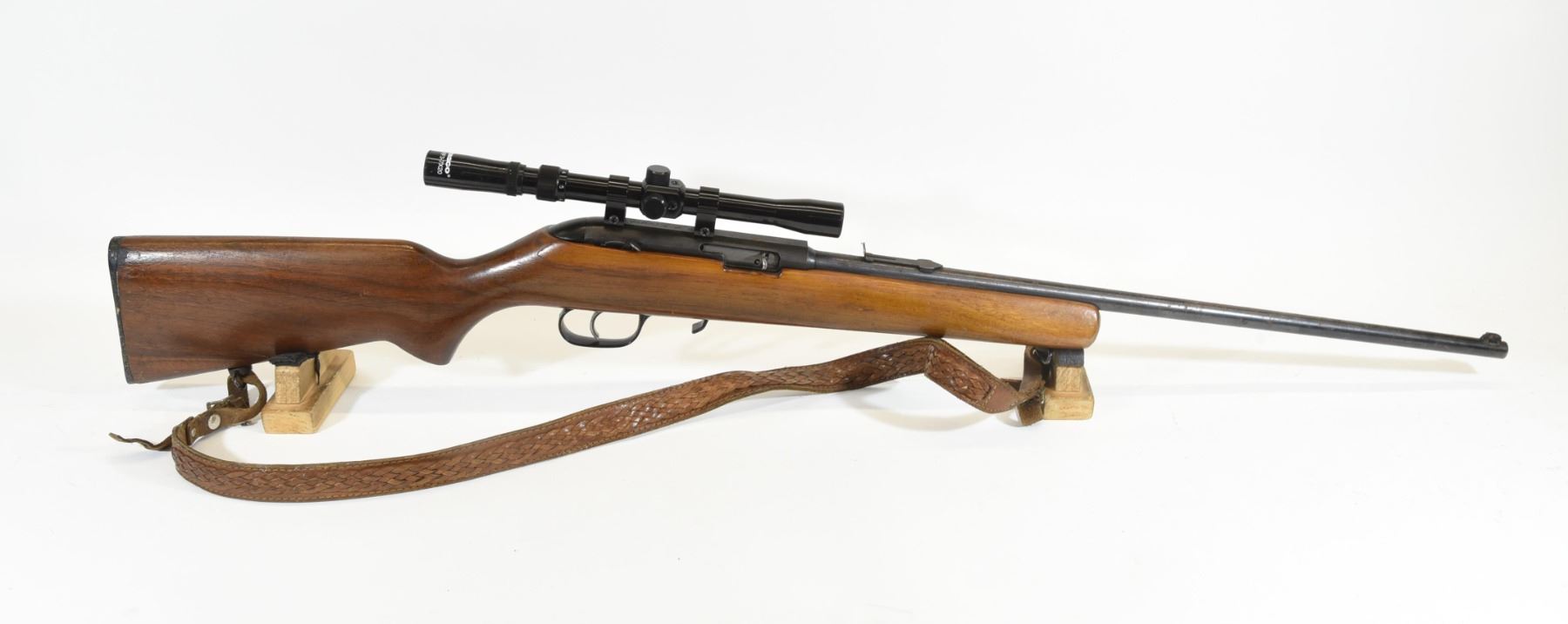 Non-restricted, semi-auto, 22LR, 21.5" barrel, SN 28721-B. Wood stock has many dents and scratches with fading finish on the right side and chips in the finish on the left side as well as one large crack on the right side near the back of the action. Bluing is going grey and speckled with rust throughout. Previous owner engraved his name on top of the action underneath the scope. Bore is good. Rifle has Tasco RF 3-7x20 scope and leather shoulder sling. No magazine.