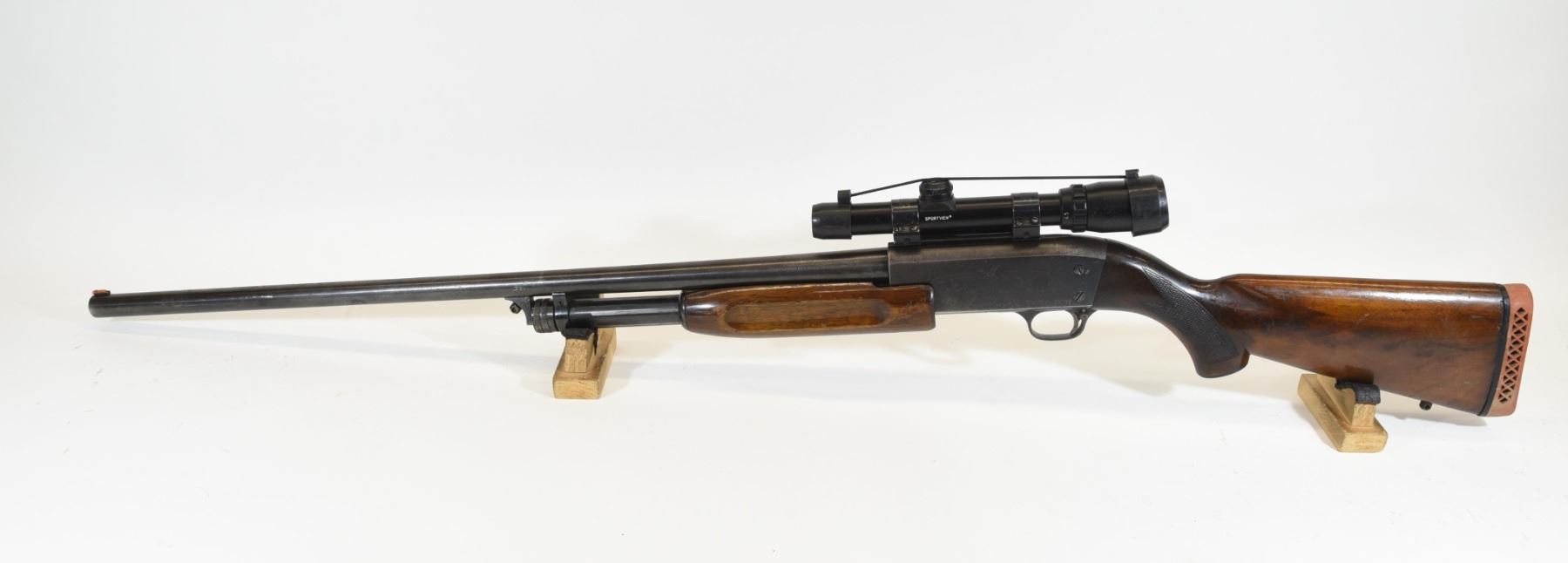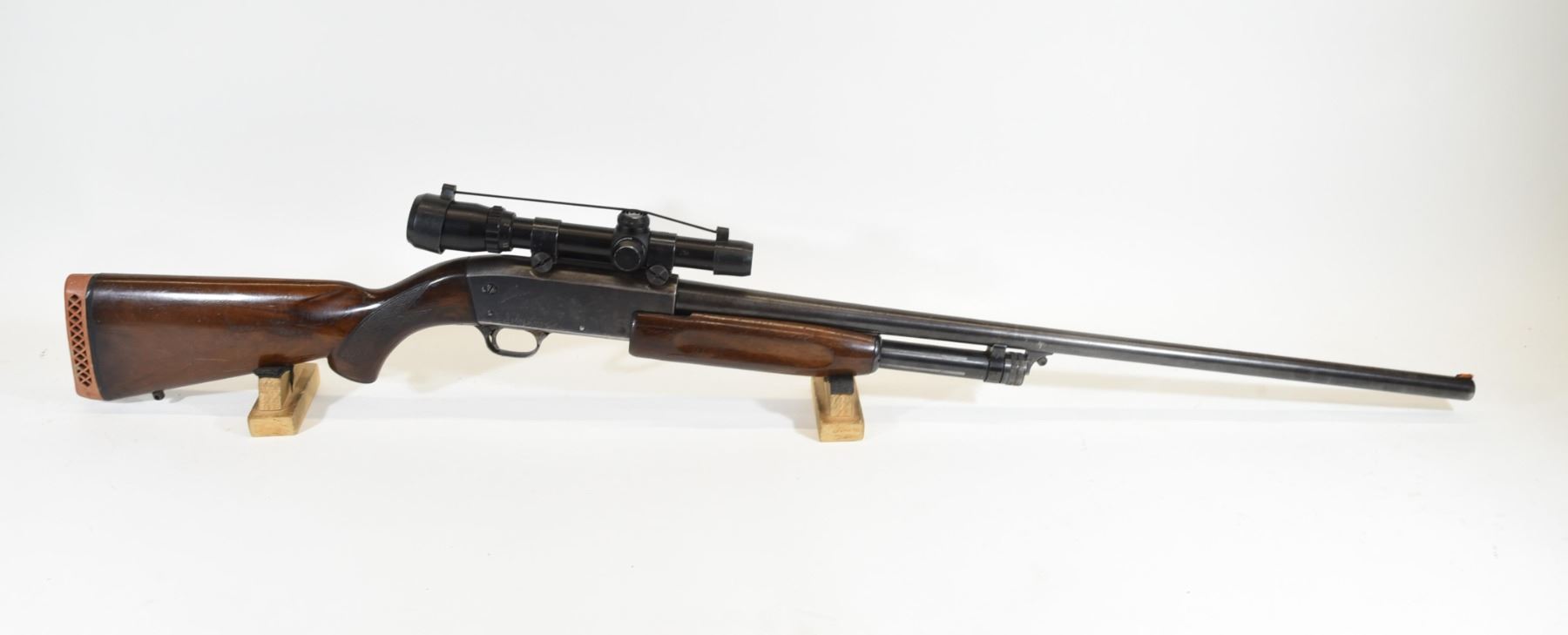 Non-restricted, pump action, 12ga 2 3/4" 27.5" barrel, SN 7852062. Wood stock has many dents and scratches with chips in the finish. Bluing is going brown with many scratches and some light pitting with a speckling of rust. The previous owner engraved his name on both sides of the action. Bore is pitted near the chamber and lightly scratched throughout. Shotgun has Bushnell Sportview 1.5-4.5x20 scope.