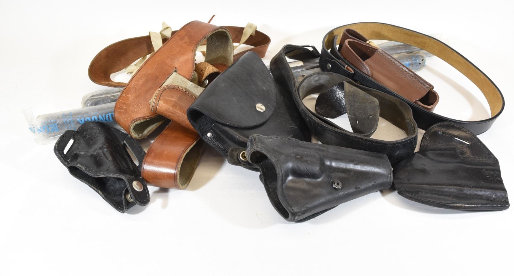 Two 26.5" billy sticks. Three leather pistol holsters. One leather shooting belt with leather holster. Two leather pouches. Two leather belts.