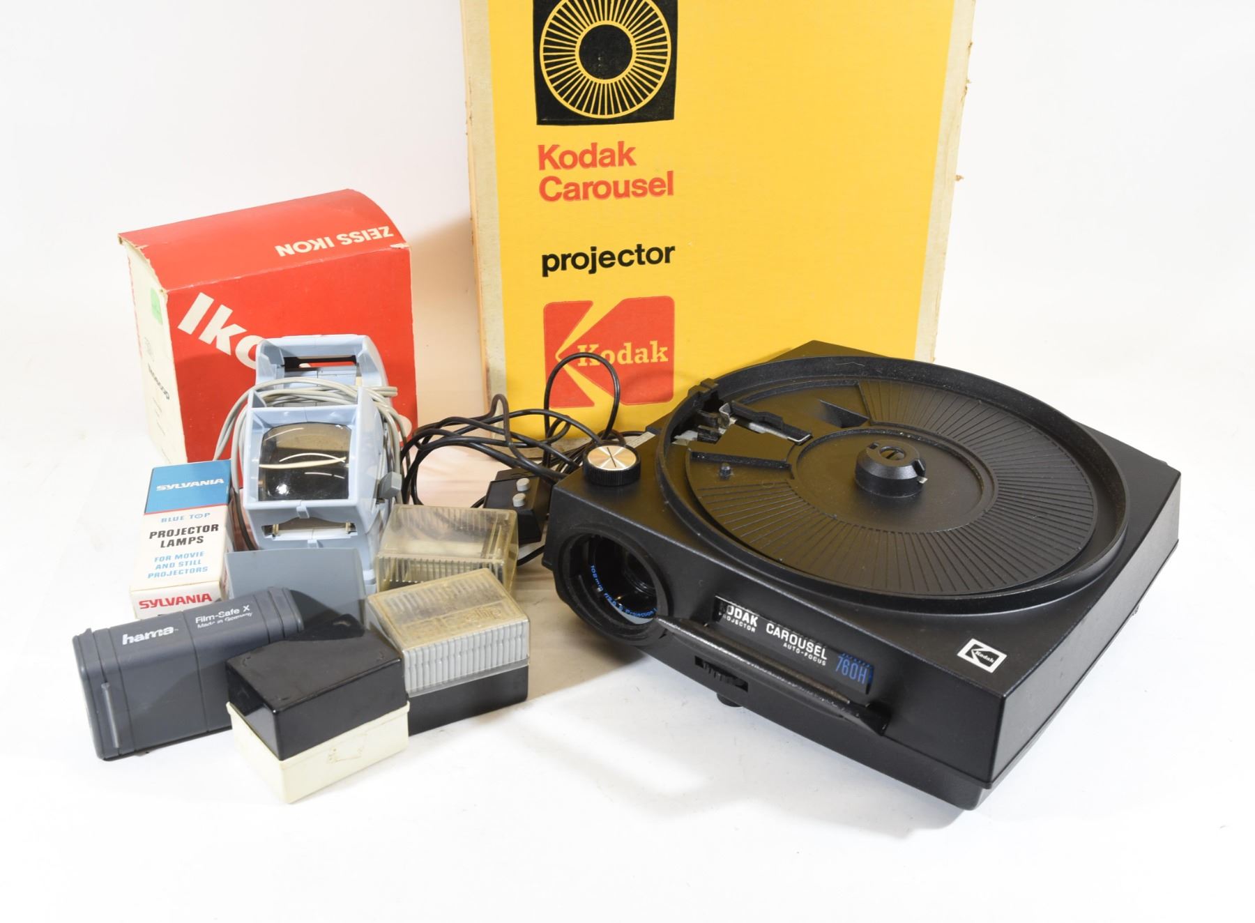 Kodak 760H projector with no carousel, Ikoscop viewer, projector lamp, slide holders.