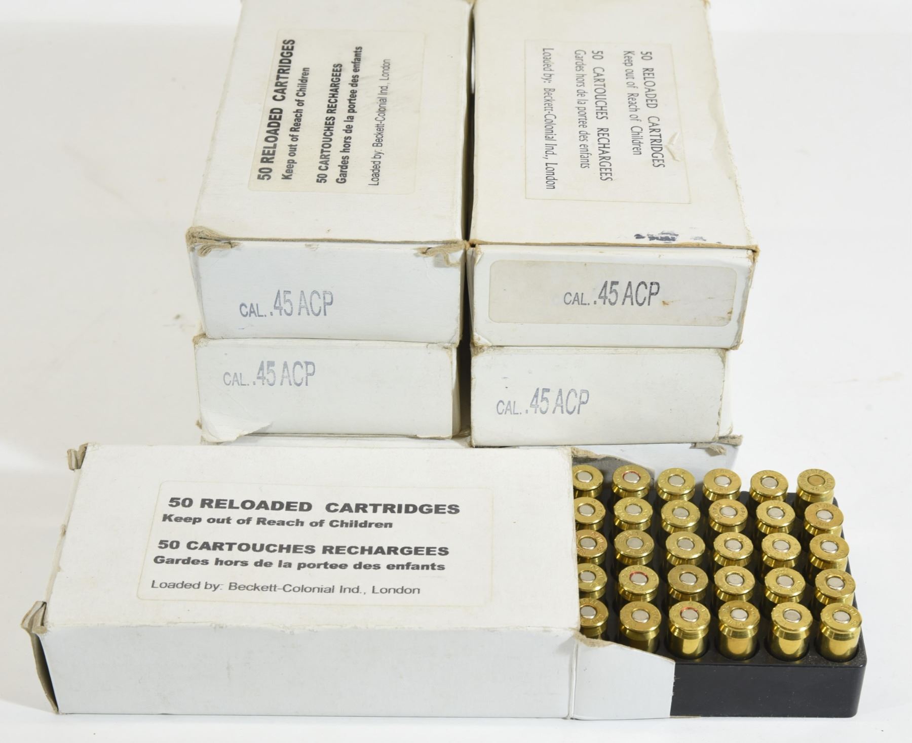 Six 50-round boxes of reloaded 45 ACP. 25 round box of reloaded 45 ACP.